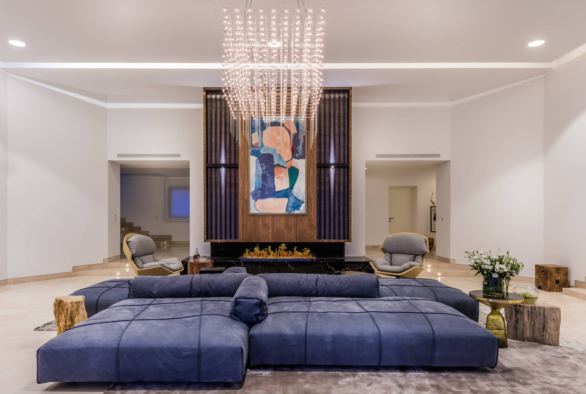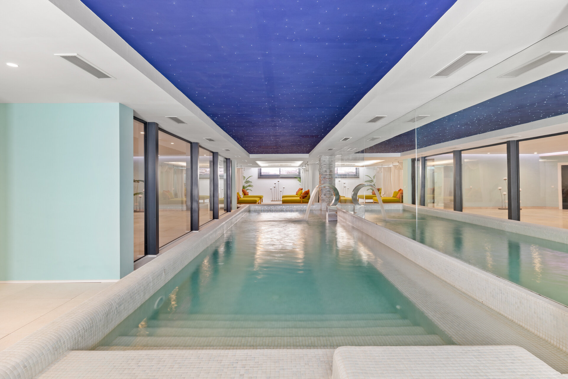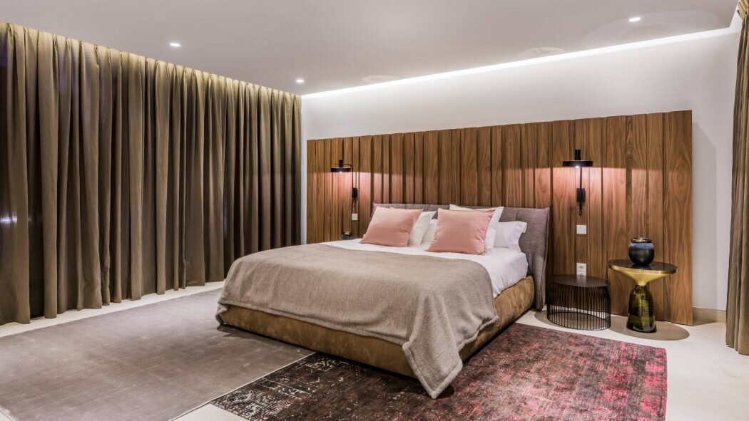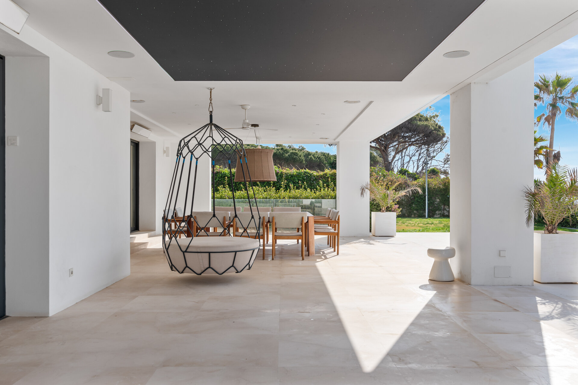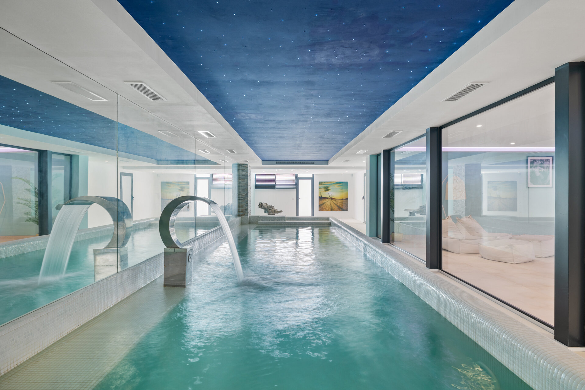 Entertainment spaces are thoughtfully integrated throughout the villa. A private cinema room and games room provide relaxed evenings indoors, while multiple lounges and terraces encourage social time during the day. Wellness and leisure facilities allow the house to adapt easily to different group dynamics.