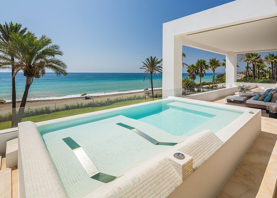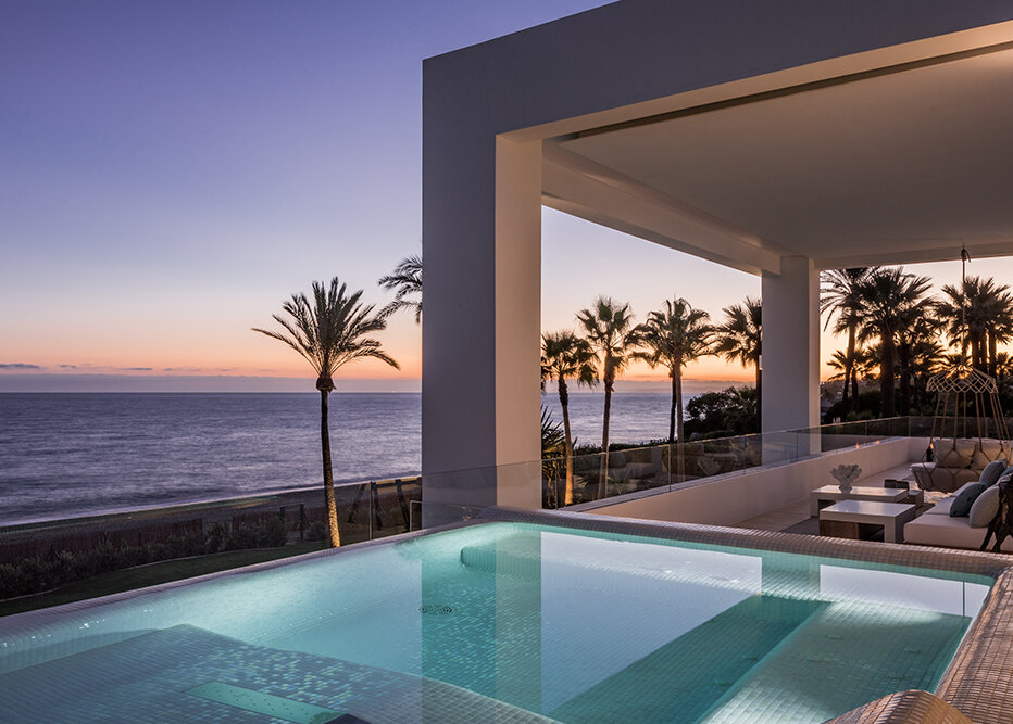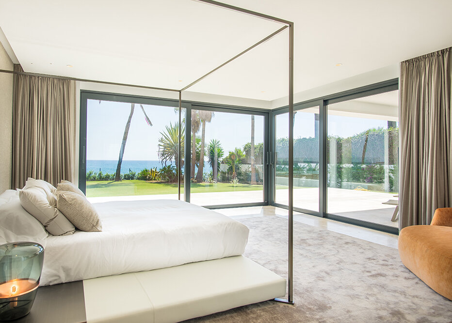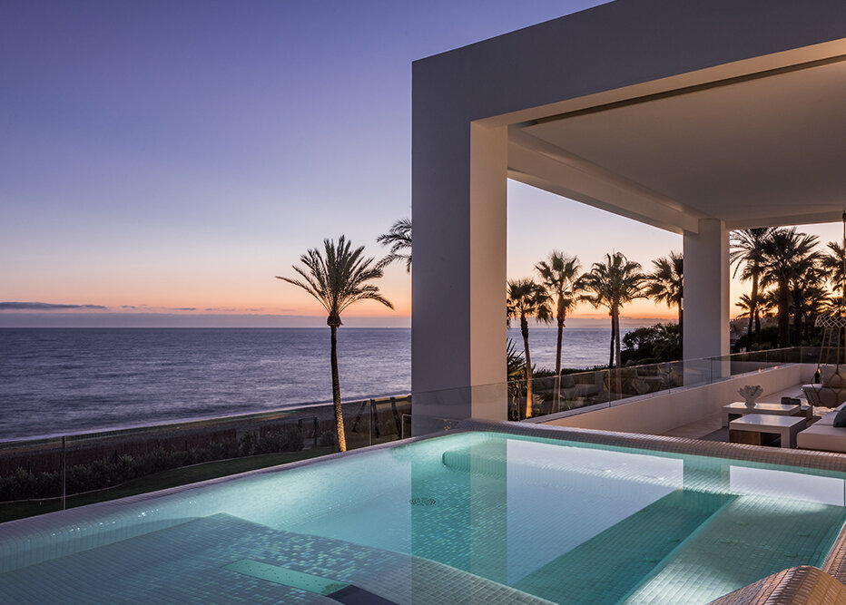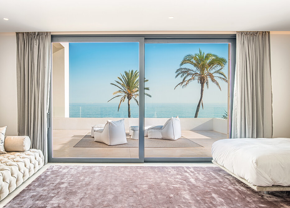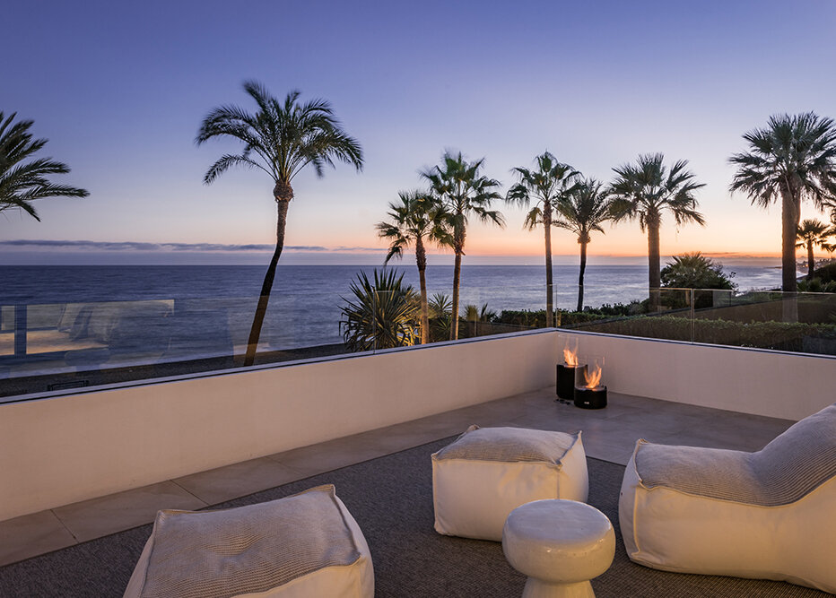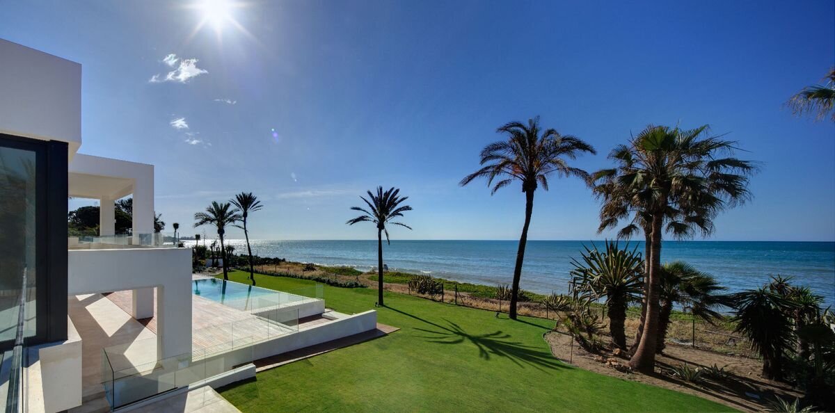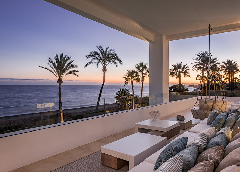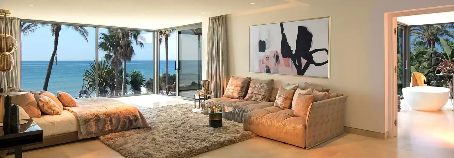 Villa Luminara del Mar is set directly on the beachfront between Marbella and Estepona, offering absolute sea frontage and direct access to the promenade. The location combines privacy with convenience, placing beach clubs, golf courses, and dining within easy reach. Marbella and Puerto Banús are approximately fifteen minutes away by car.