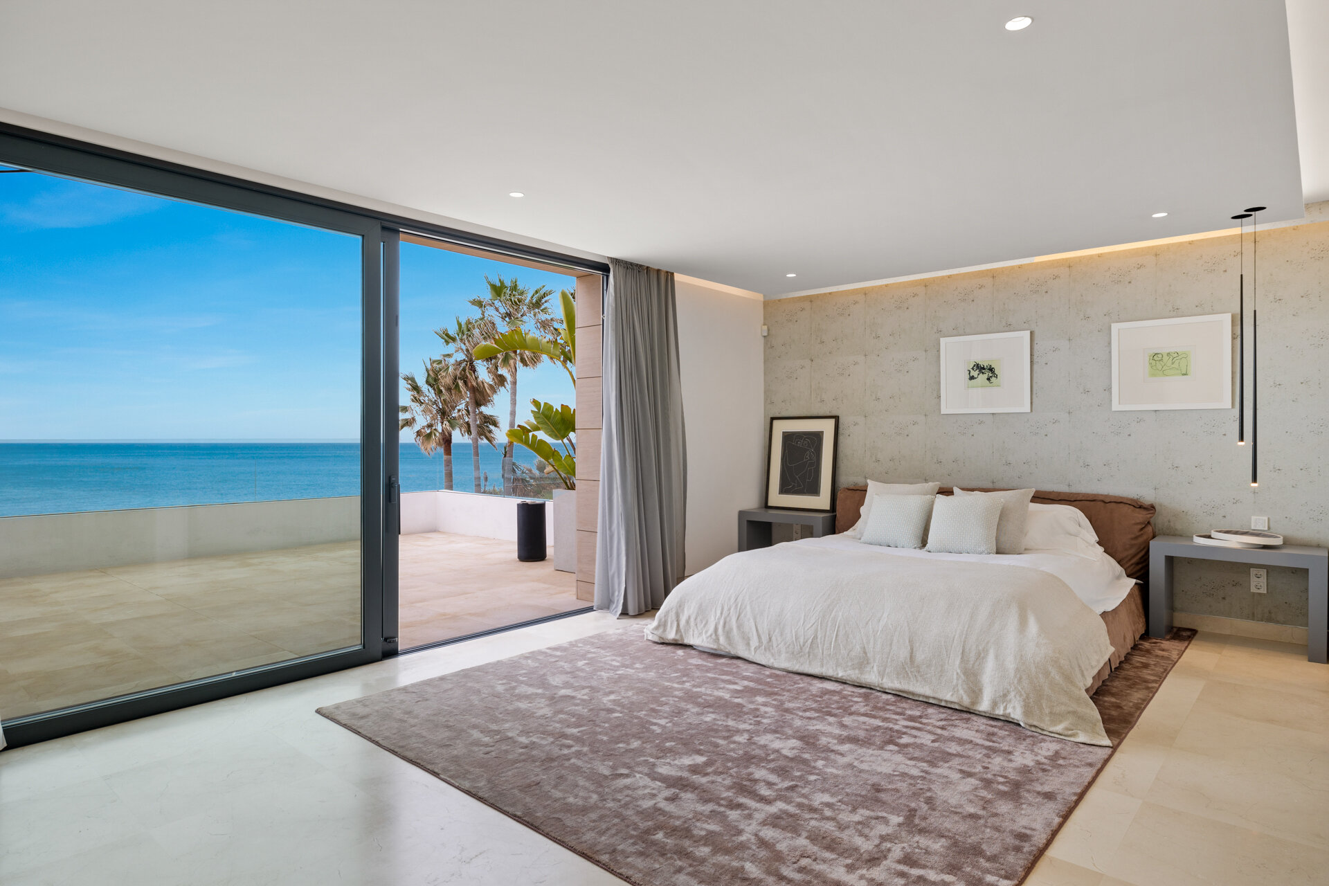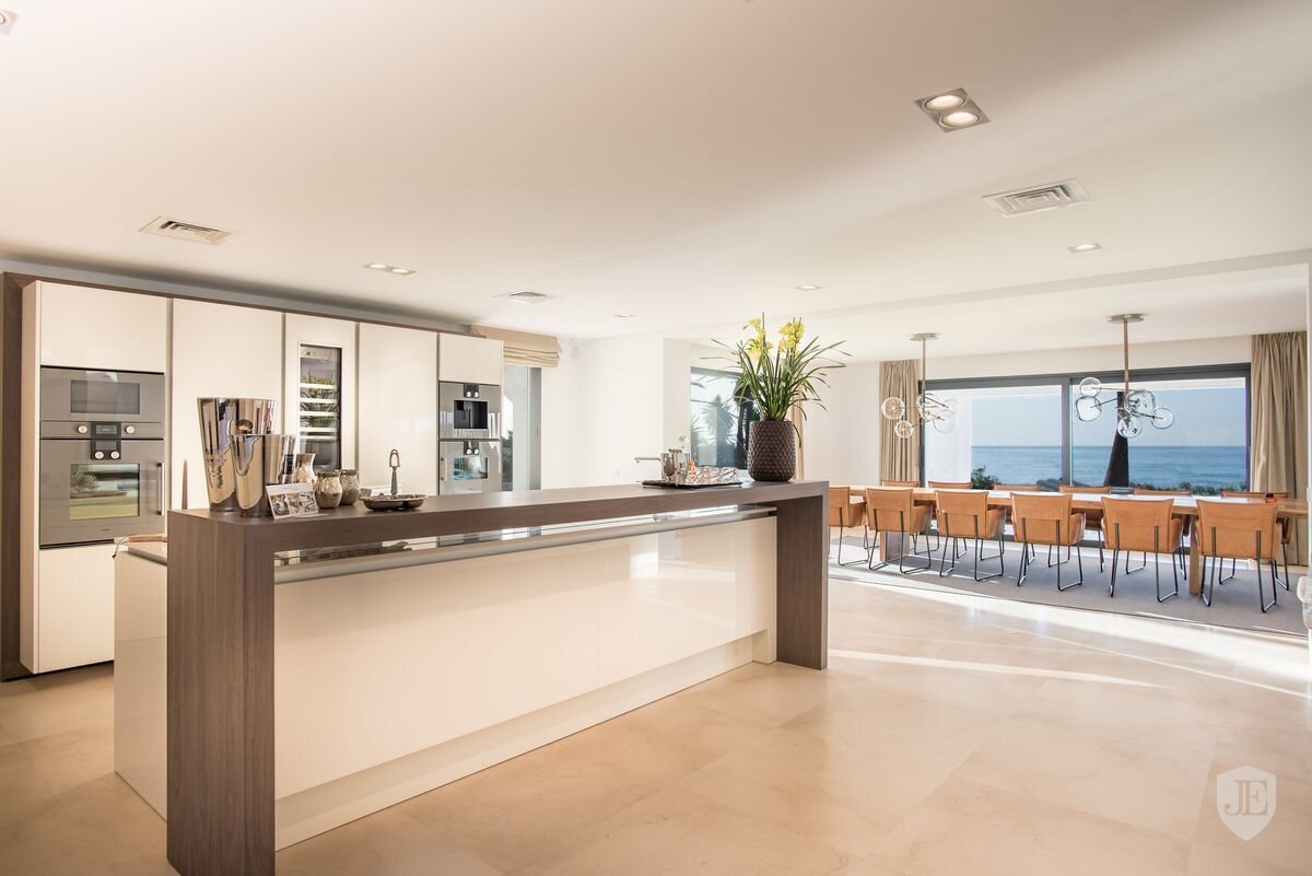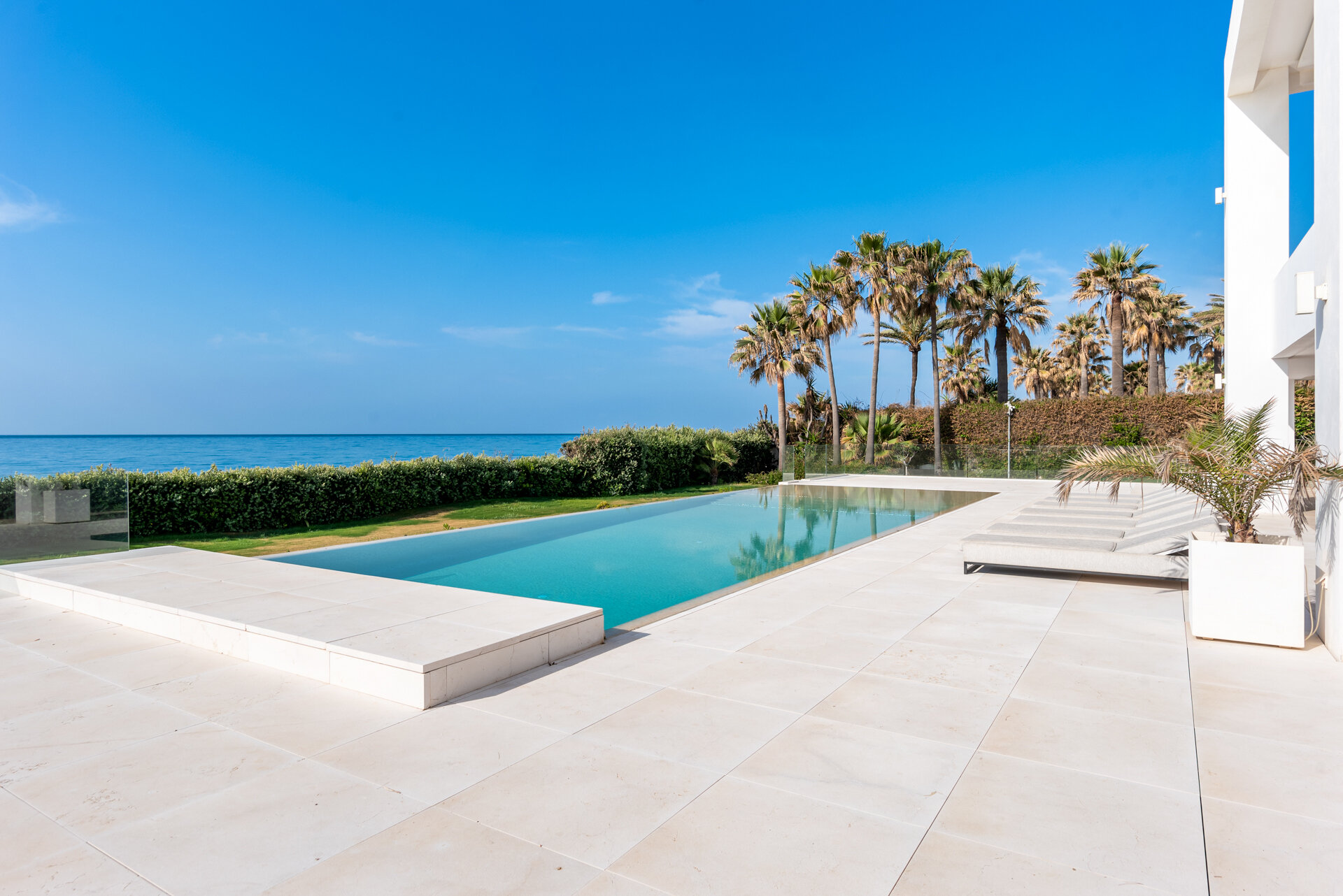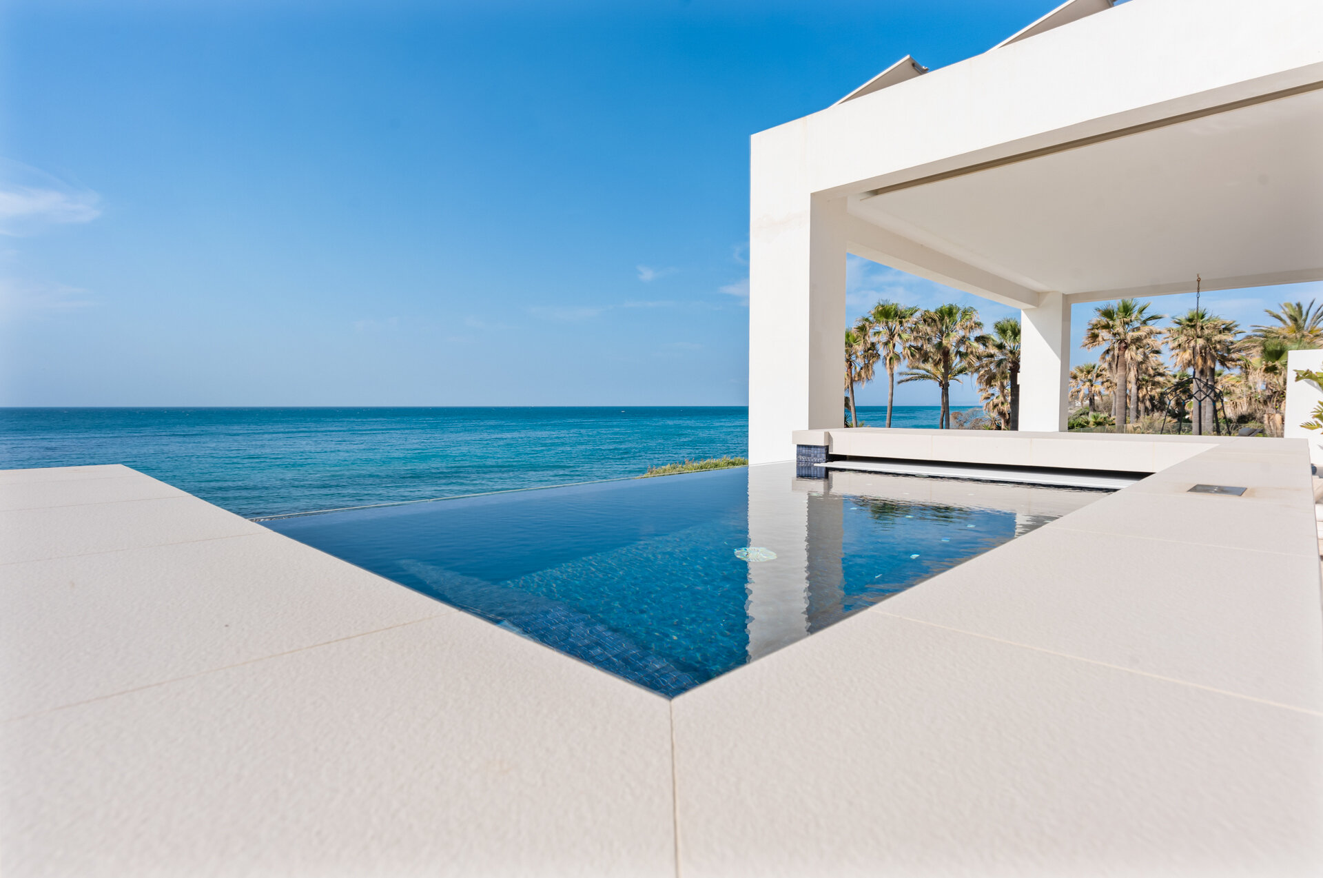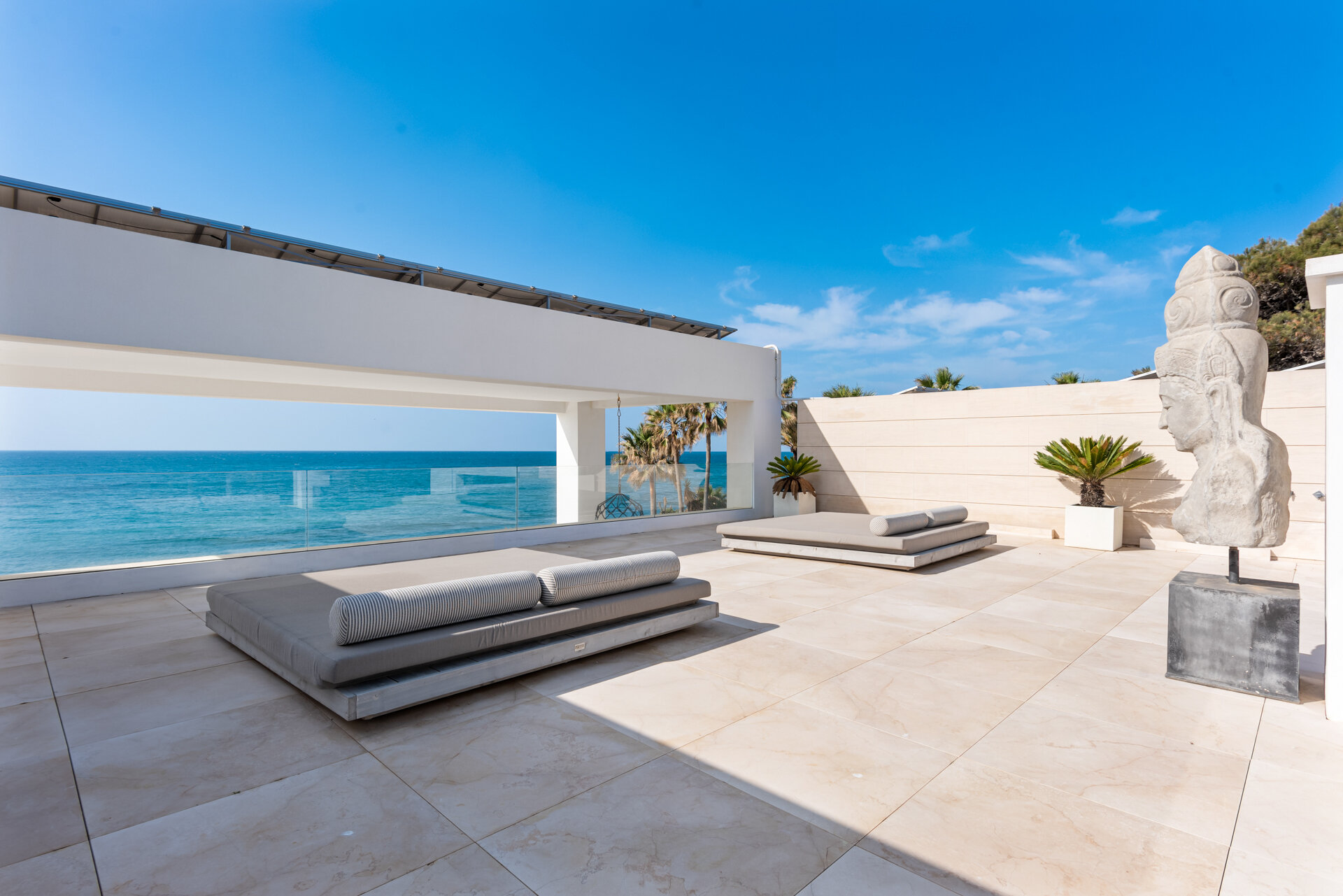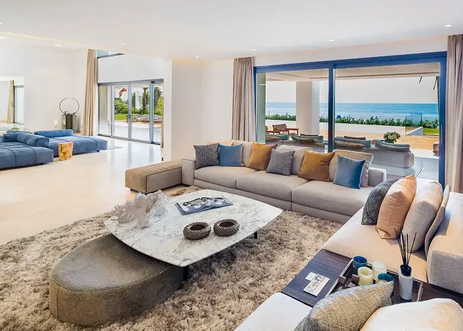 Villa Luminara del Mar is set directly on the beachfront between Marbella and Estepona, offering absolute sea frontage and direct access to the promenade. The location combines privacy with convenience, placing beach clubs, golf courses, and dining within easy reach. Marbella and Puerto Banús are approximately fifteen minutes away by car.