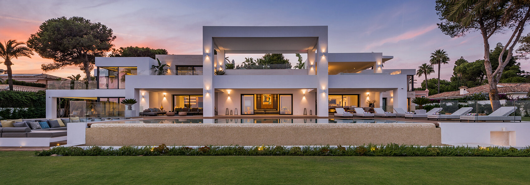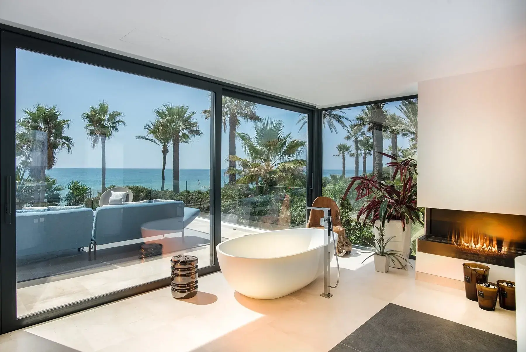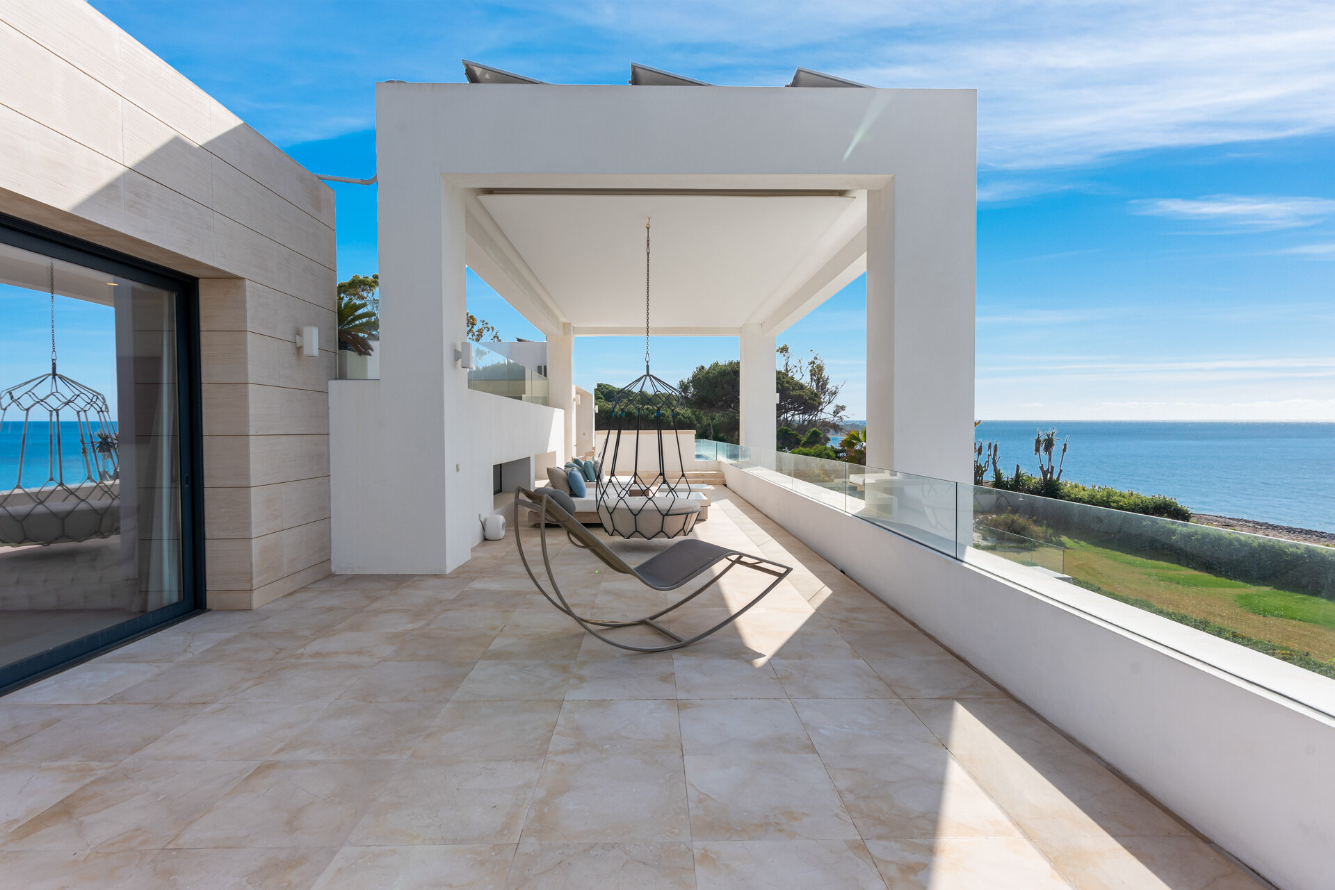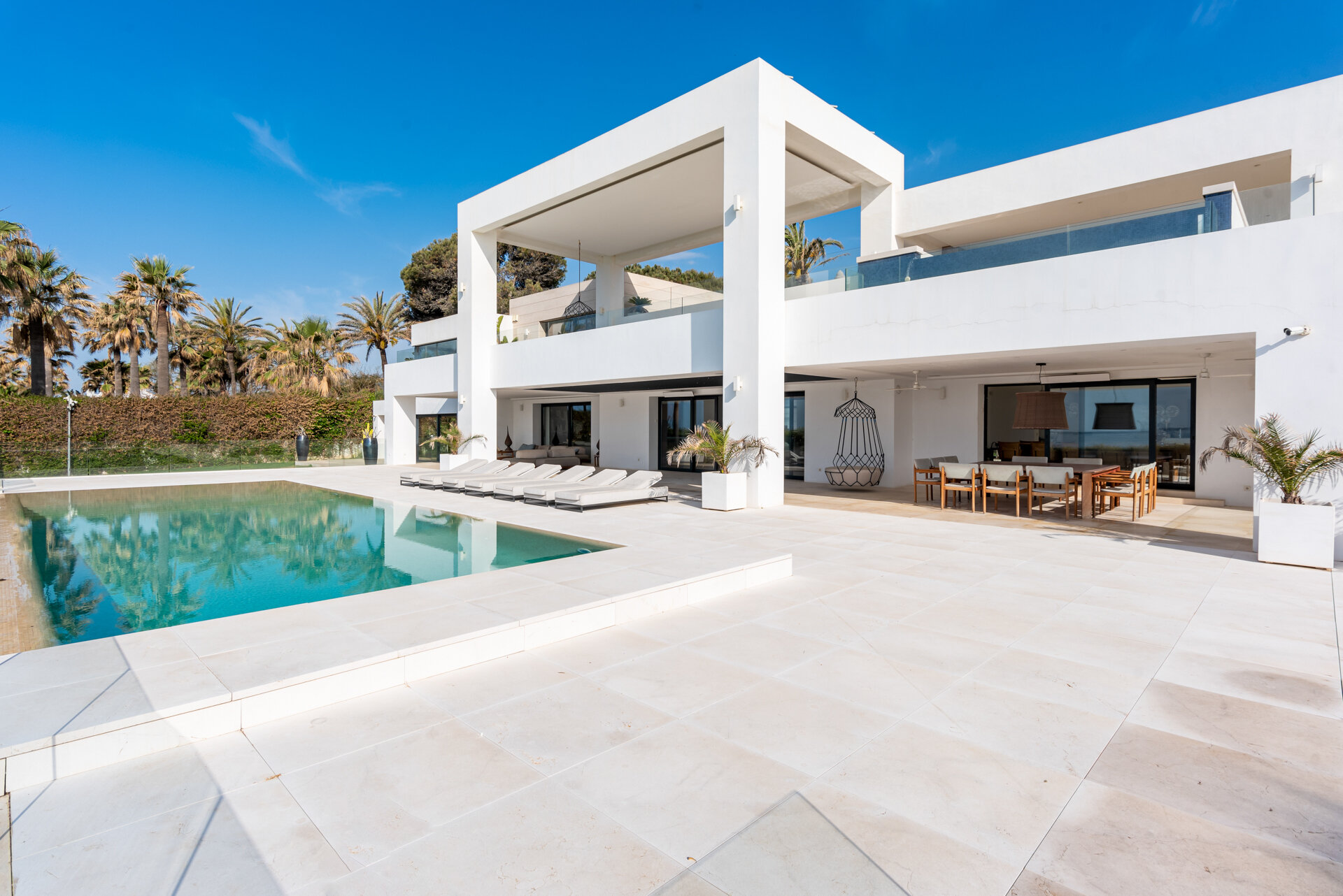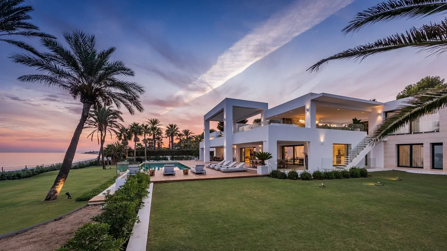 Villa Luminara del Mar is set directly on the beachfront between Marbella and Estepona, offering absolute sea frontage and direct access to the promenade. The location combines privacy with convenience, placing beach clubs, golf courses, and dining within easy reach. Marbella and Puerto Banús are approximately fifteen minutes away by car.