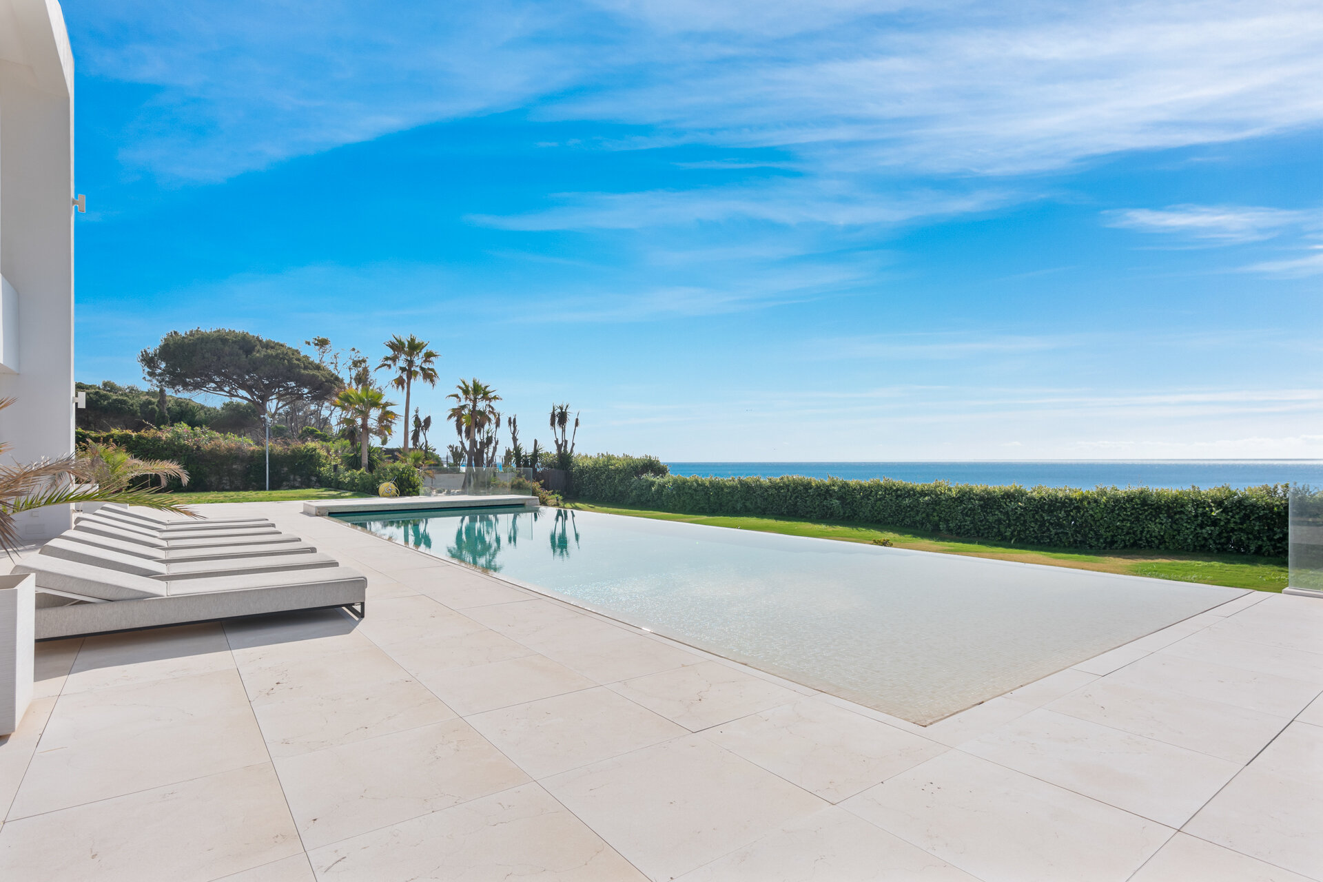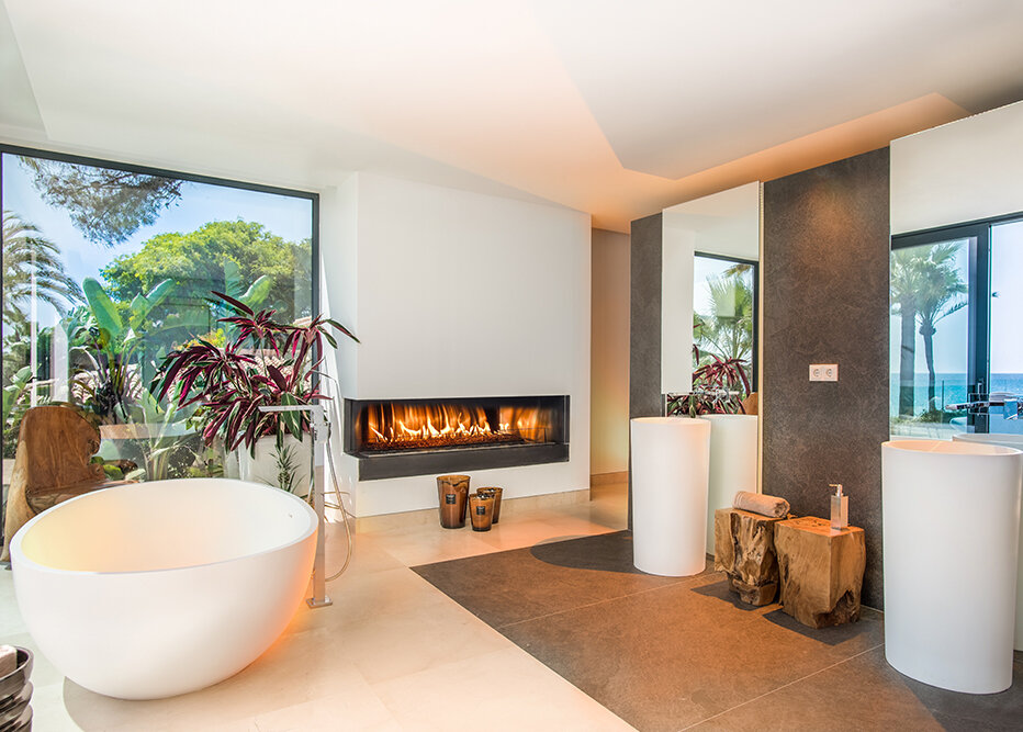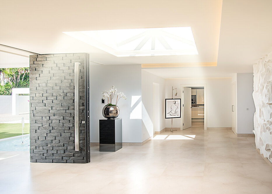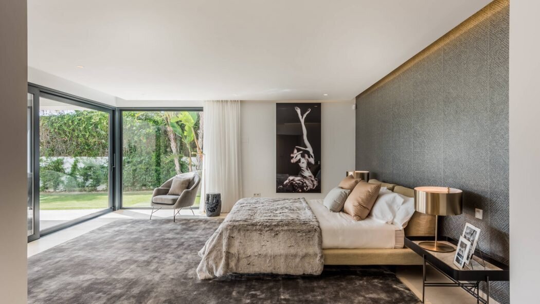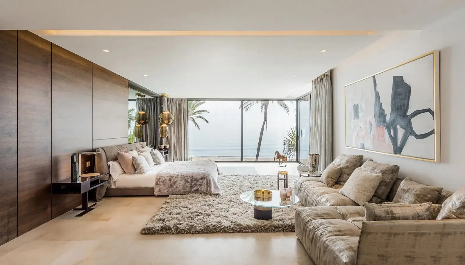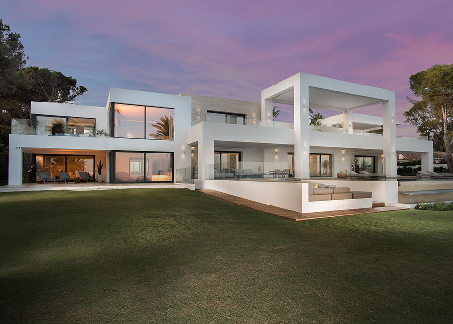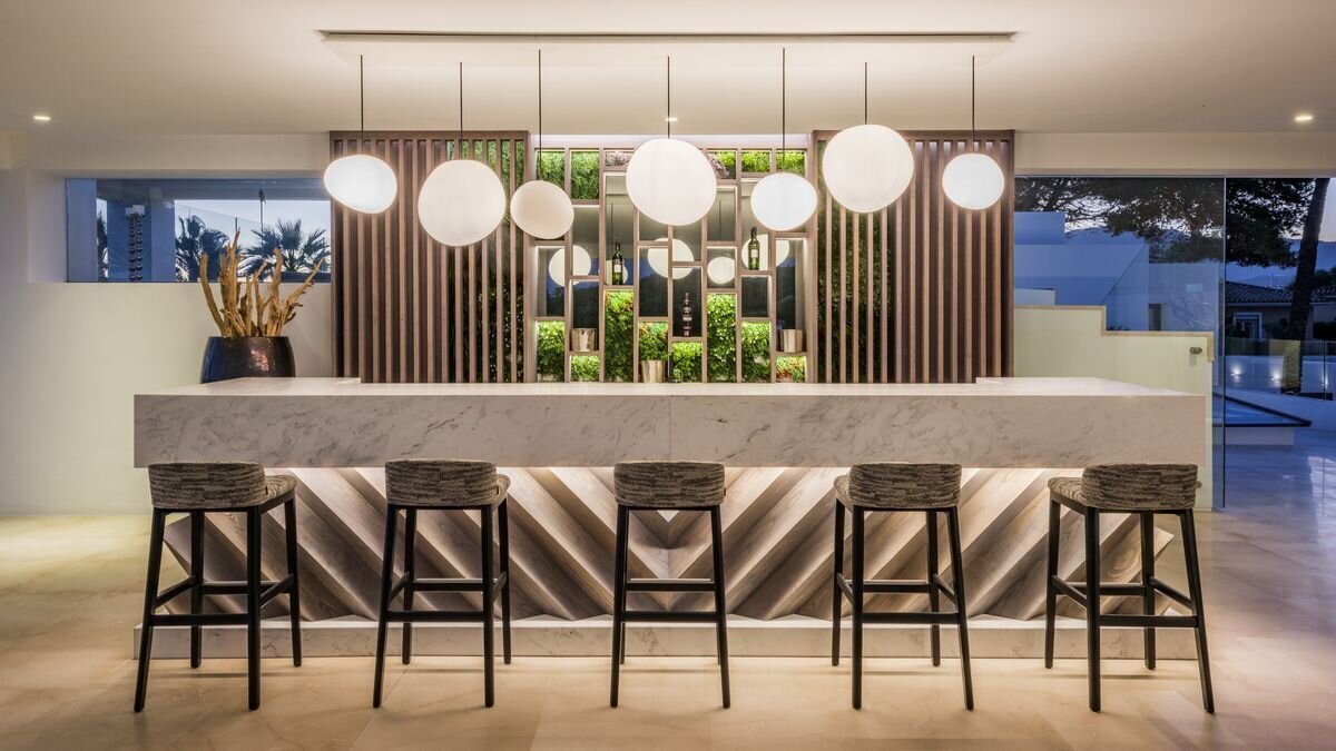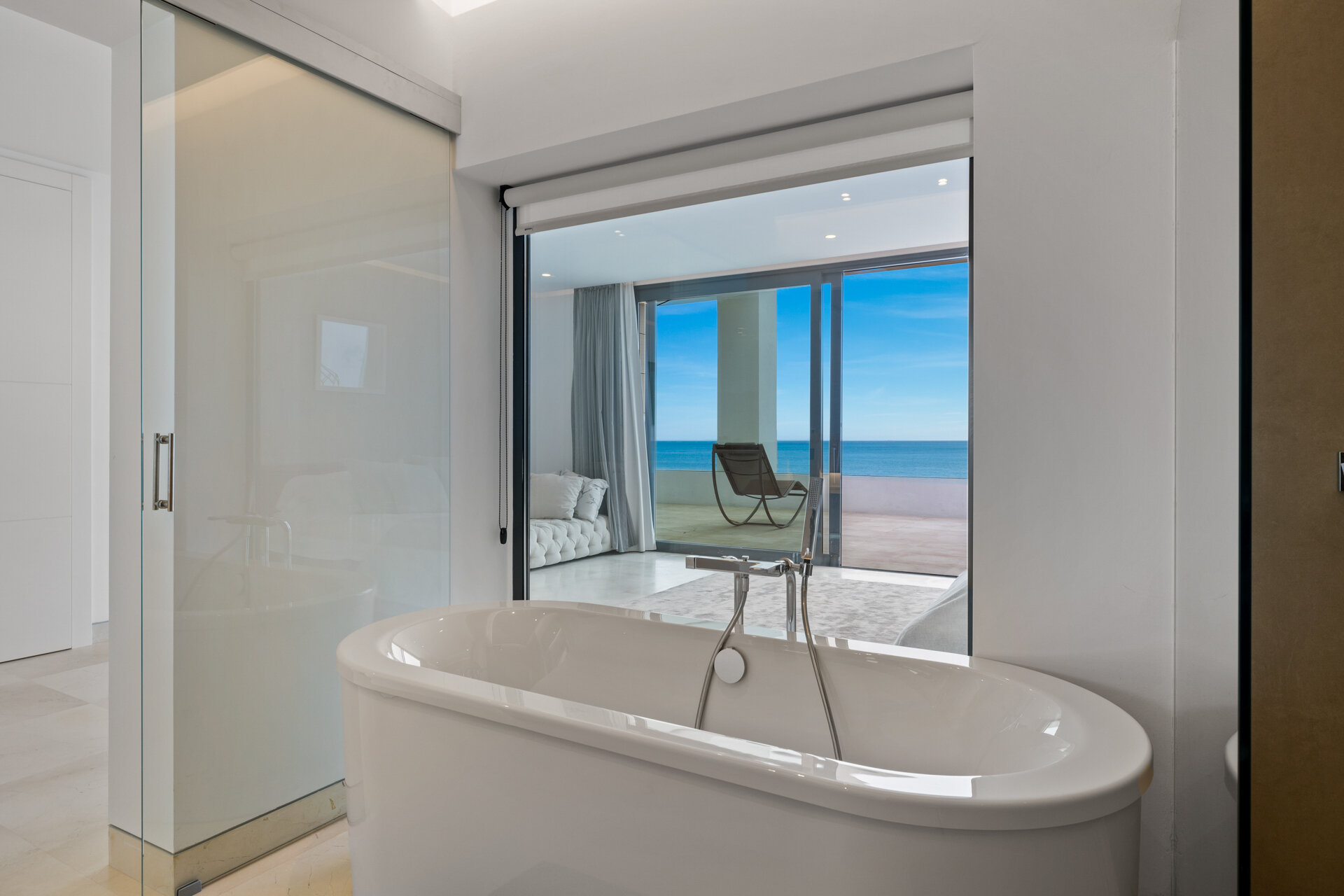 Villa Luminara del Mar is set directly on the beachfront between Marbella and Estepona, offering absolute sea frontage and direct access to the promenade. The location combines privacy with convenience, placing beach clubs, golf courses, and dining within easy reach. Marbella and Puerto Banús are approximately fifteen minutes away by car.