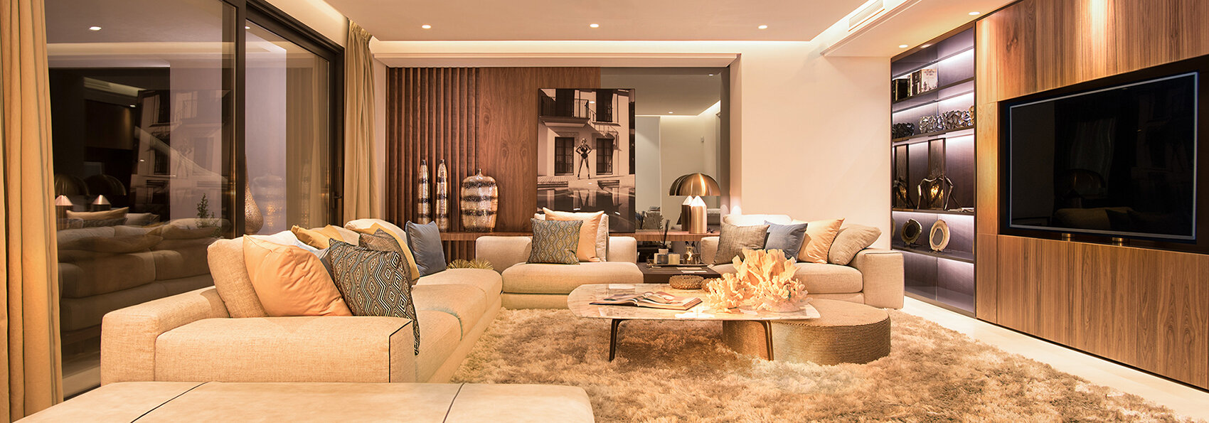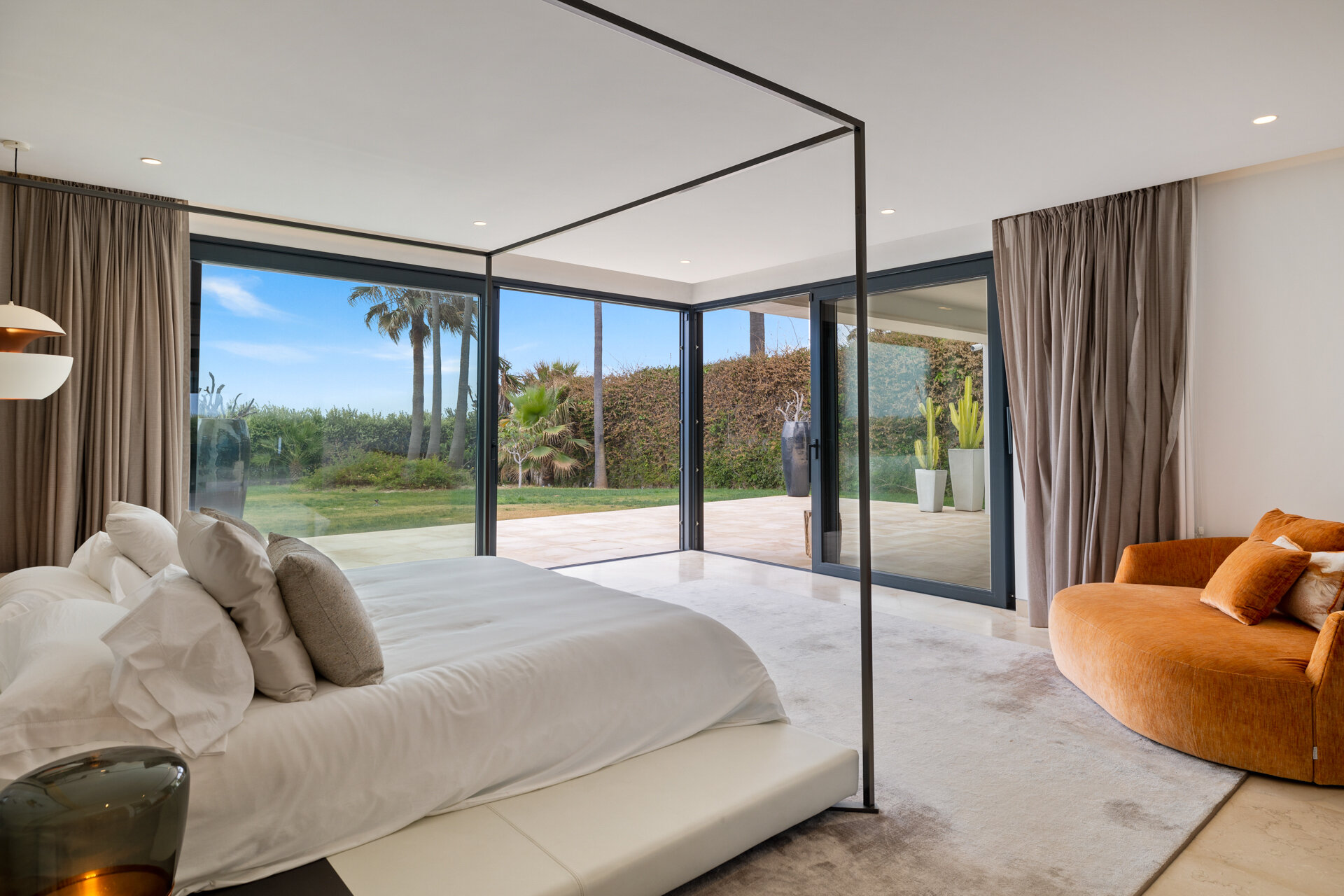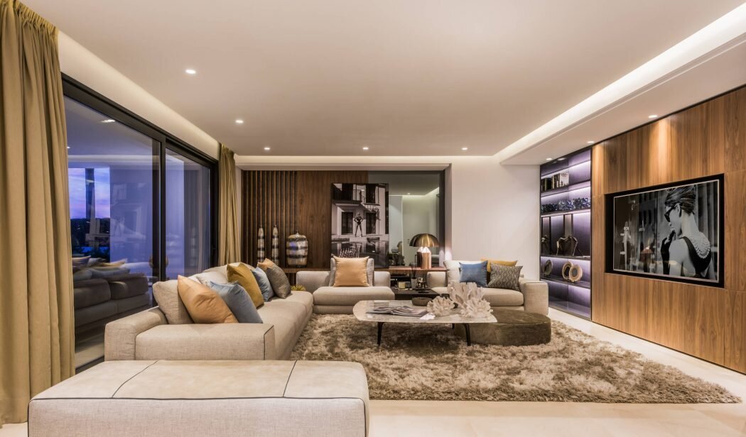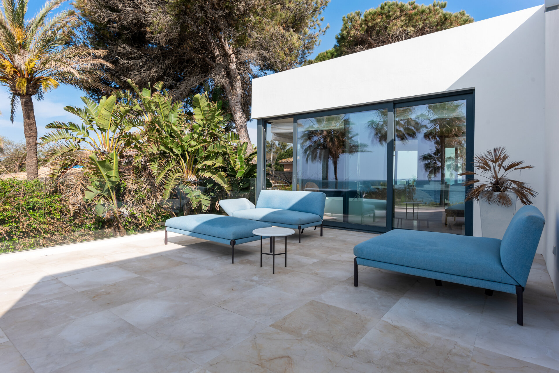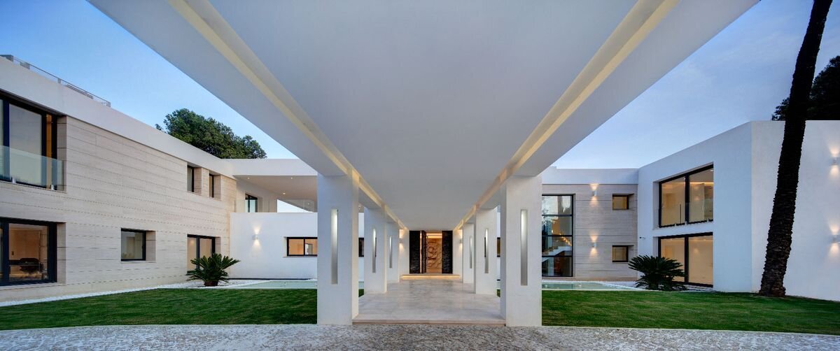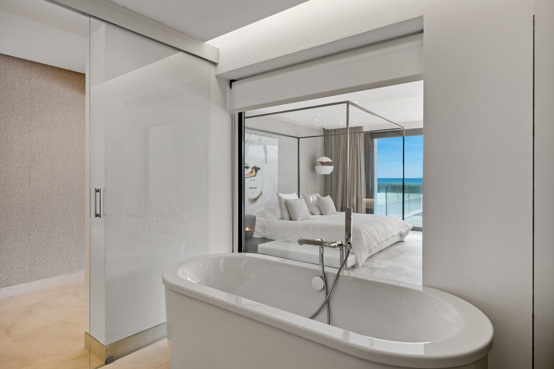 Villa Luminara del Mar is set directly on the beachfront between Marbella and Estepona, offering absolute sea frontage and direct access to the promenade. The location combines privacy with convenience, placing beach clubs, golf courses, and dining within easy reach. Marbella and Puerto Banús are approximately fifteen minutes away by car.