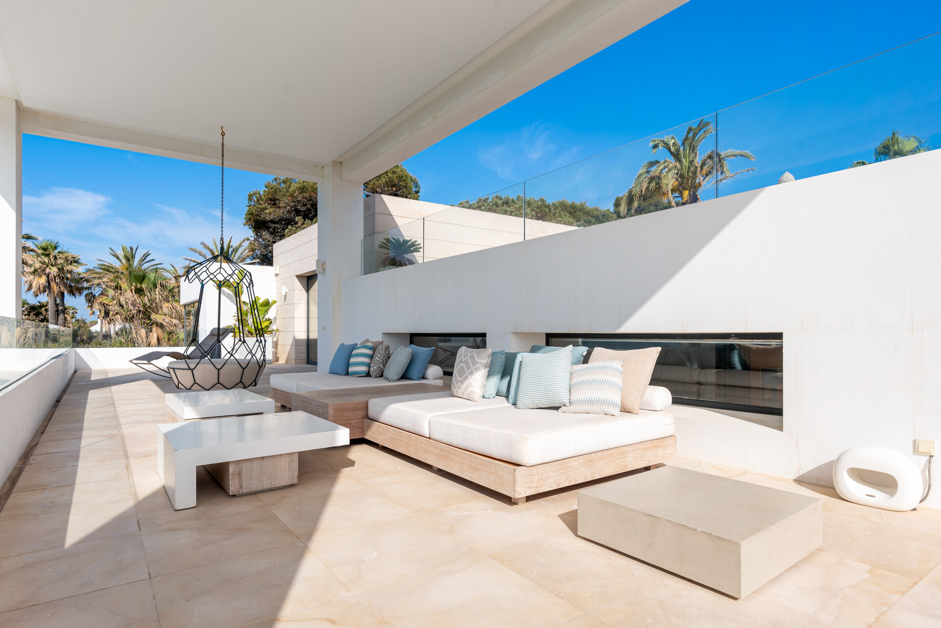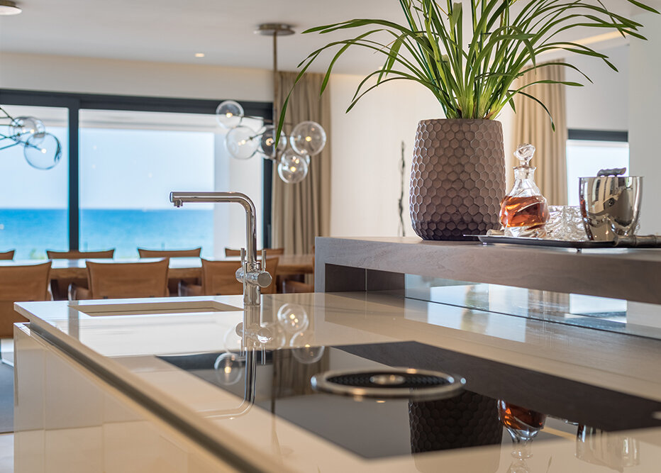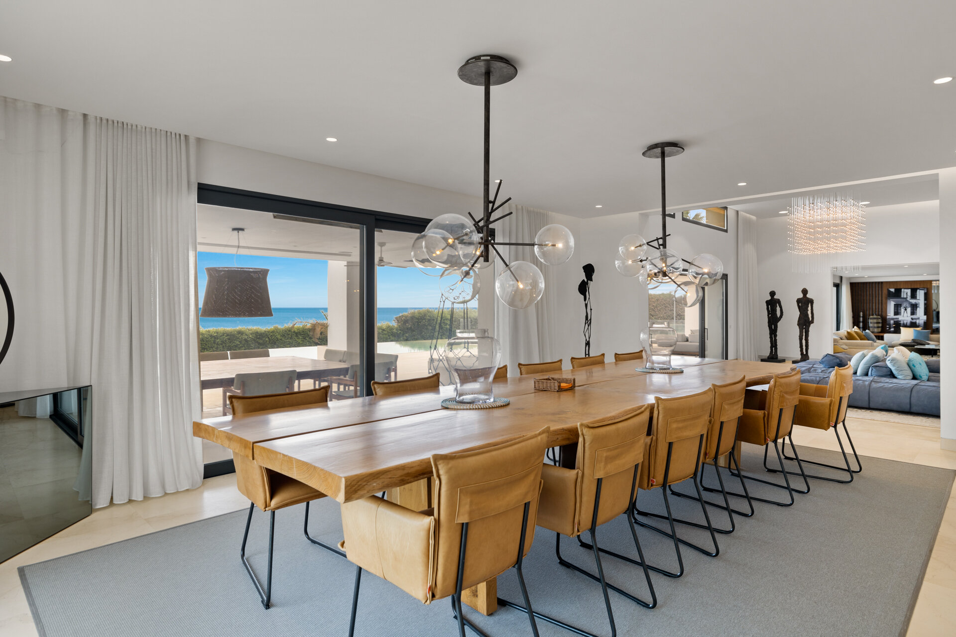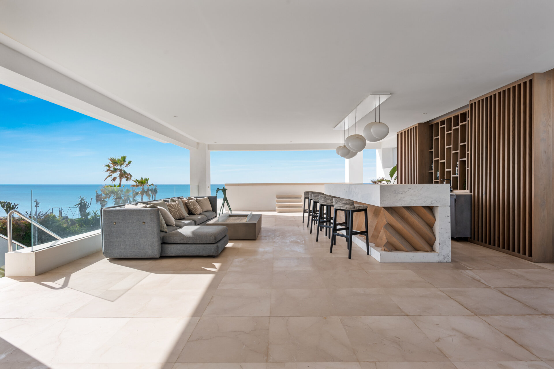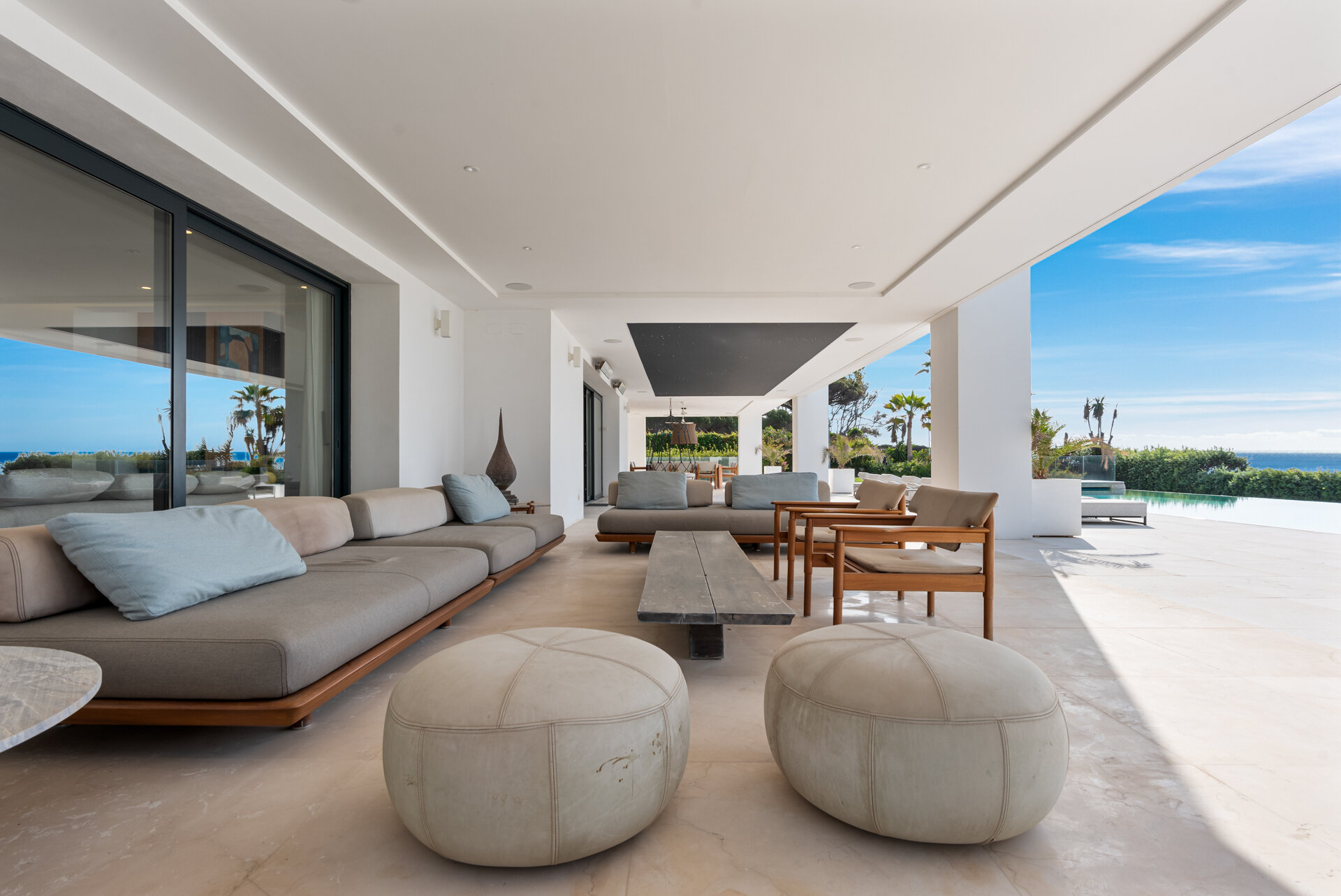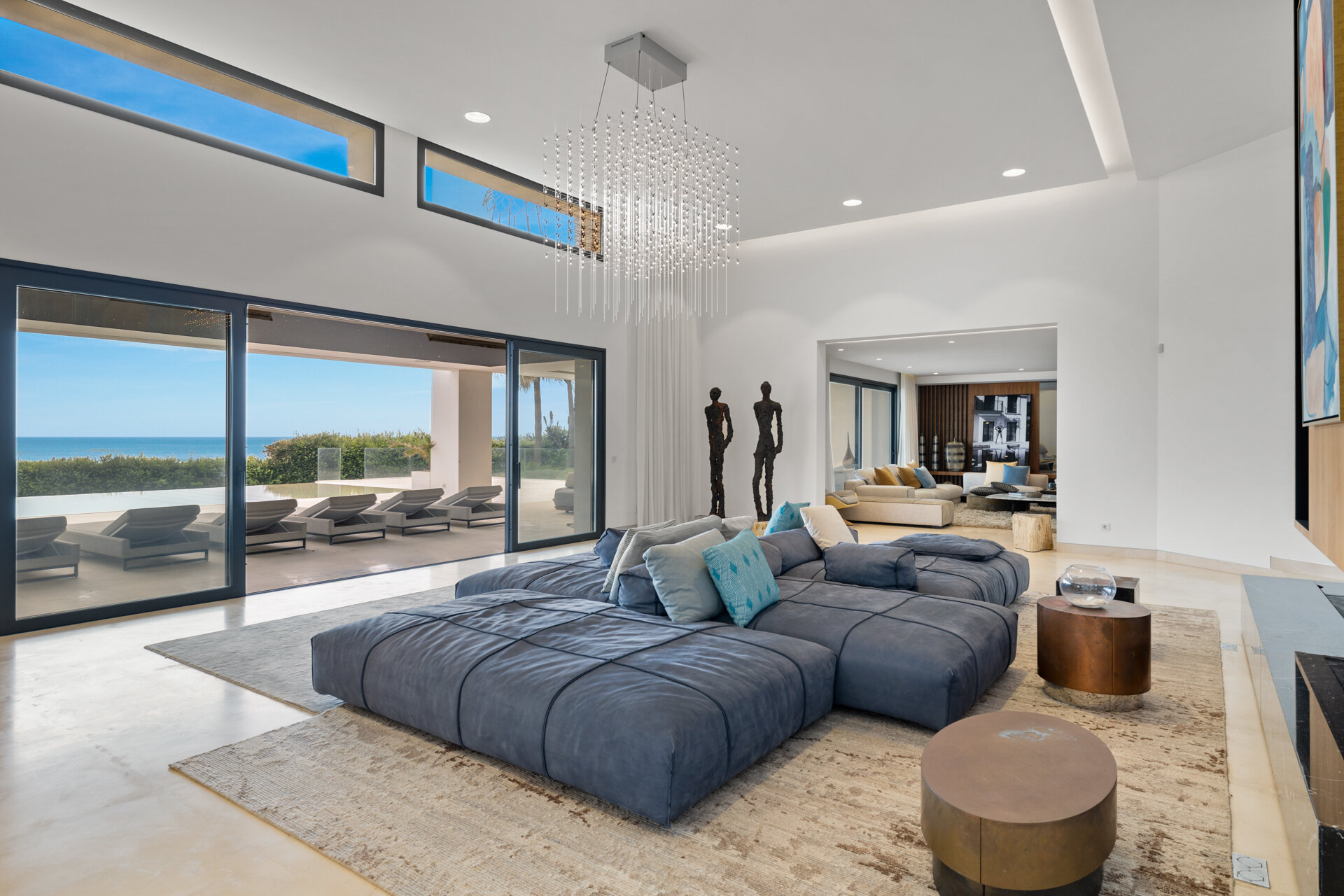 Villa Luminara del Mar is defined by light, scale, and uninterrupted sea views. Expansive open plan living areas flow effortlessly through floor to ceiling glazing onto terraces and gardens, creating a seamless indoor outdoor lifestyle. Clean architectural lines, natural finishes, and generous proportions give the spaces a calm, contemporary feel, equally suited to relaxed family living or larger gatherings.