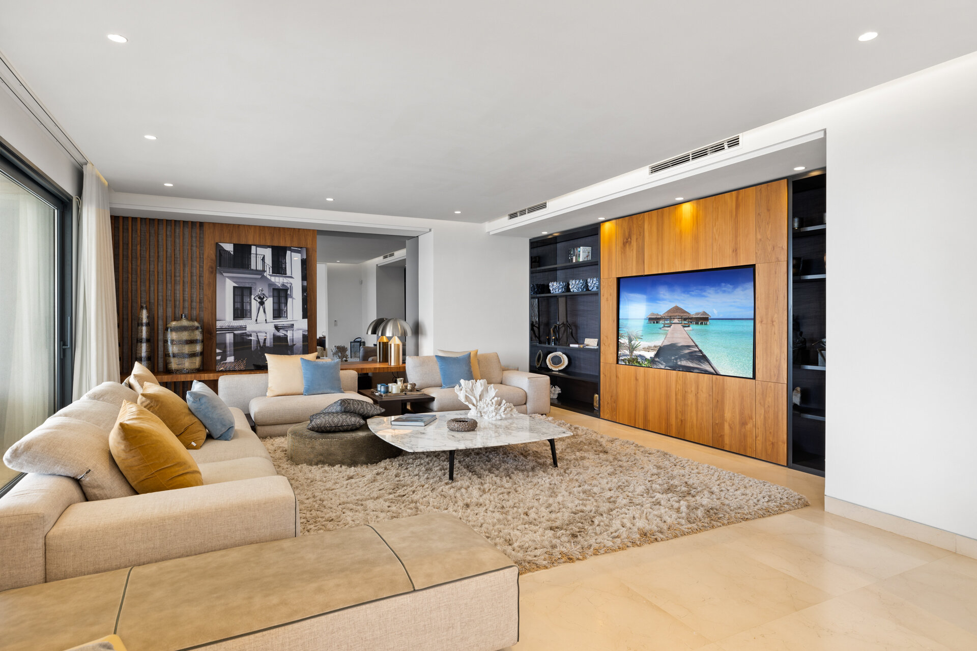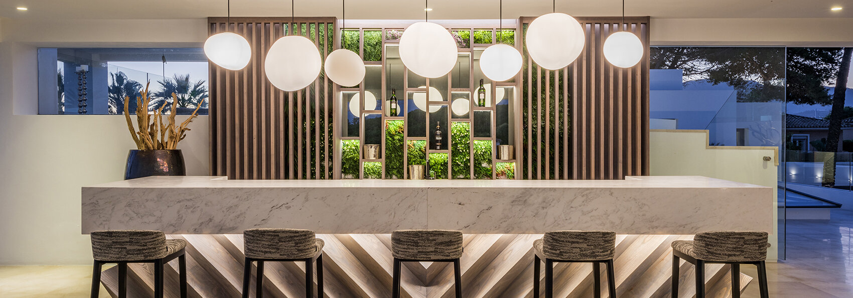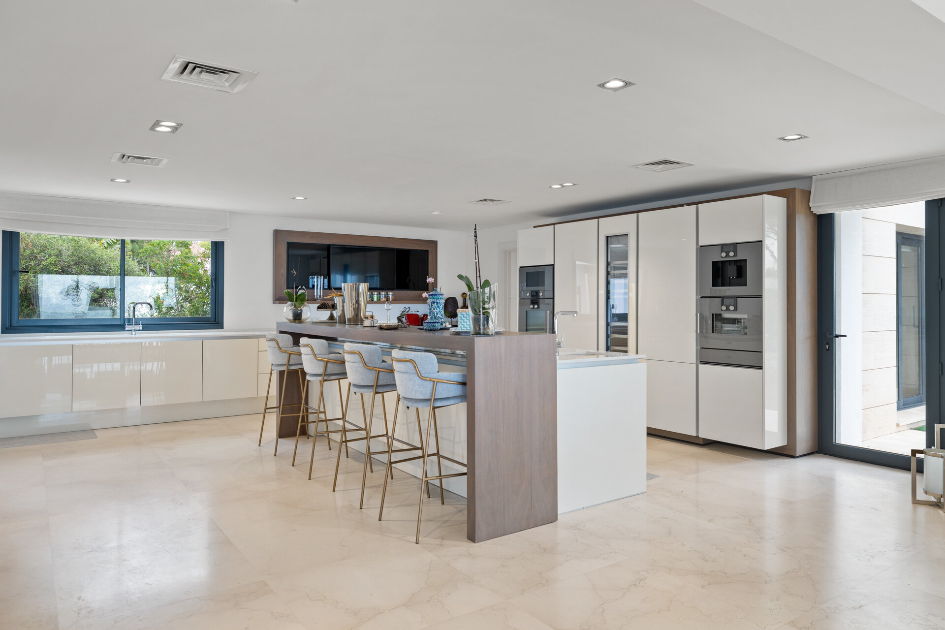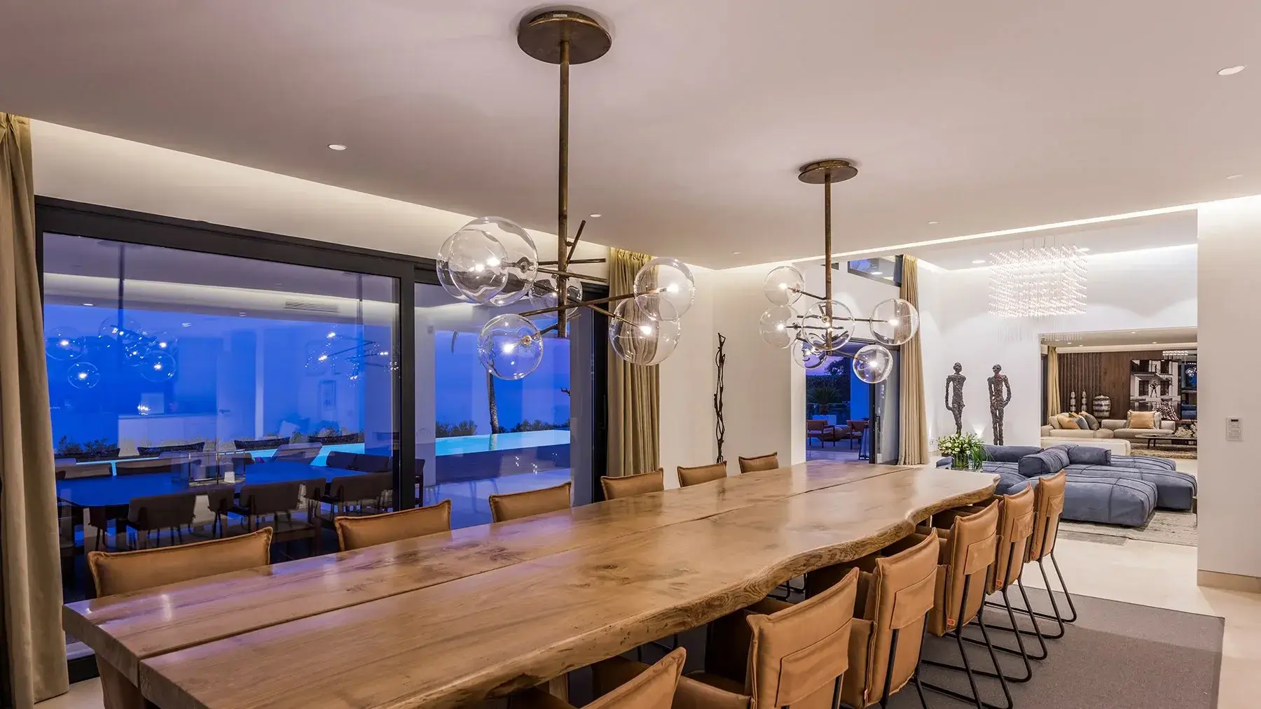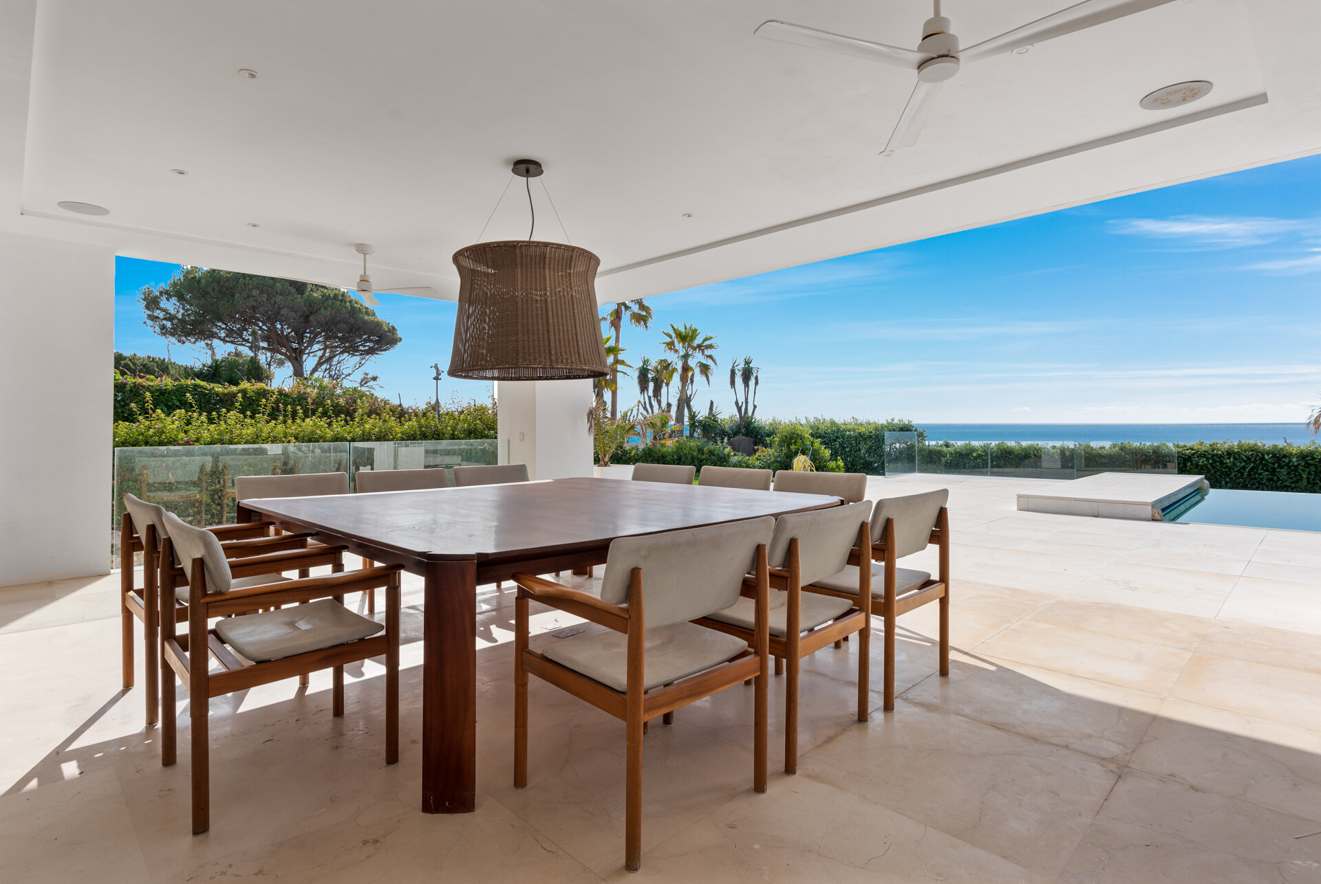 Villa Luminara del Mar is defined by light, scale, and uninterrupted sea views. Expansive open plan living areas flow effortlessly through floor to ceiling glazing onto terraces and gardens, creating a seamless indoor outdoor lifestyle. Clean architectural lines, natural finishes, and generous proportions give the spaces a calm, contemporary feel, equally suited to relaxed family living or larger gatherings.