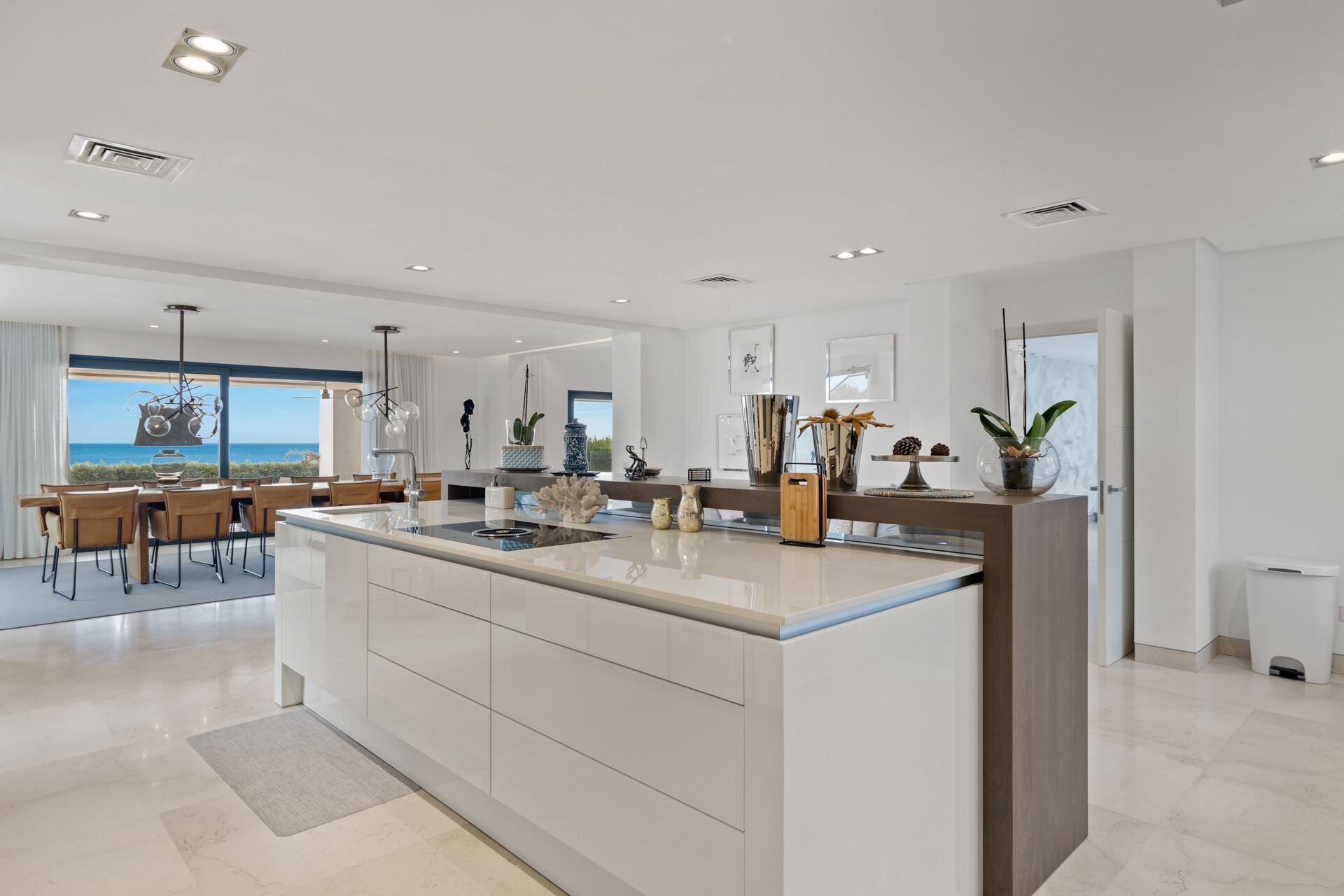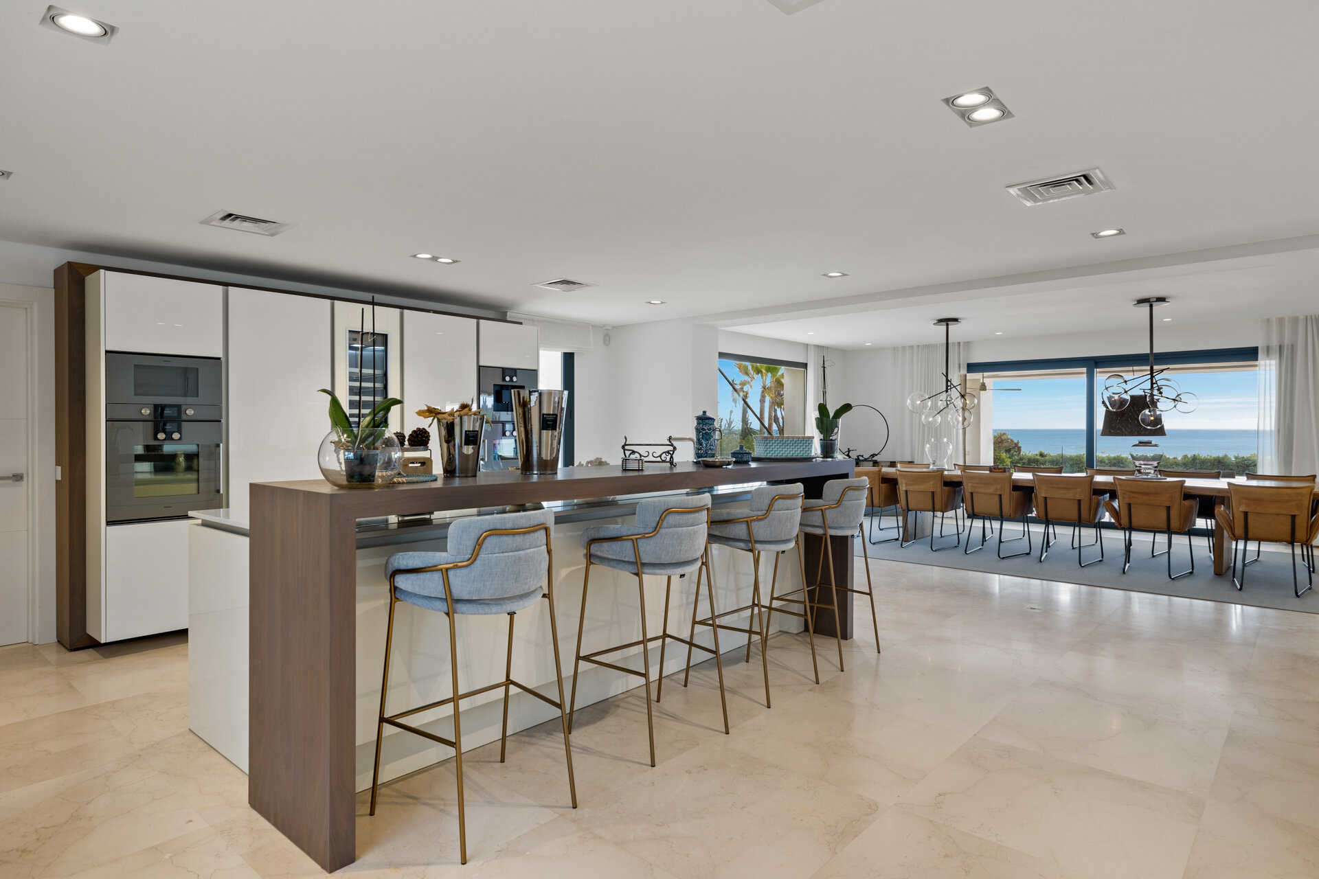 Two kitchens serve the villa, including a professional chef ready kitchen designed for seamless private dining and events. Indoor dining spaces open directly onto outdoor terraces, allowing meals to be enjoyed inside or alfresco overlooking the Mediterranean. The layout supports everything from casual family breakfasts to fully catered evenings.