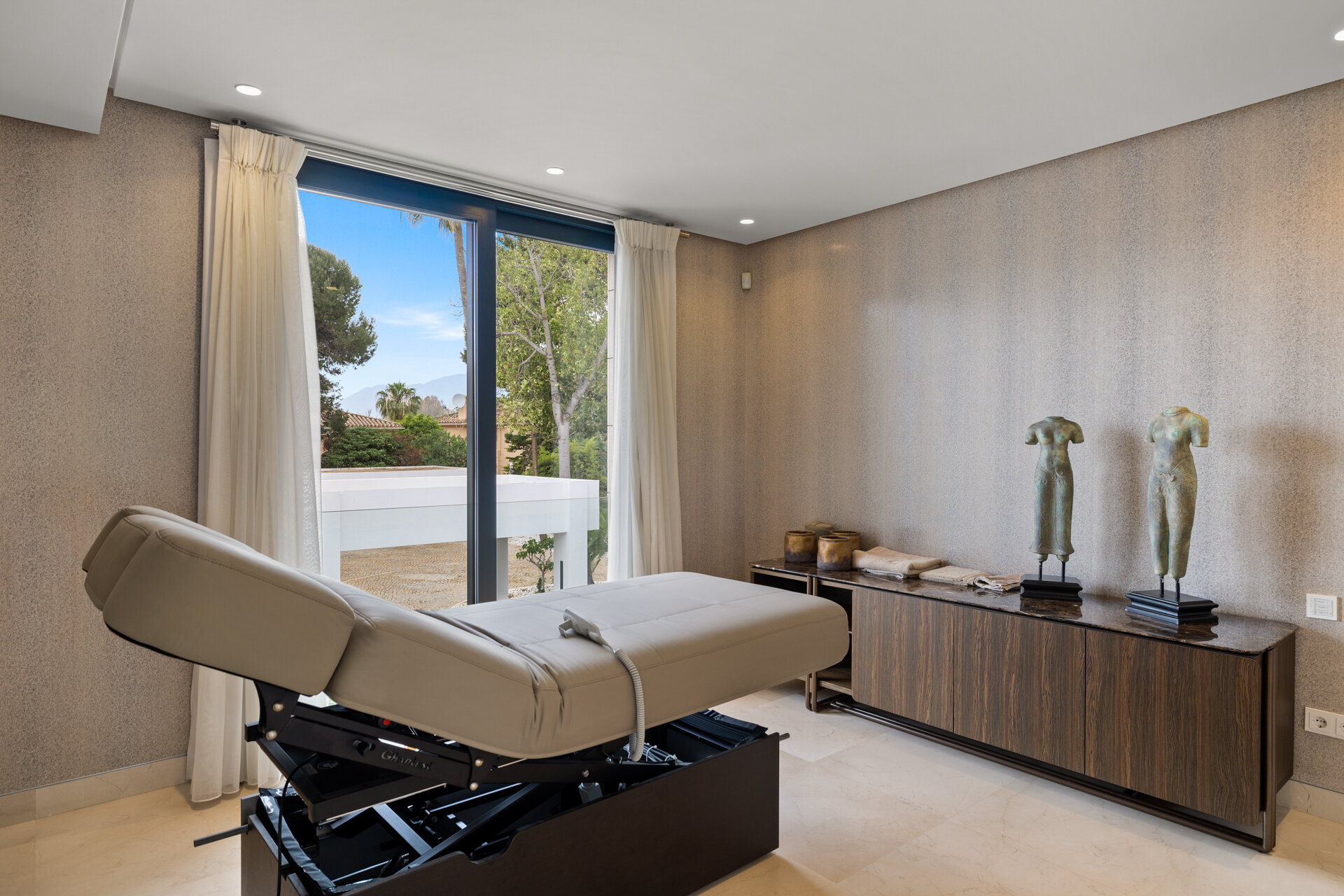 Private on site parking is available within the grounds of the villa, ensuring discreet and convenient arrival for guests and service providers.