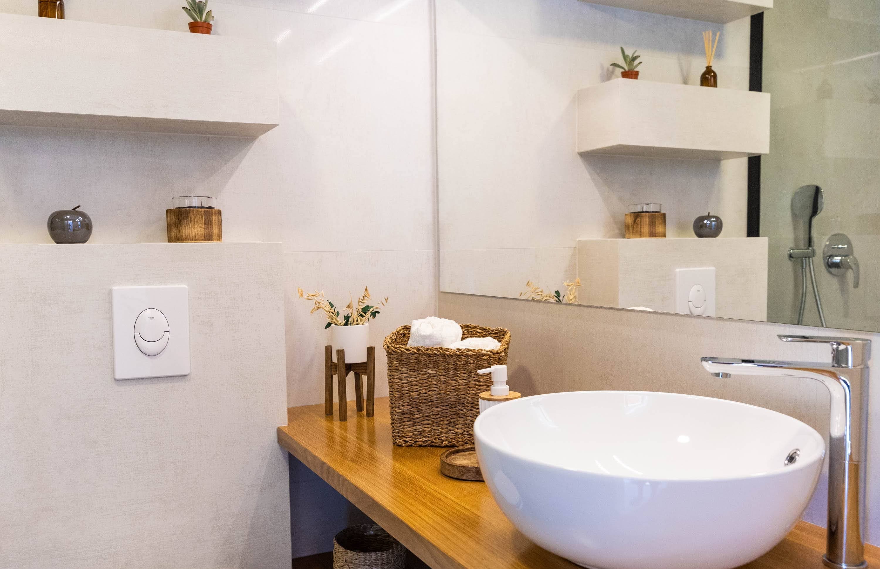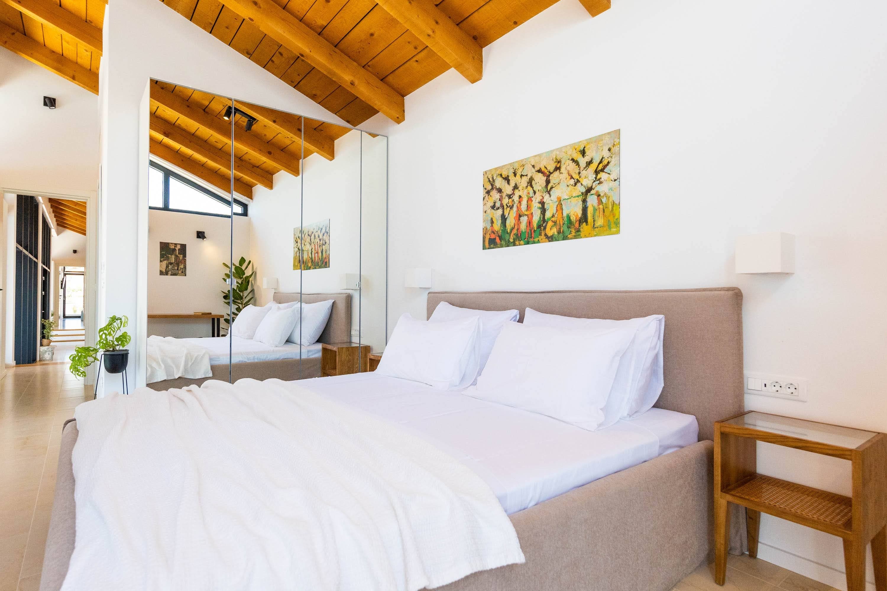 Each bedroom includes its own en-suite bathroom with contemporary fittings and walk-in showers. Clean modern finishes and natural materials create a bright and comfortable space throughout the villa.