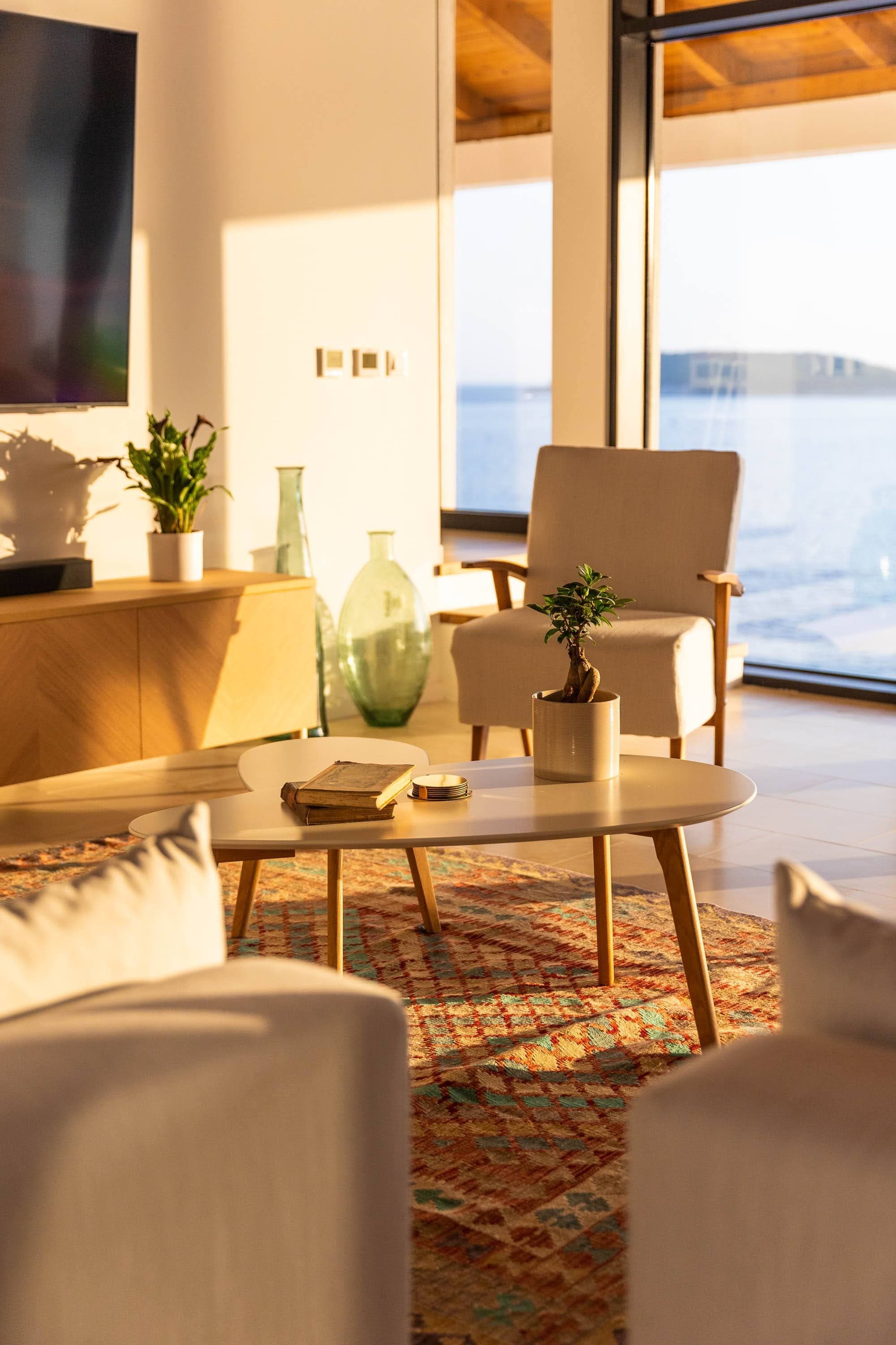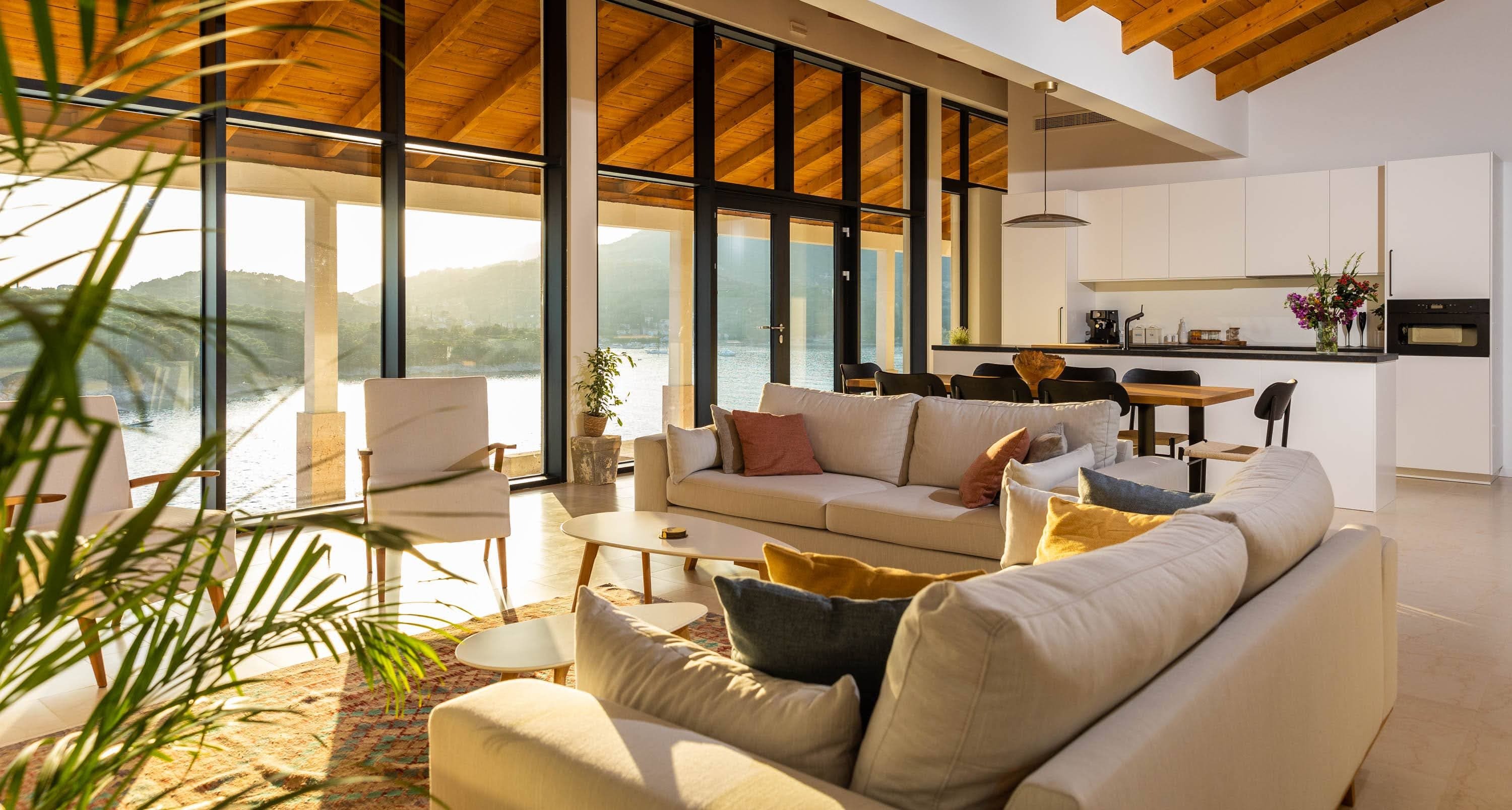 The villa’s interiors are designed around openness, natural light, and uninterrupted sea views. Large glass walls and sliding doors connect the main living area directly to the terraces, allowing the Adriatic to become part of the interior atmosphere. The open-plan lounge offers comfortable seating and a relaxed contemporary design that flows naturally toward the outdoor dining and pool areas.
