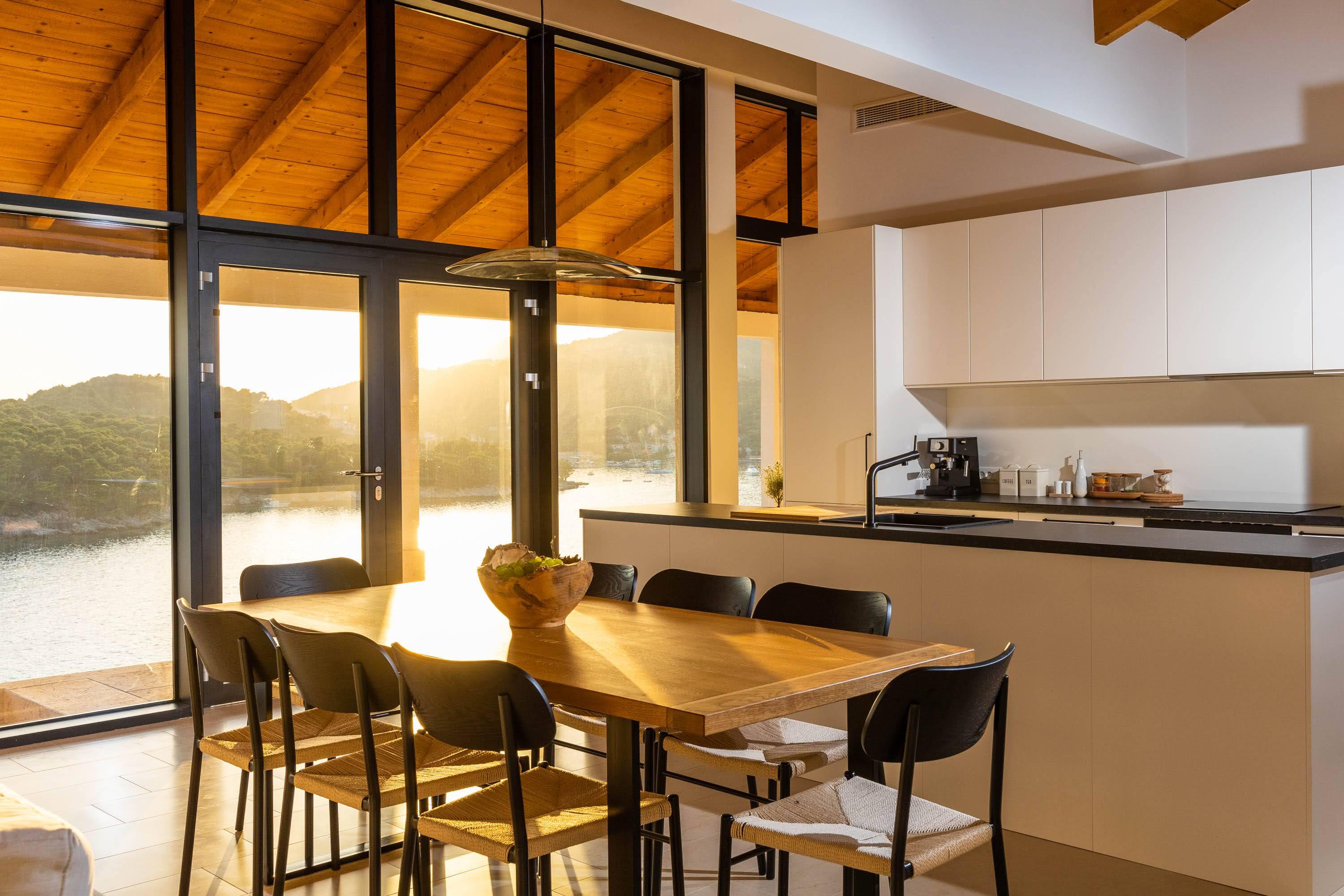 A fully equipped modern kitchen sits within the open-plan living space and includes high-quality appliances and generous preparation areas. The indoor dining table comfortably seats eight guests, while the outdoor terrace provides an additional alfresco dining area overlooking the Adriatic.