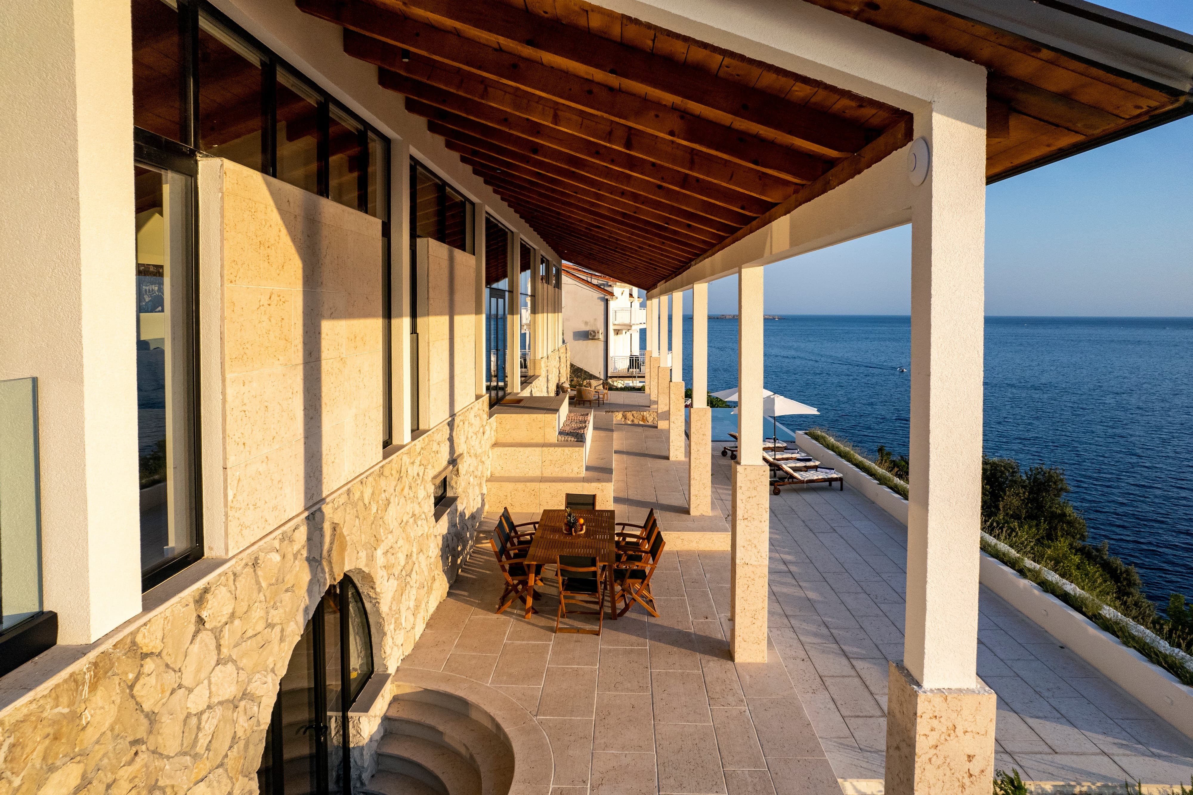 The property is designed around openness and connection to the surrounding landscape. Approximately 170 square metres of interior living space flows seamlessly onto more than 200 square metres of sea-facing terraces, creating a true summer residence where indoor and outdoor living merge effortlessly. Nearly every room opens onto porch-style terraces that frame panoramic views across the Adriatic.