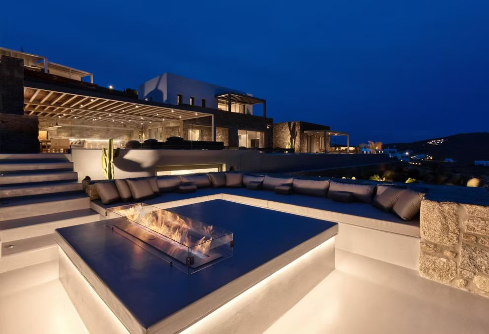 Entertainment is centred on outdoor living and shared social spaces rather than formal media rooms. The villa includes multiple lounge terraces, a fire pit area, and poolside spaces designed for relaxed gatherings.