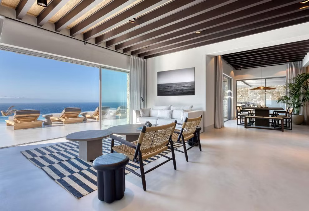 The villa features one main open-plan living area designed around panoramic sea views, with lounge seating that flows directly onto the outdoor terraces. The interiors combine contemporary architecture with natural materials, creating a calm, uncluttered atmosphere for shared living and relaxation.