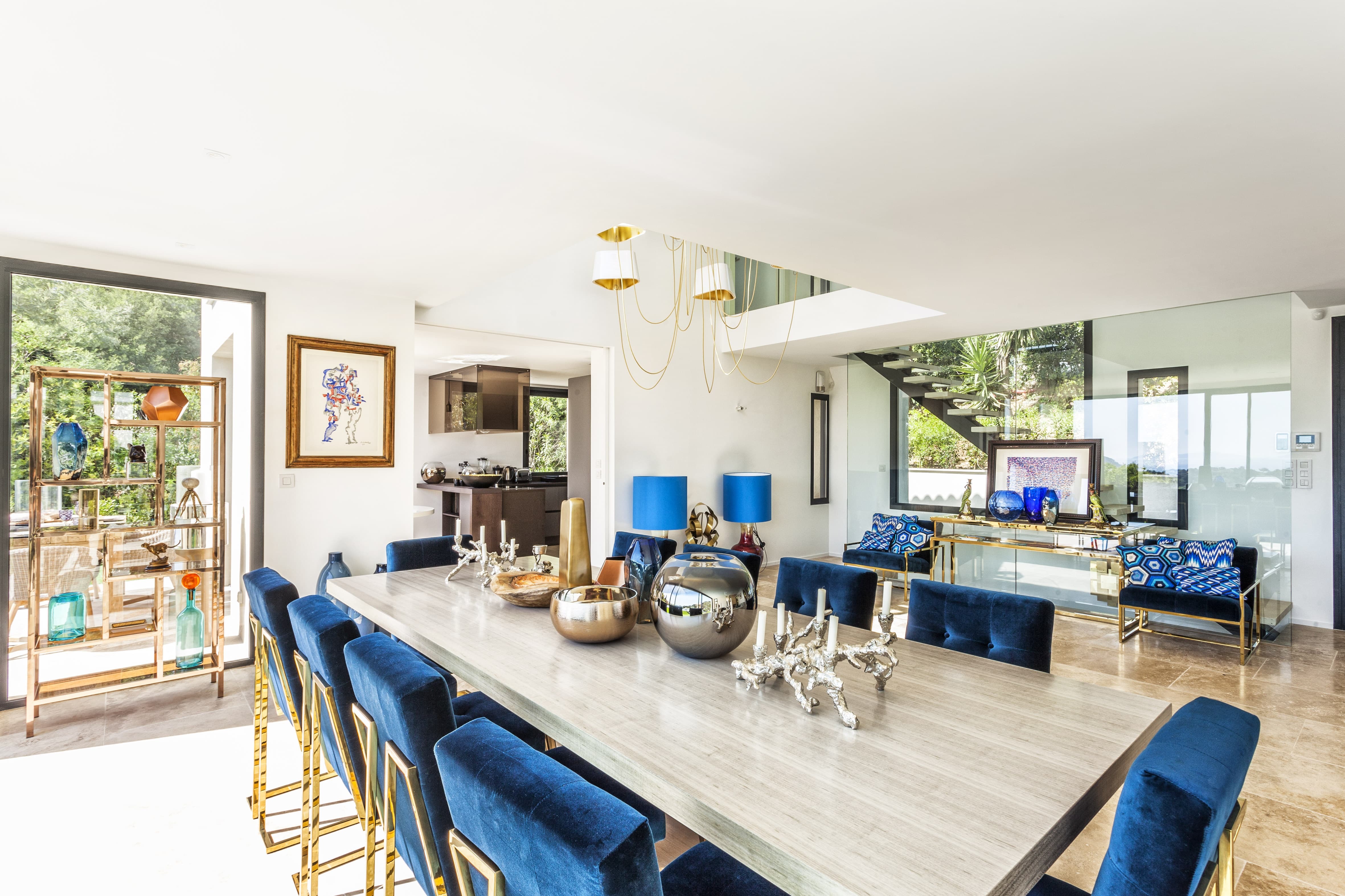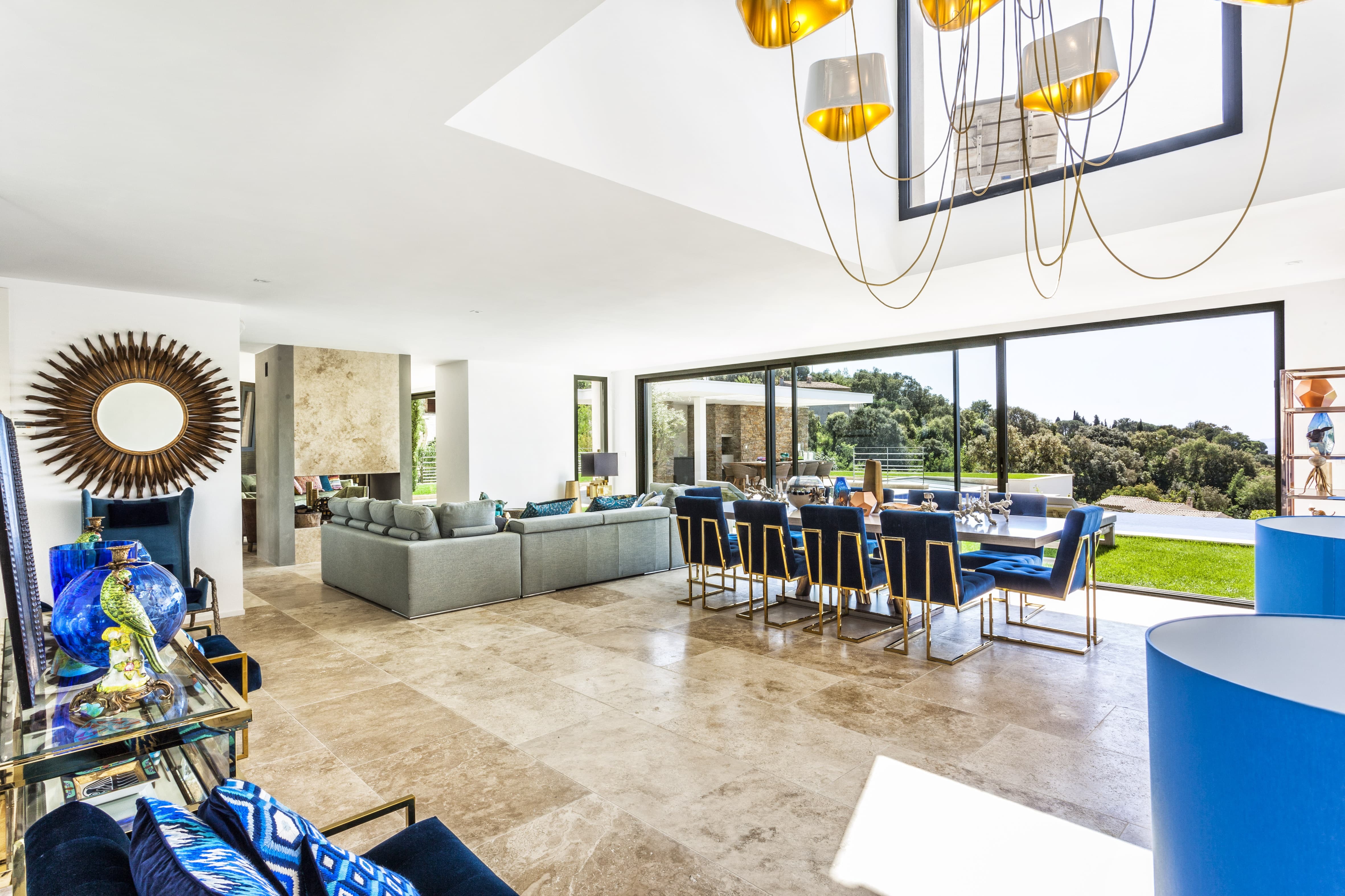 Expansive, open-plan living areas define the villa, designed around light, volume, and uninterrupted views. Floor-to-ceiling glass connects the interiors seamlessly to the surrounding terraces, allowing the Mediterranean to remain a constant backdrop. Multiple lounge areas offer both social and private spaces, creating a natural balance between gathering and retreat.