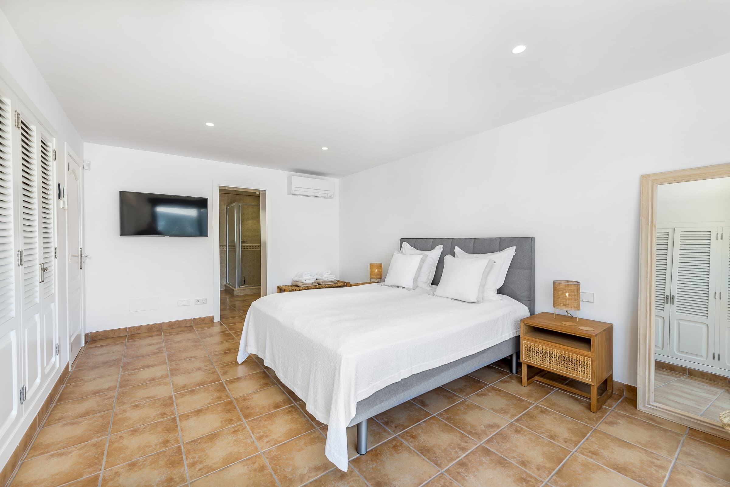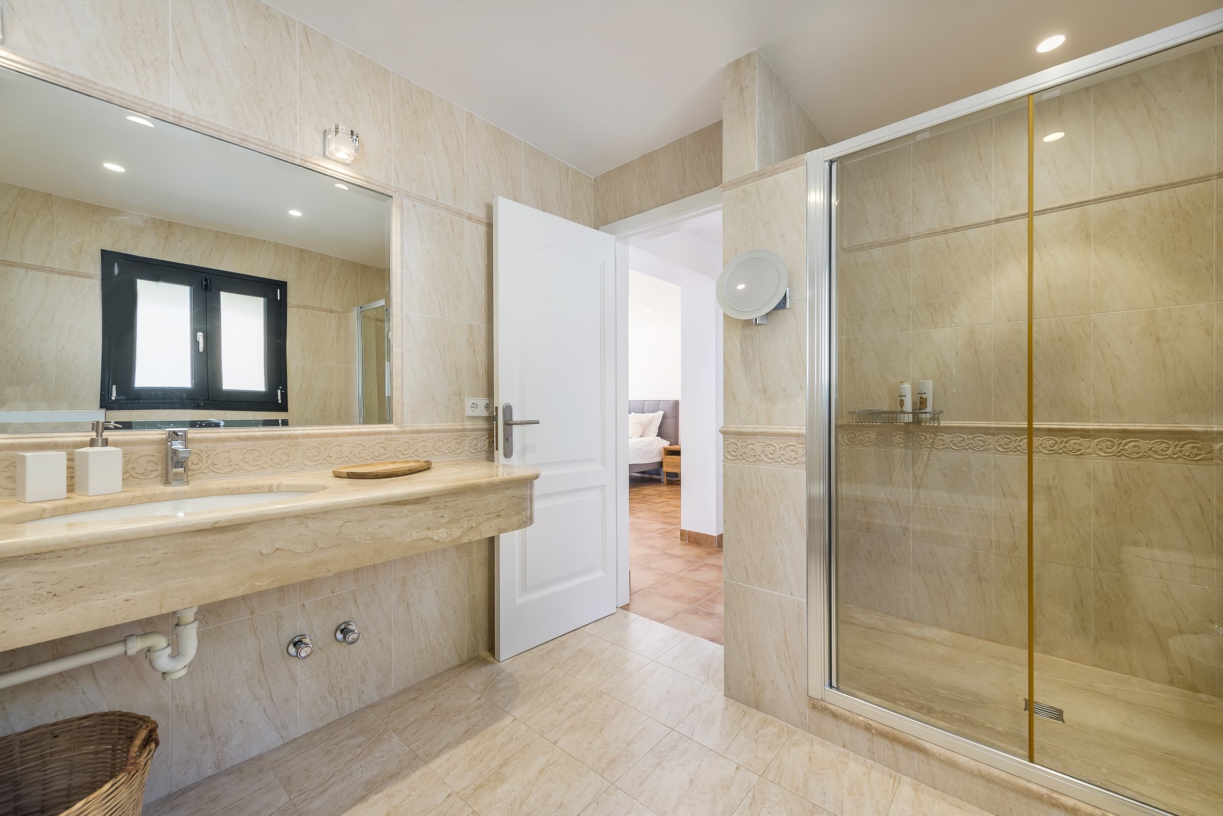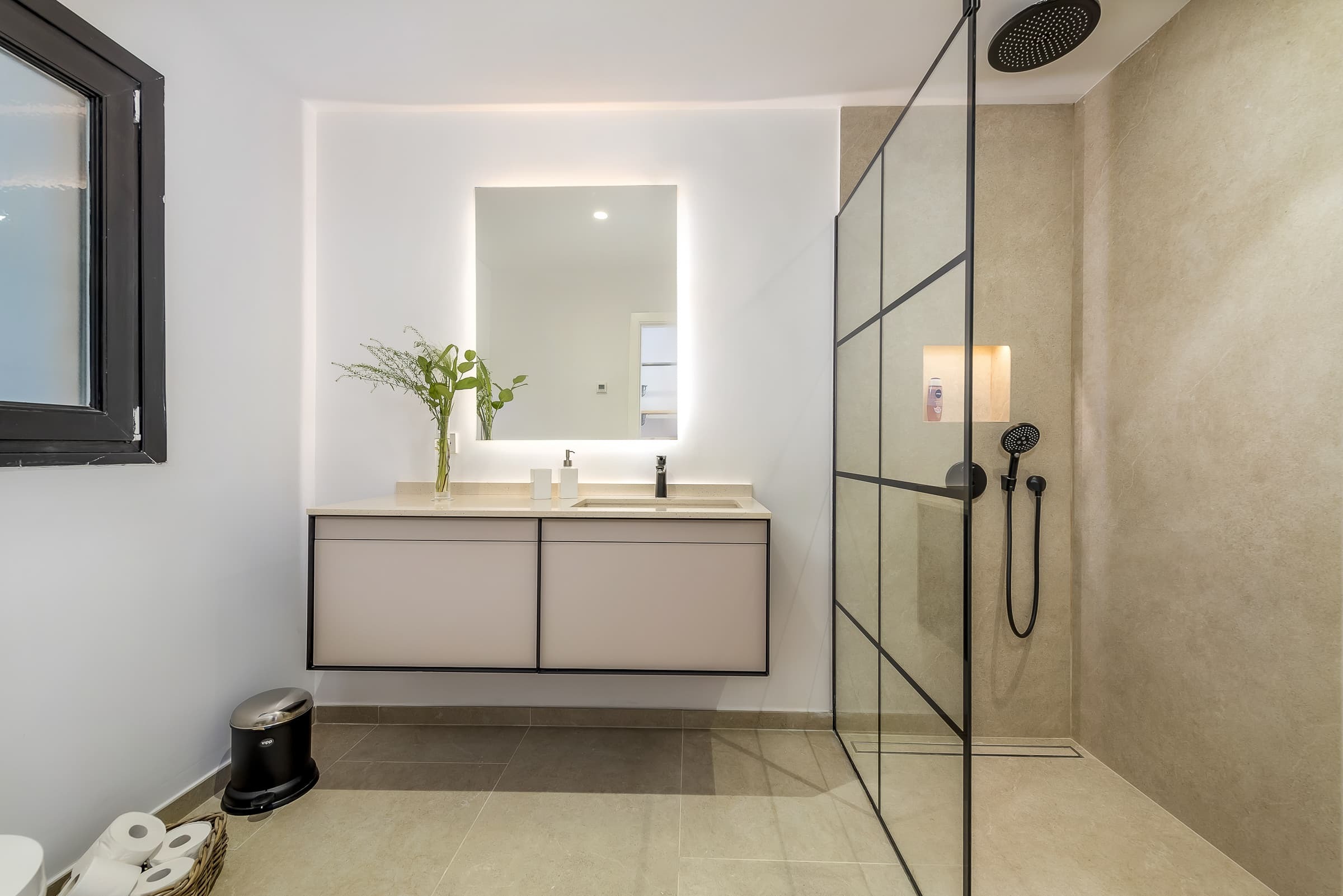 Three well-appointed bathrooms finished in a clean, contemporary style, offering both practicality and comfort. The overall design reflects the understated elegance of the villa.
