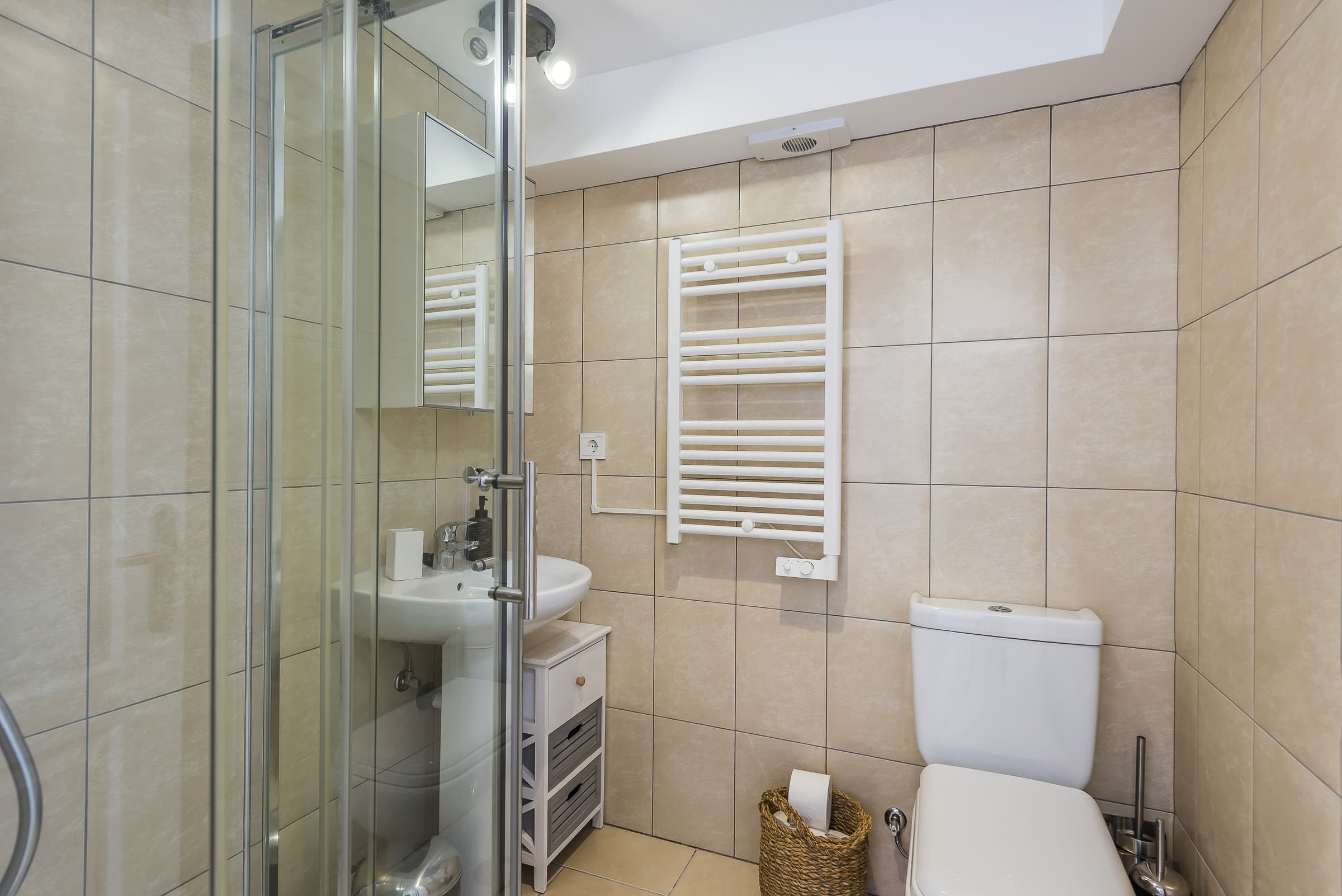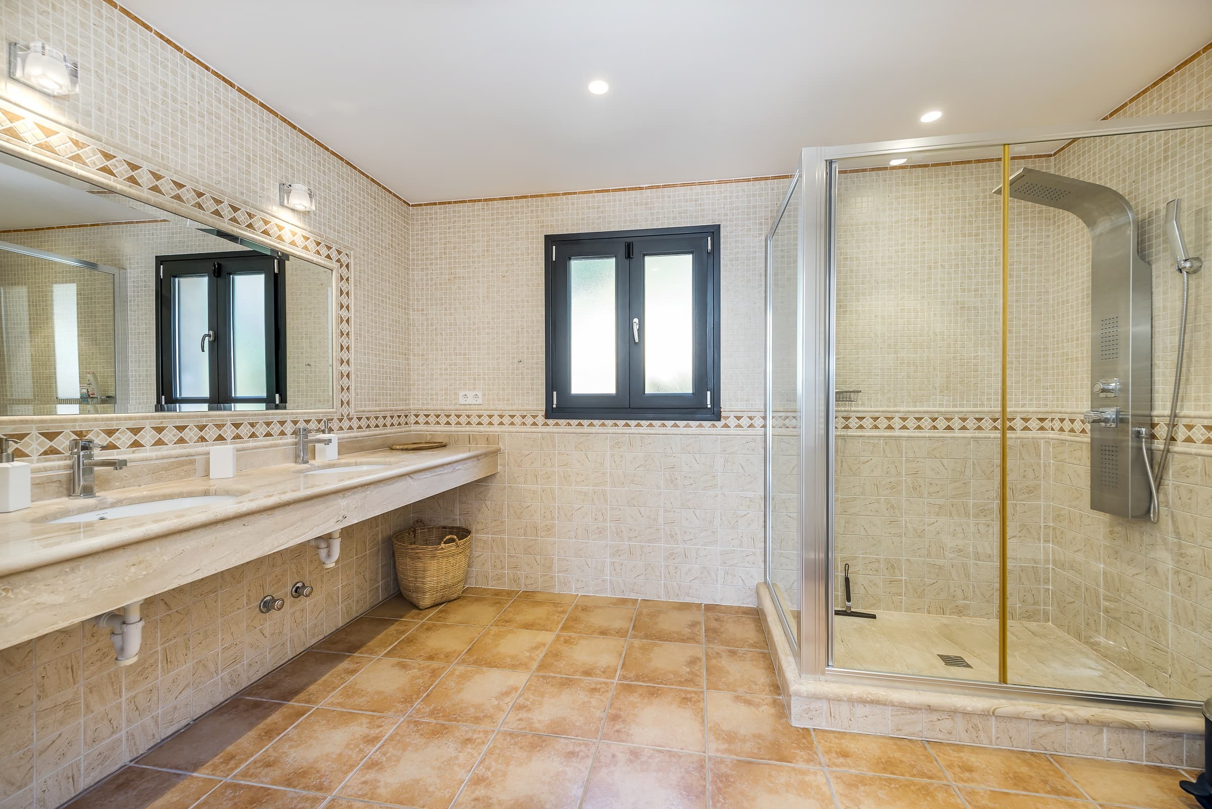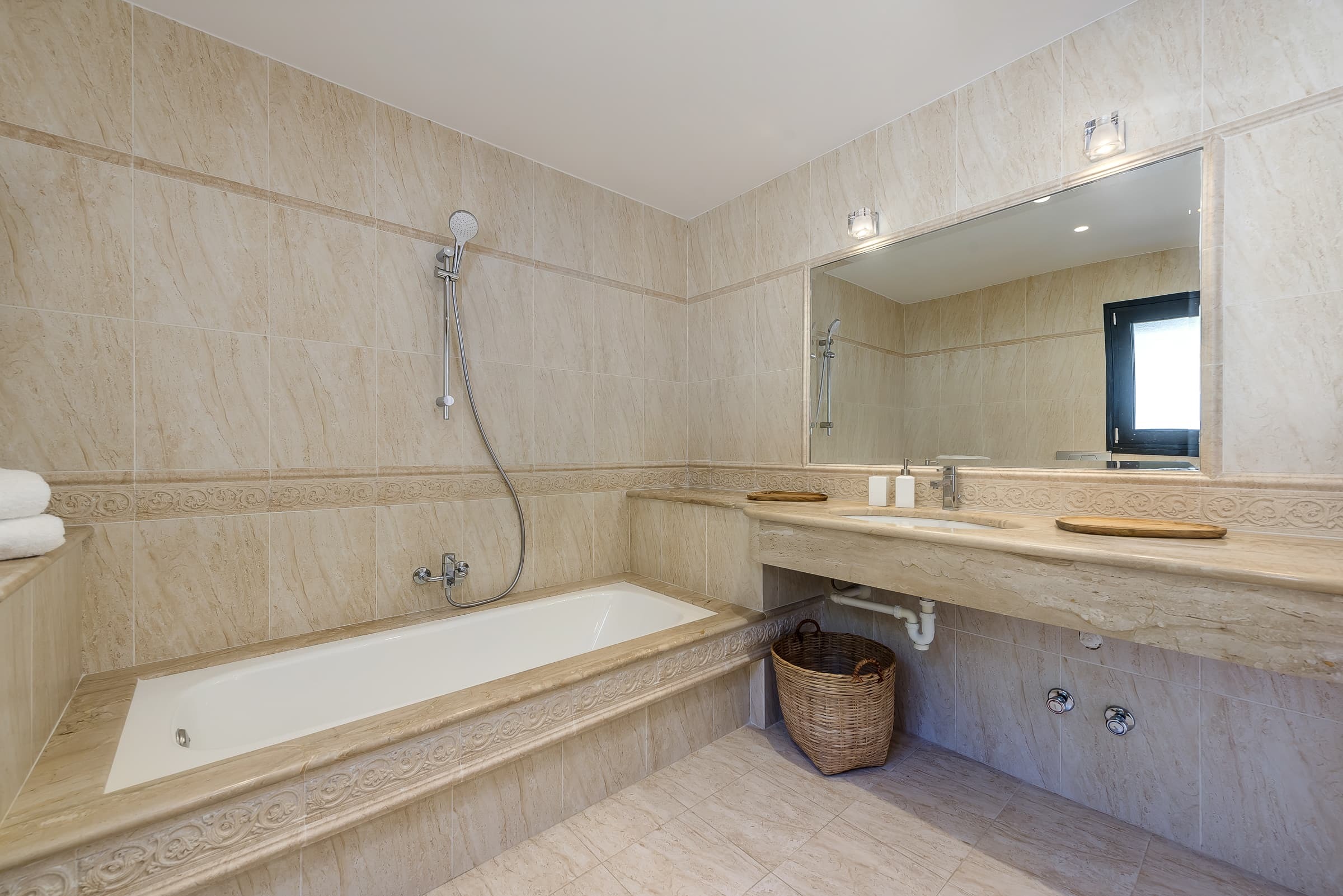 Three well-appointed bathrooms finished in a clean, contemporary style, offering both practicality and comfort. The overall design reflects the understated elegance of the villa.