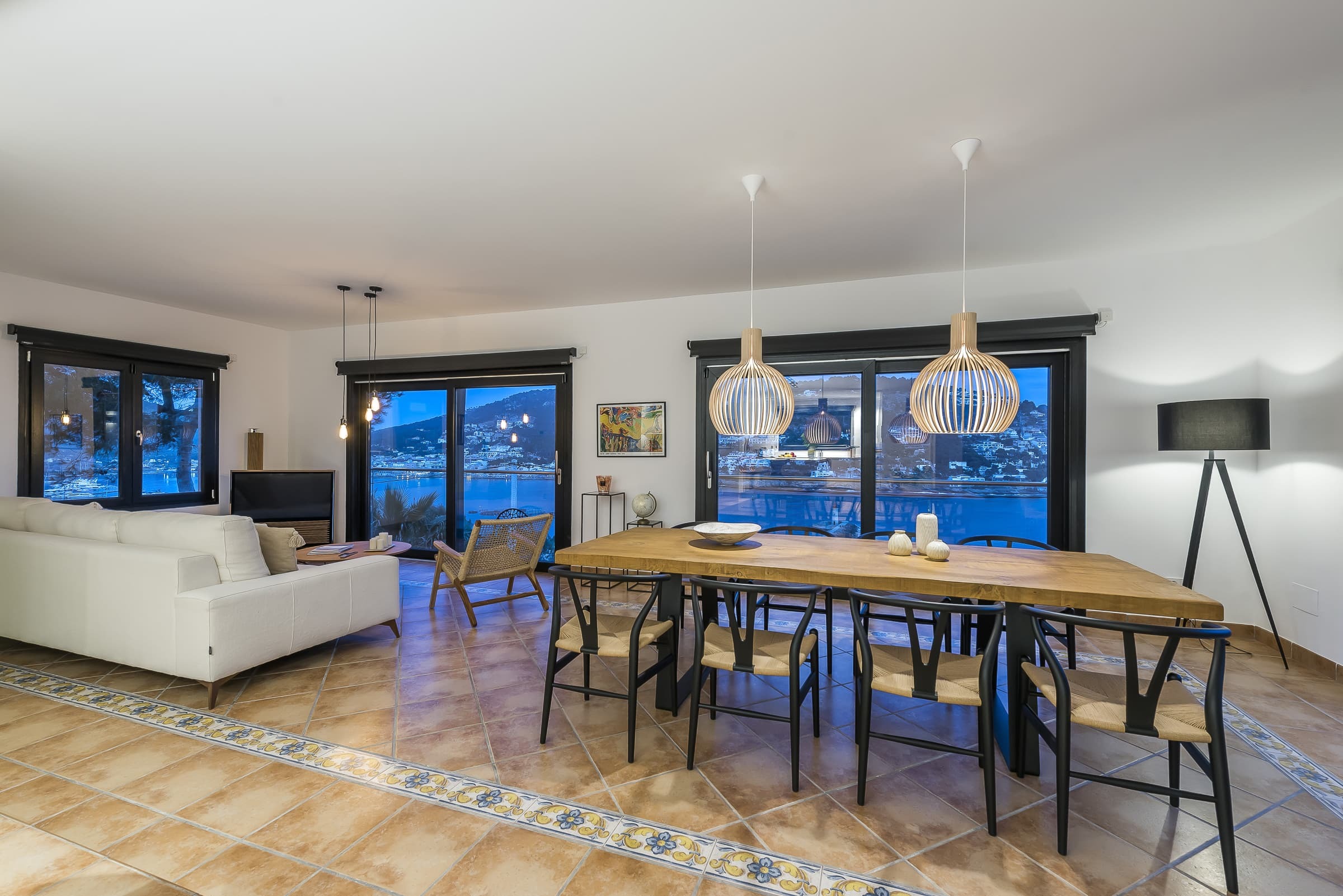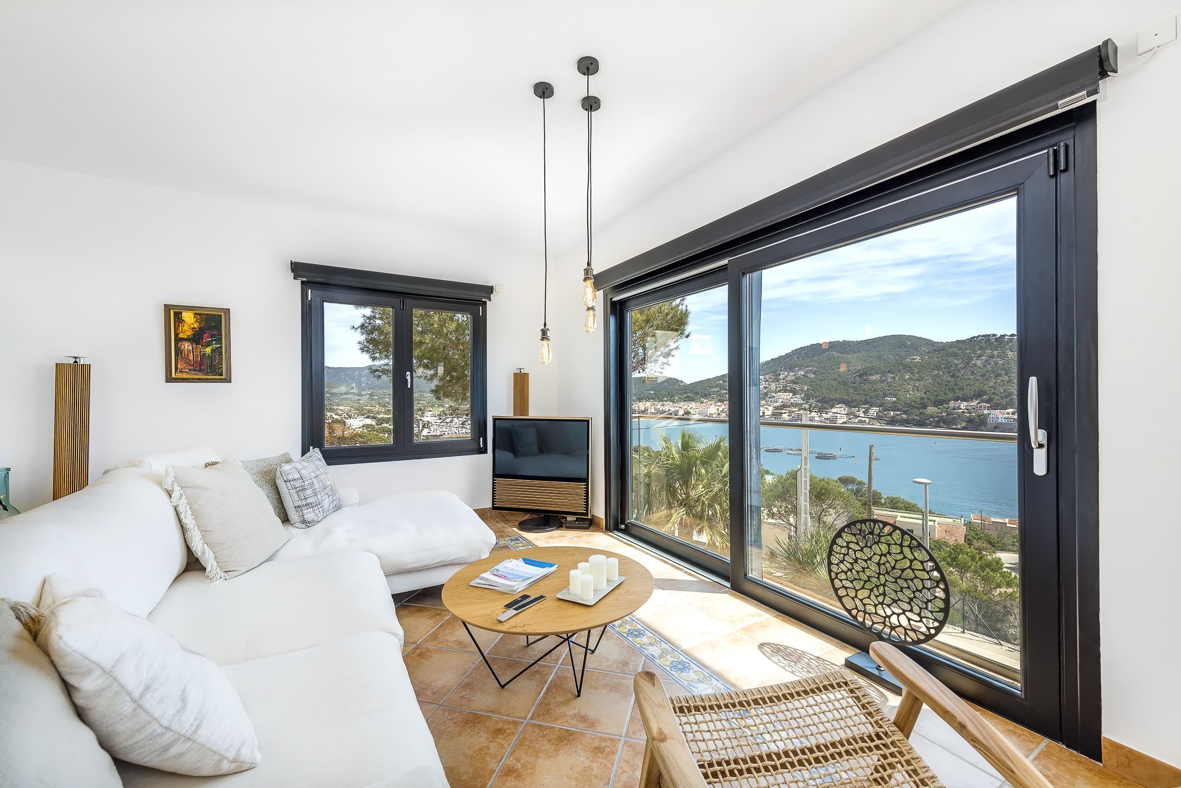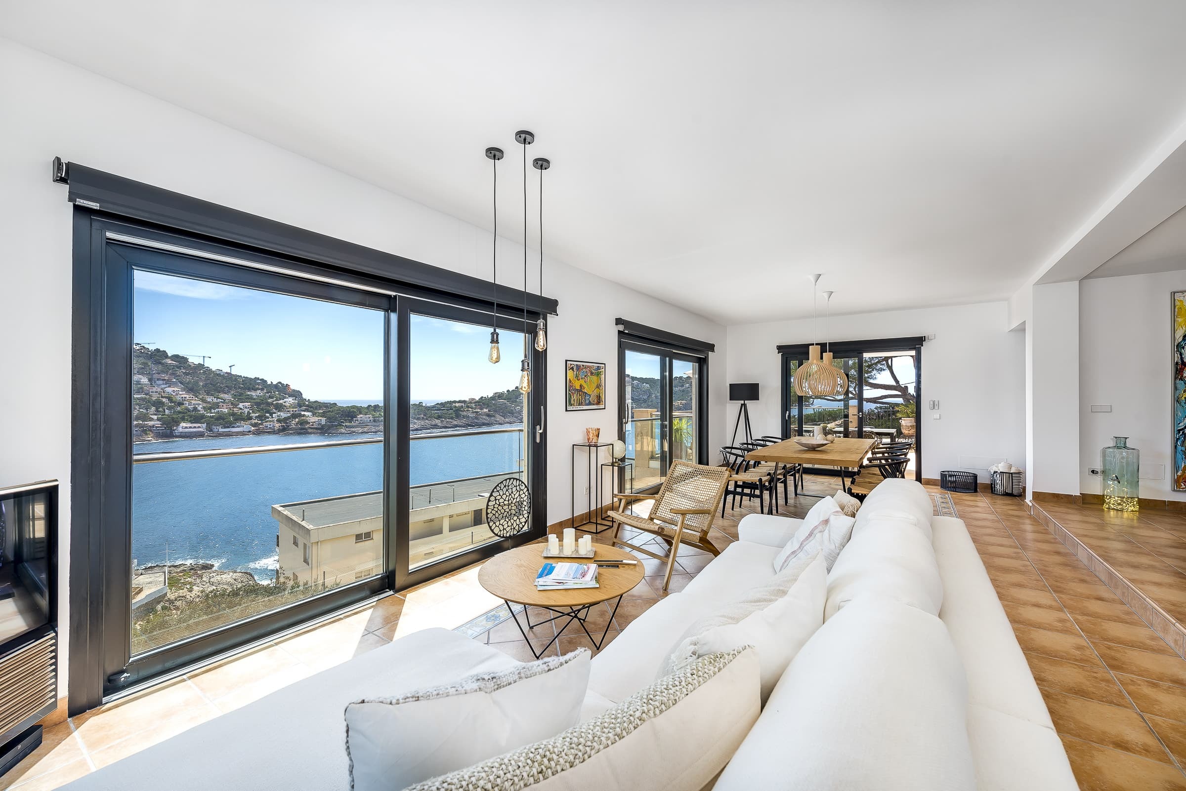 A bright, open living environment where large windows frame uninterrupted views across the harbour and sea. The main living room is both spacious and inviting, centred around comfort and designed to flow naturally onto the terrace, allowing the landscape to remain part of the experience throughout the day.