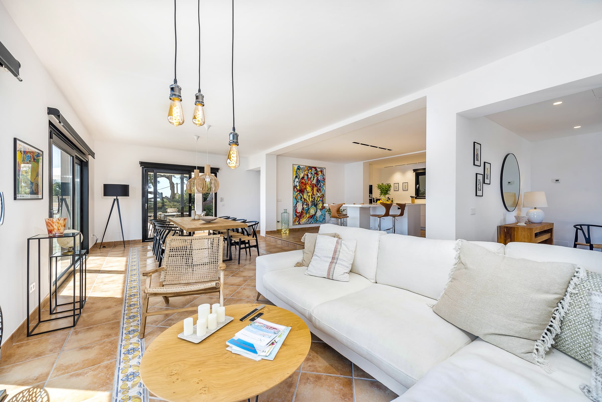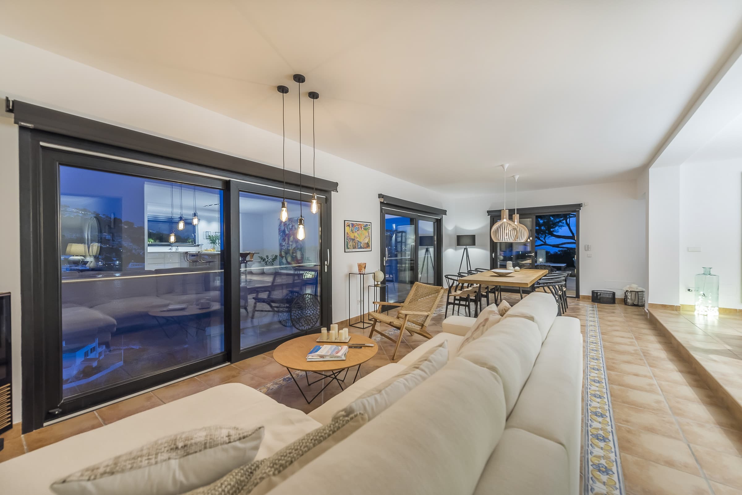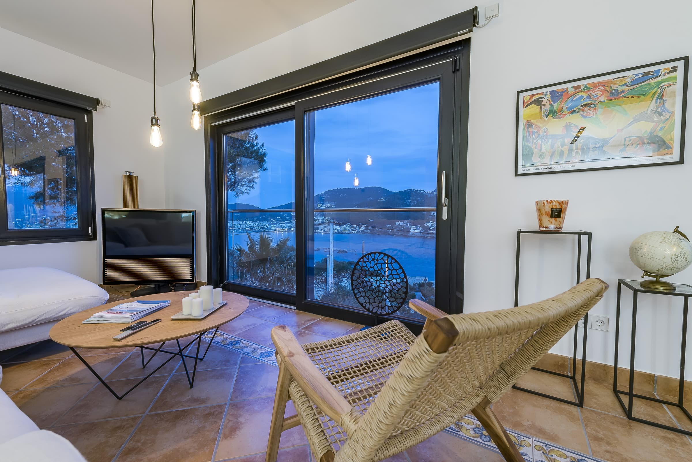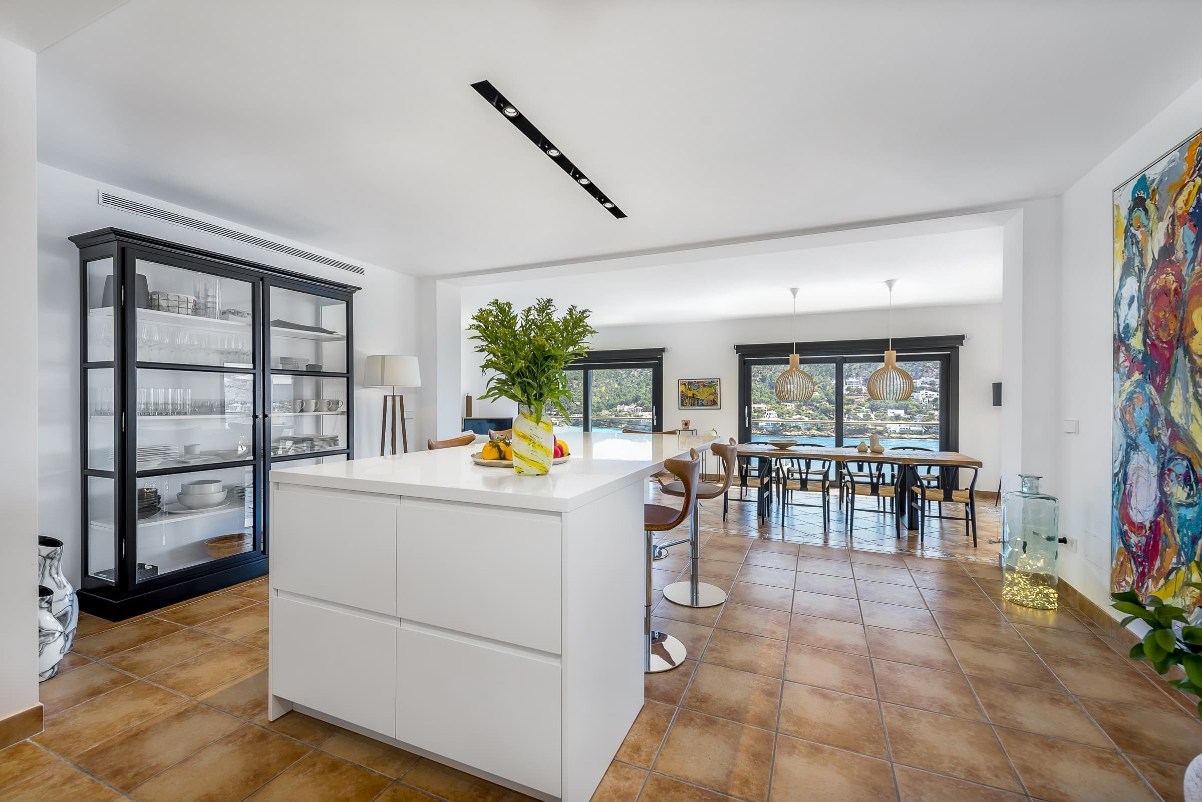 A bright, open living environment where large windows frame uninterrupted views across the harbour and sea. The main living room is both spacious and inviting, centred around comfort and designed to flow naturally onto the terrace, allowing the landscape to remain part of the experience throughout the day.