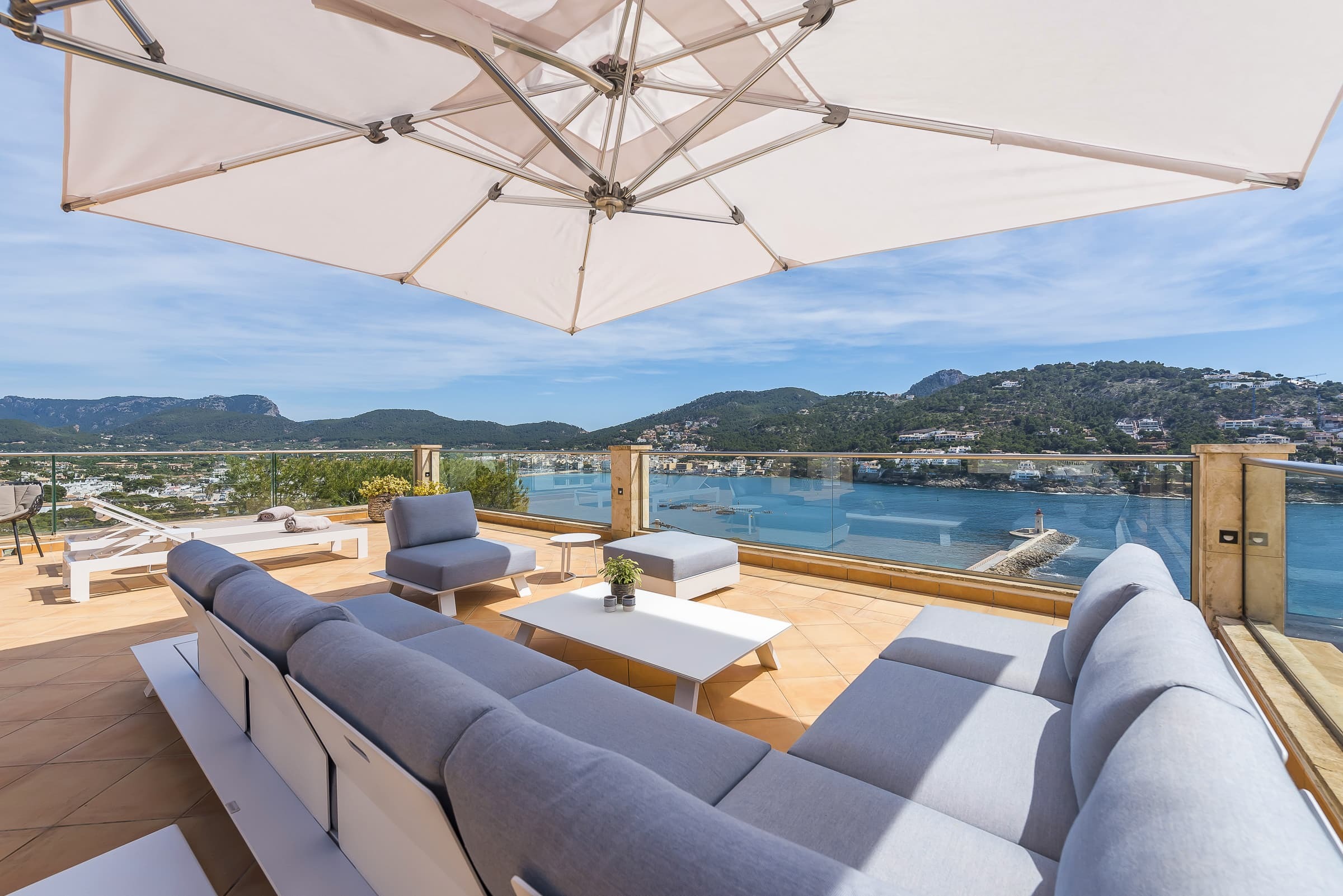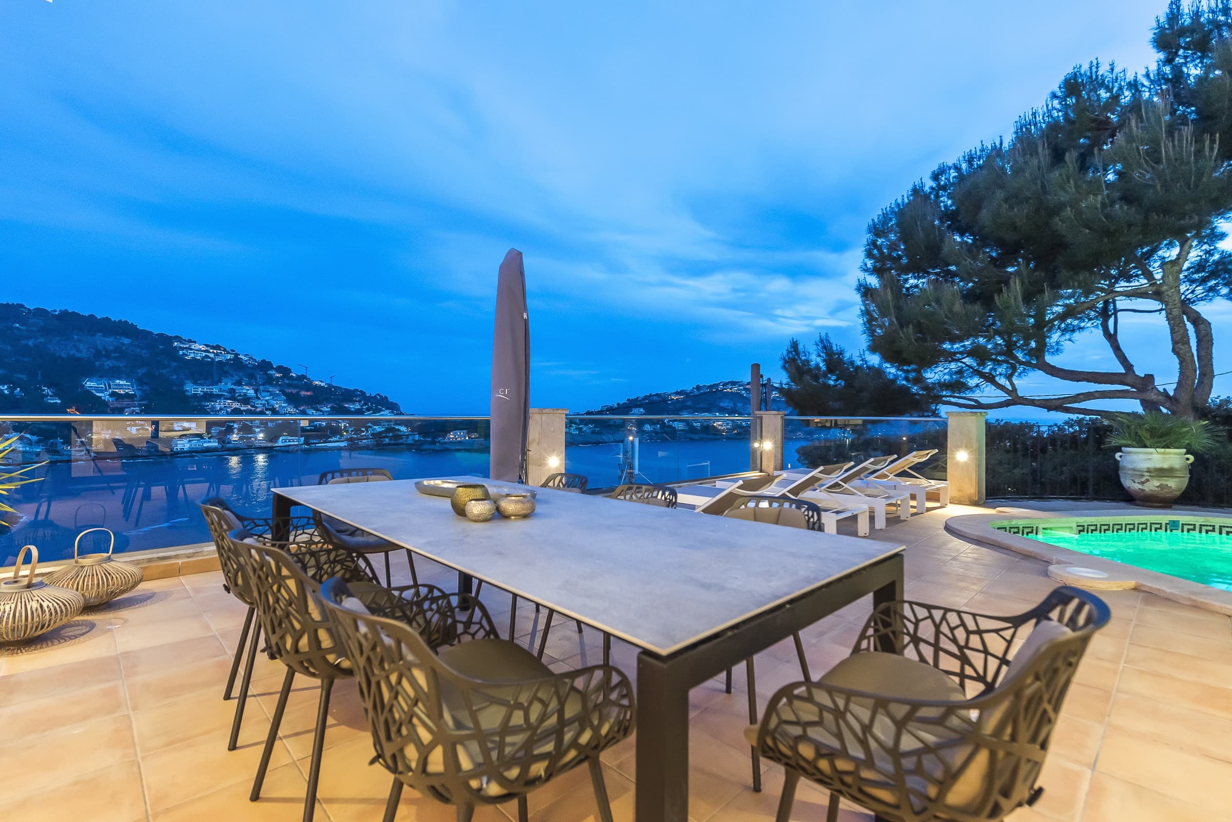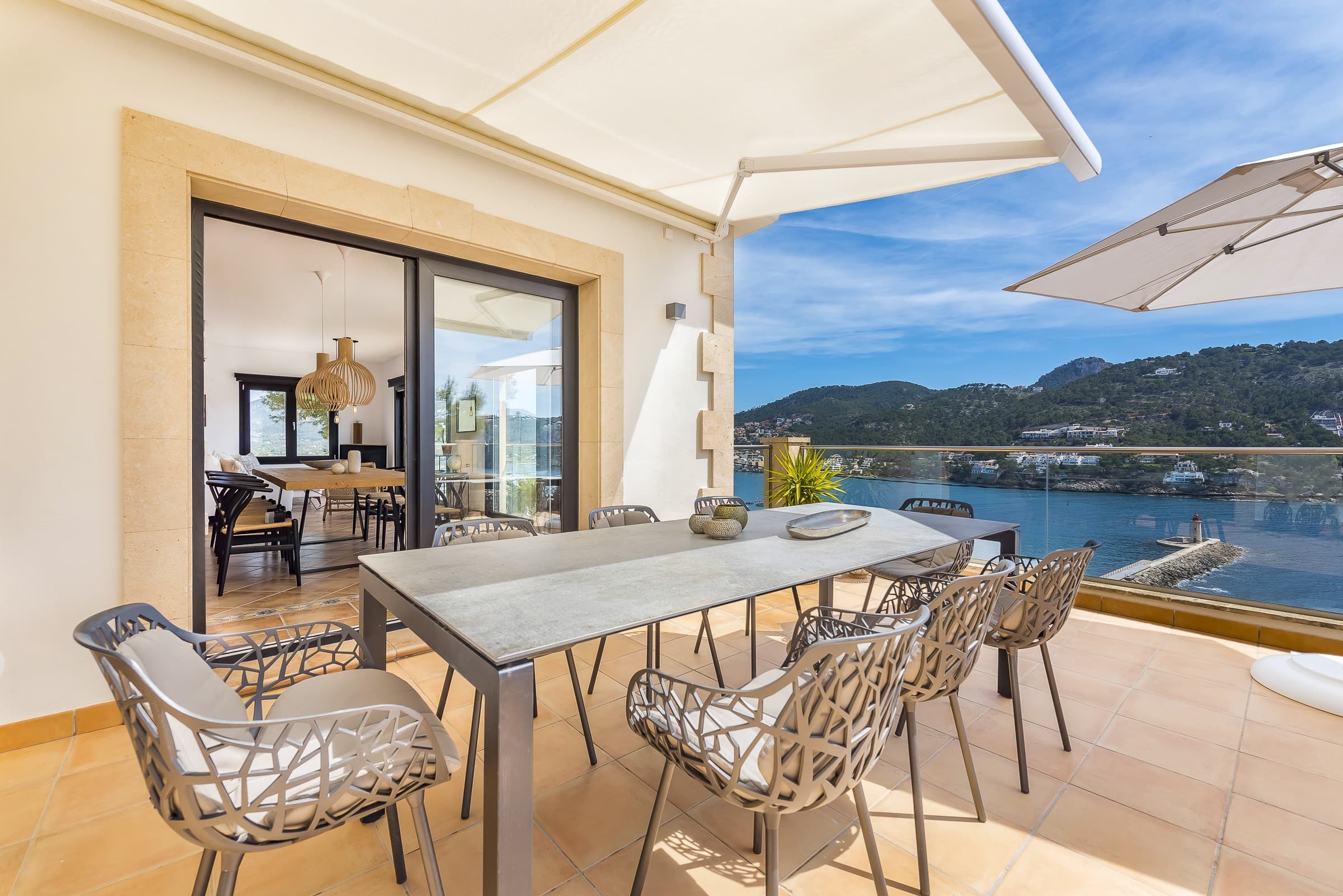 Set above the harbour of Puerto de Andratx, Villa Port Azure is defined by its elevated position and uninterrupted views across the marina and open sea. From first light to the final glow of sunset, the shifting colours of the water form a constant backdrop to daily life.