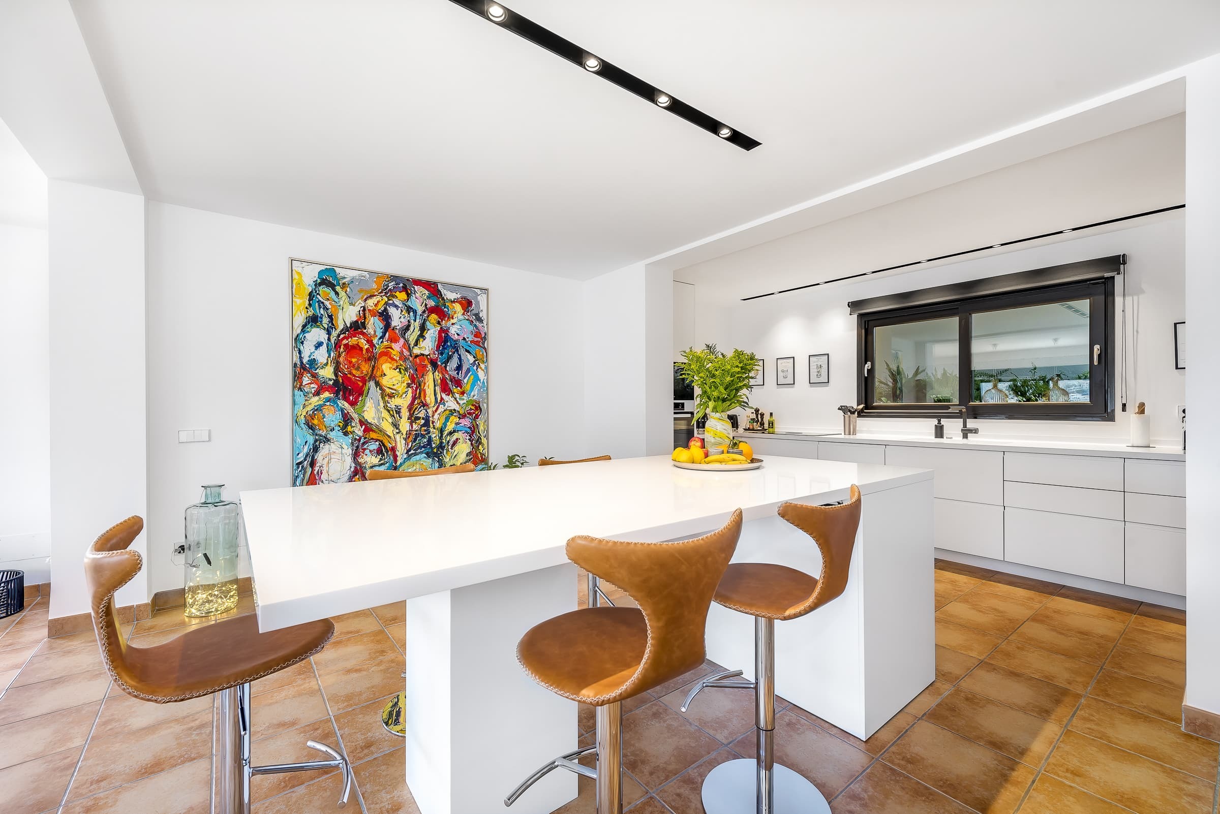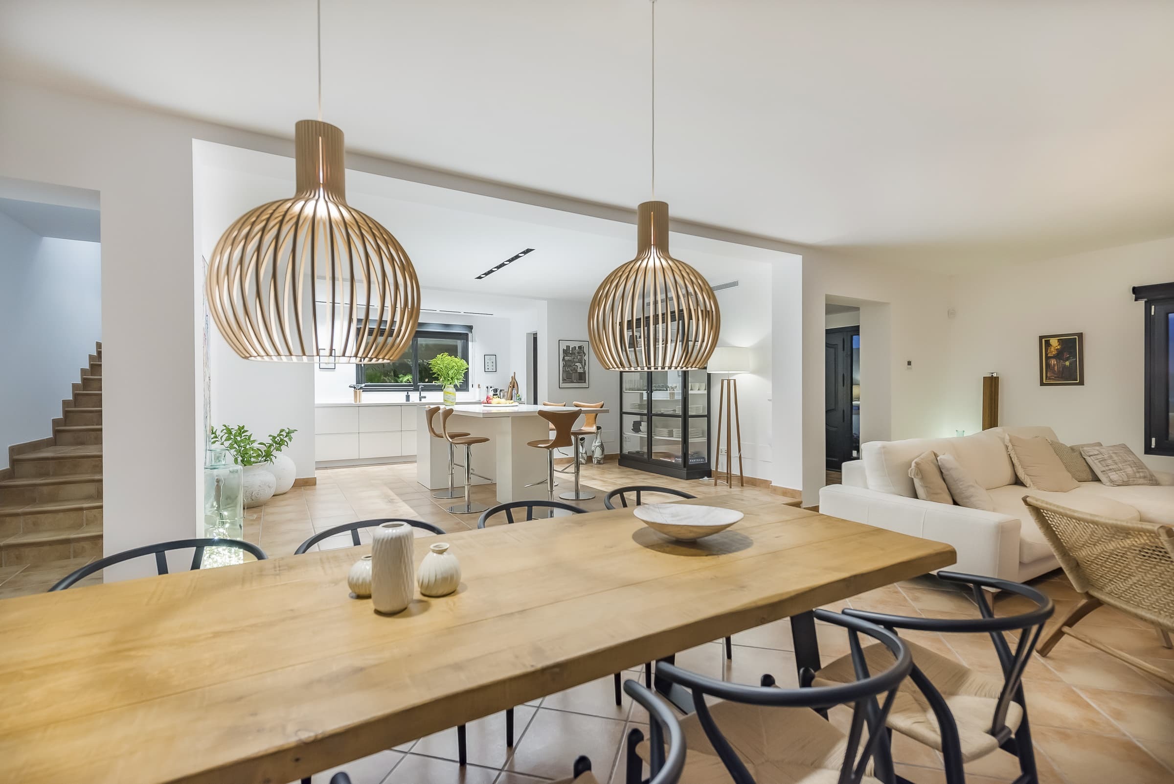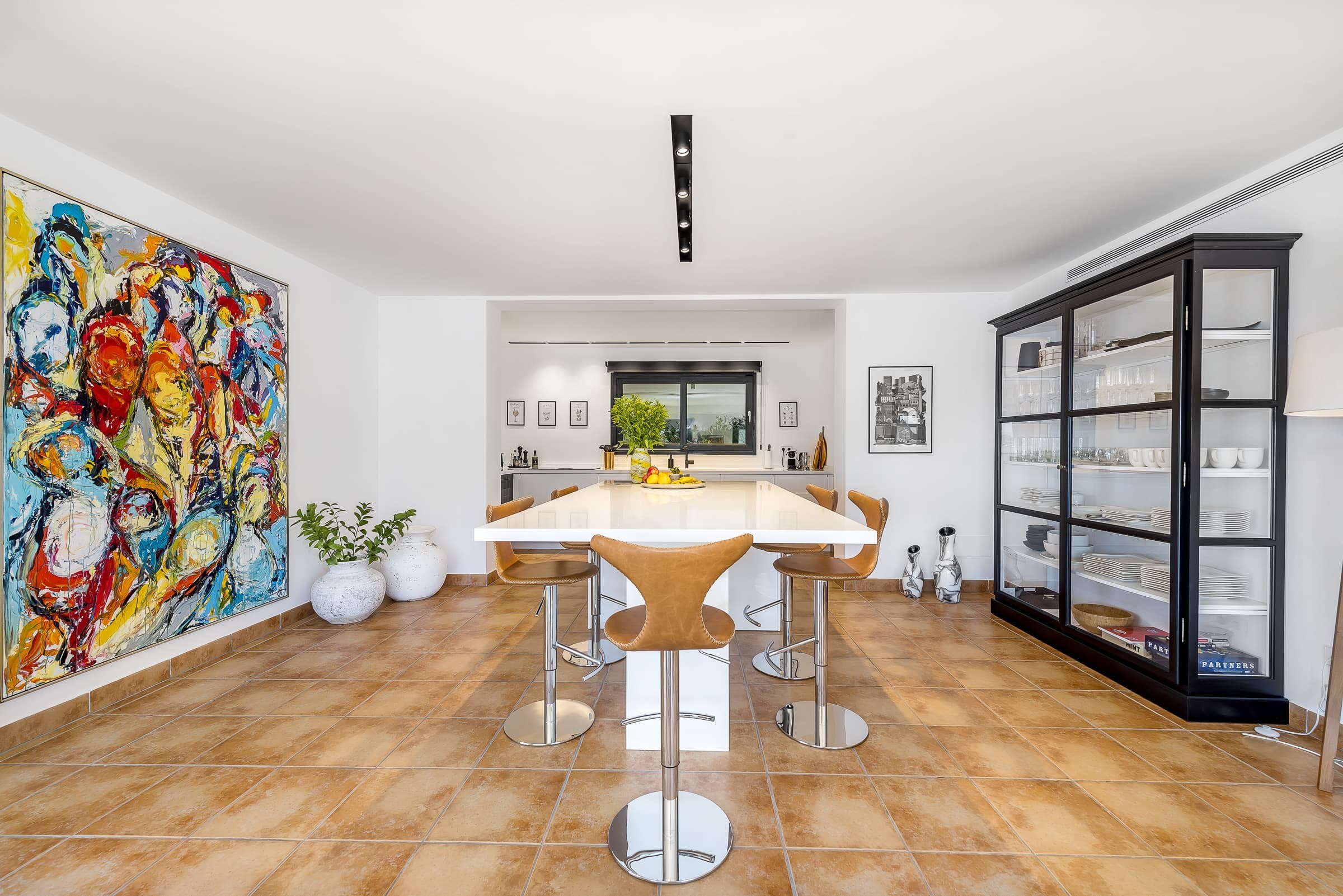 A modern open-plan designer kitchen with bar seating forms the heart of the home, ideal for both casual dining and shared meals. The adjacent dining area accommodates larger gatherings, while the seamless connection to the terrace allows dining to extend outdoors with ease.
