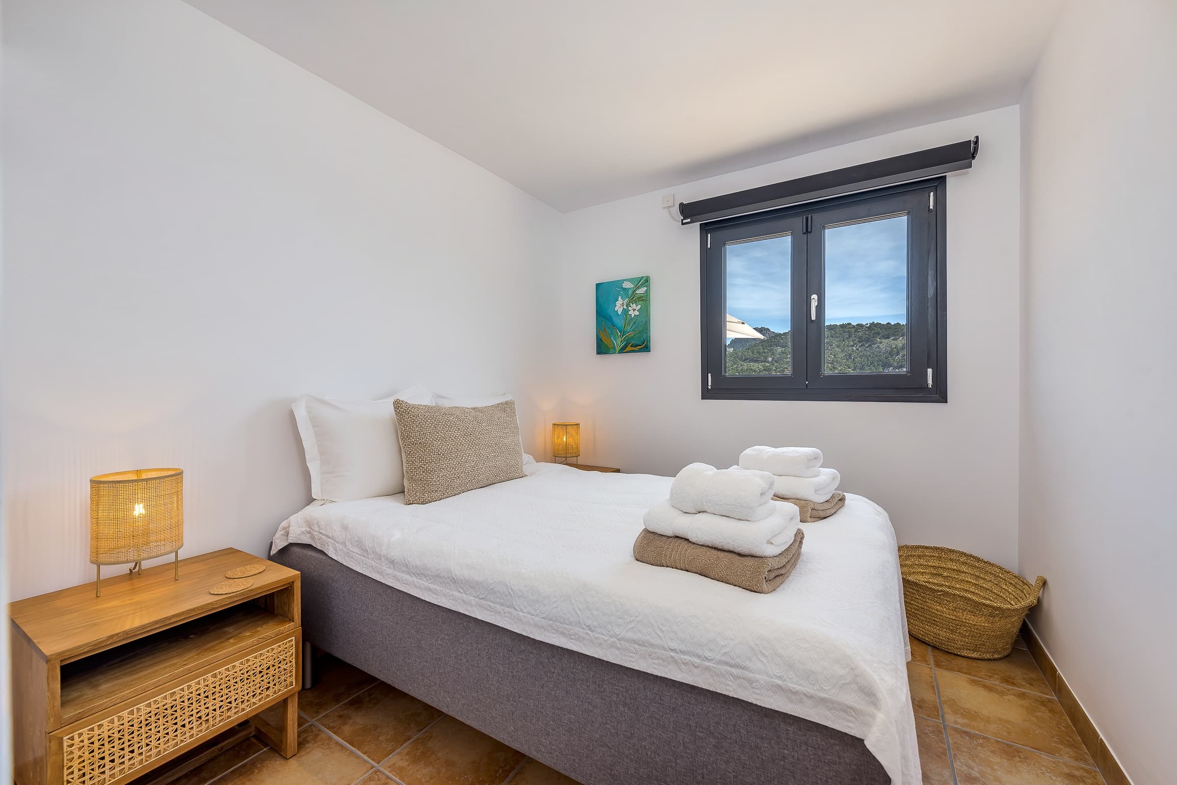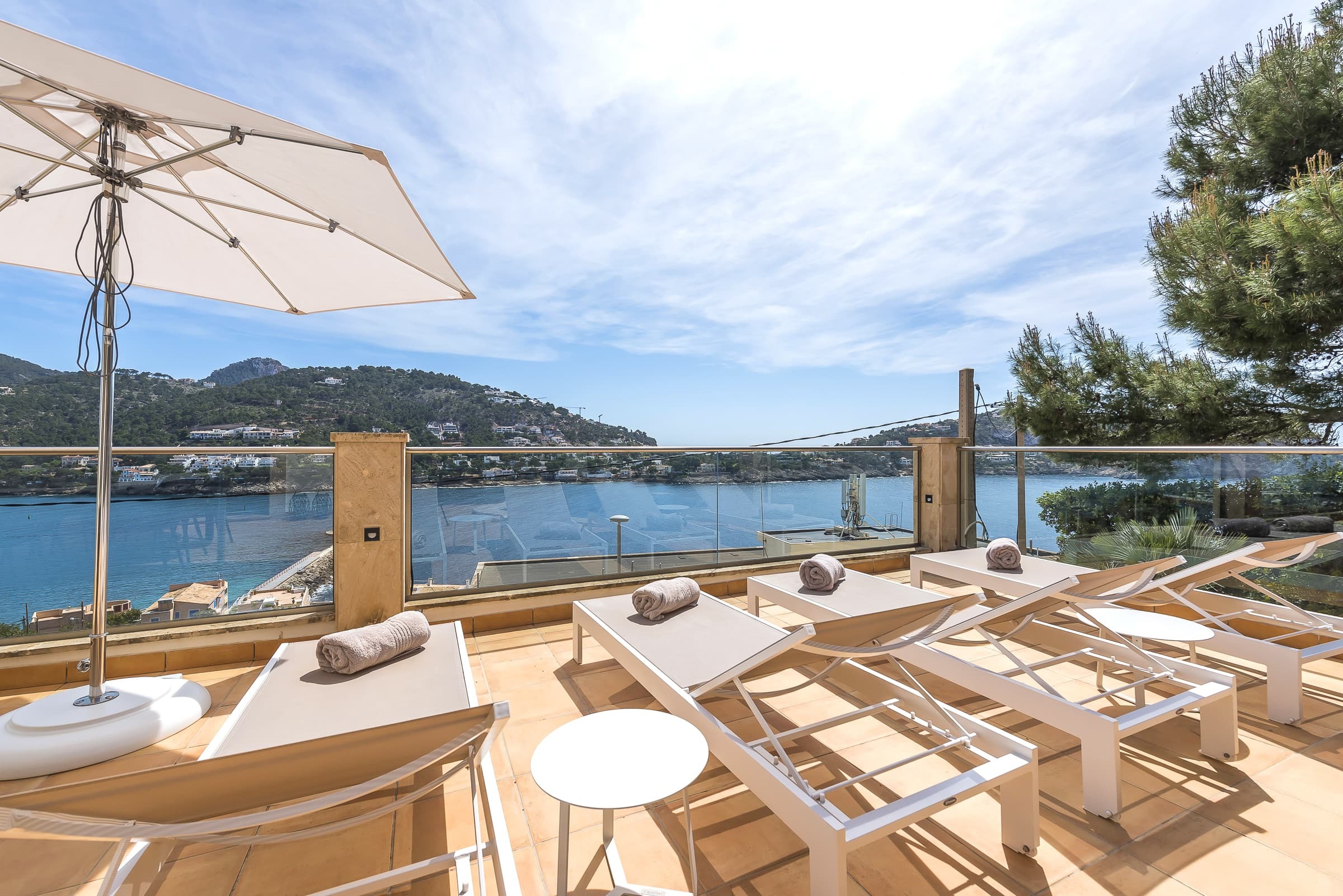 Four bedrooms are arranged to offer flexibility for families or small groups, including three double bedrooms and one single room. Several rooms enjoy direct access to private terraces with sun loungers and views across Puerto de Andratx. Discreet laundry facilities support longer, effortless stays.