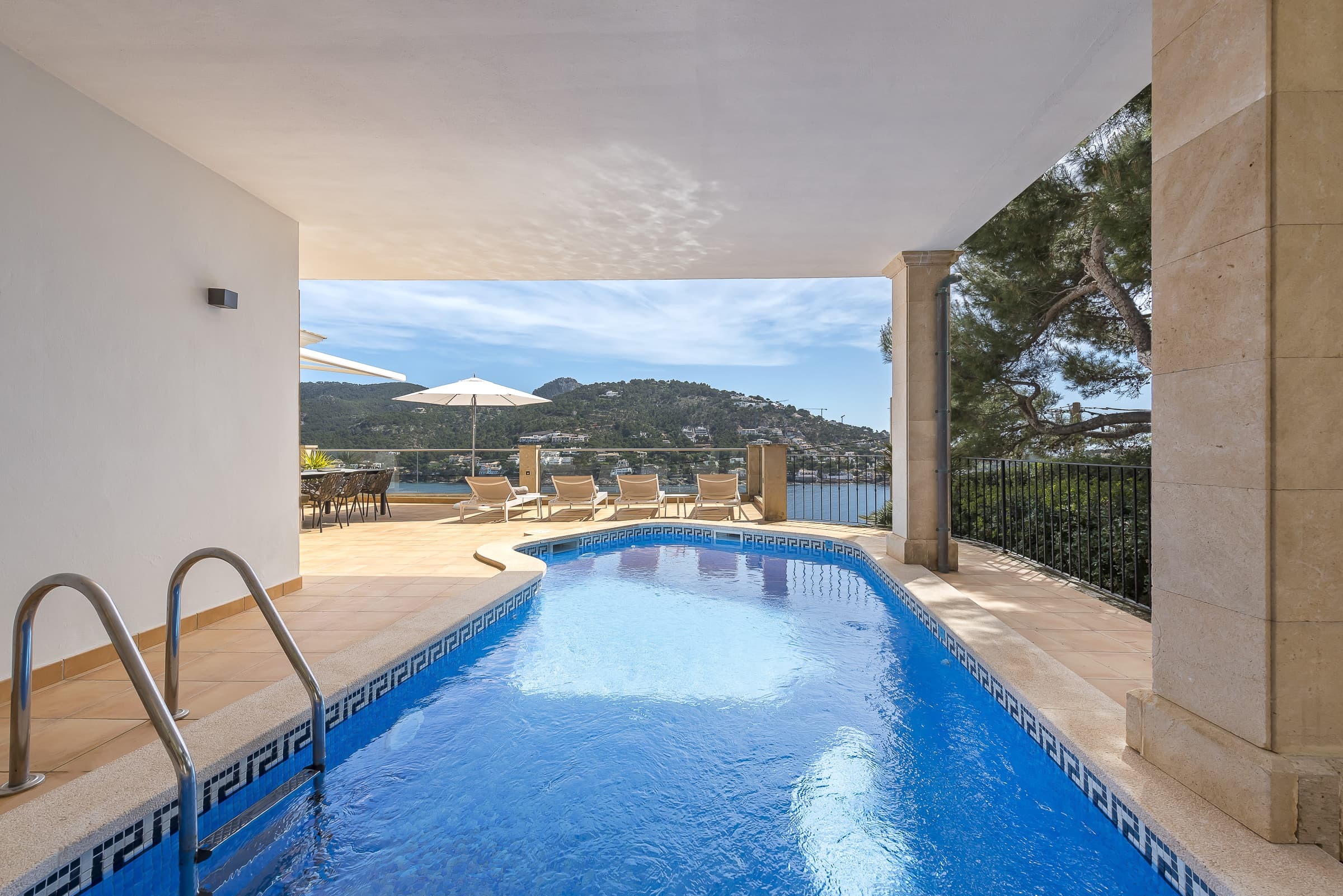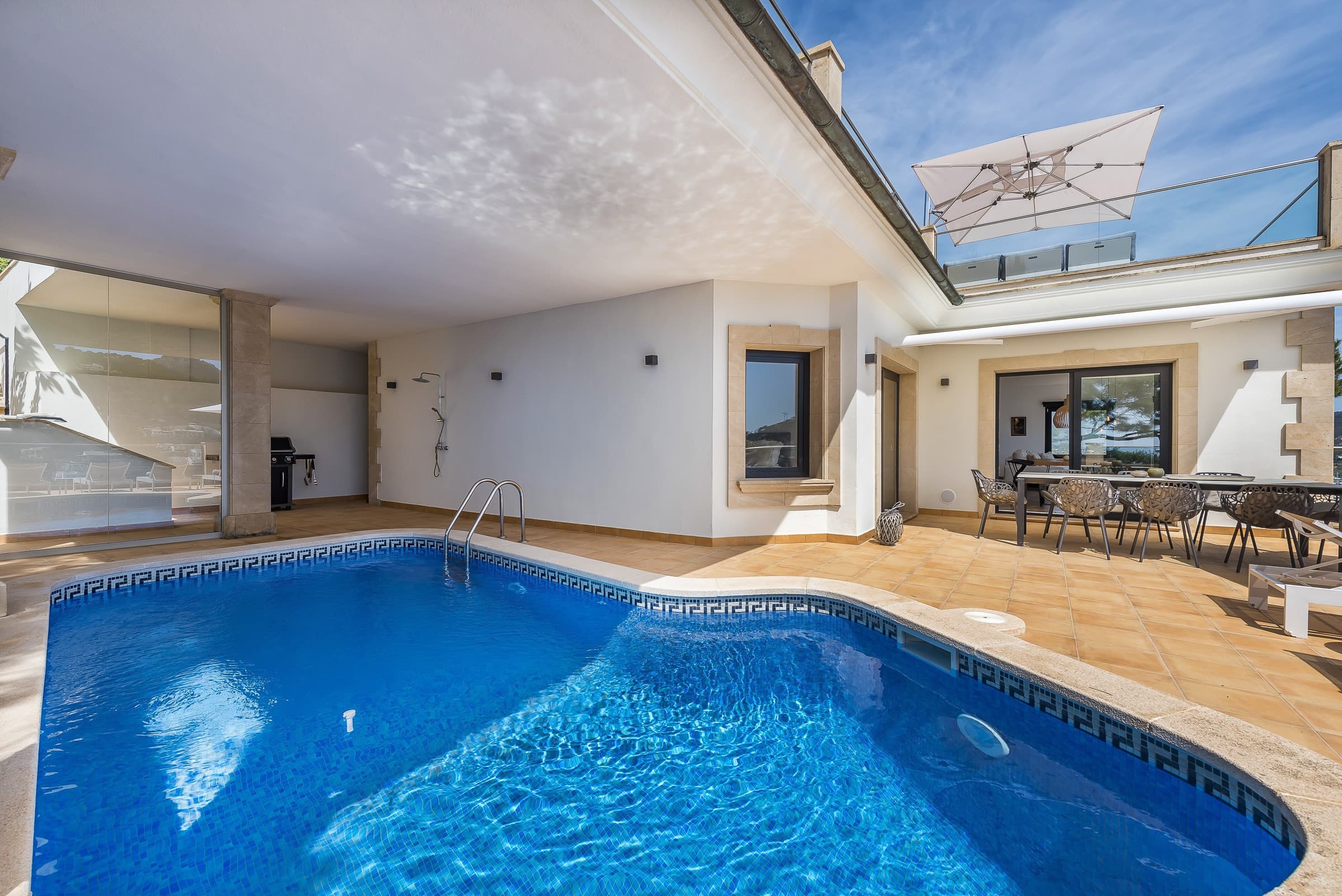 A spacious terrace with partially covered areas offers multiple zones for relaxation, including lounge seating and dining areas. The private pool sits within this space, creating a setting designed for long days under the sun and evenings overlooking the harbour.