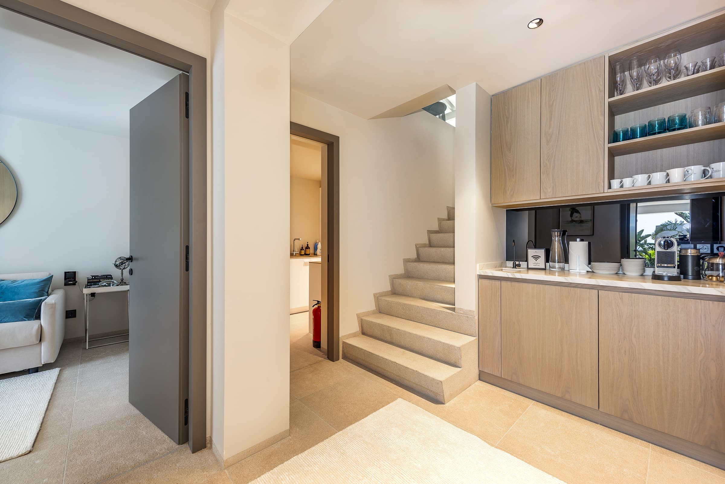 Bright, contemporary interiors defined by clean architectural lines and a calm, coastal palette. The open living areas are filled with natural light and extend seamlessly onto the terraces, creating a fluid connection between interior comfort and the surrounding sea views.