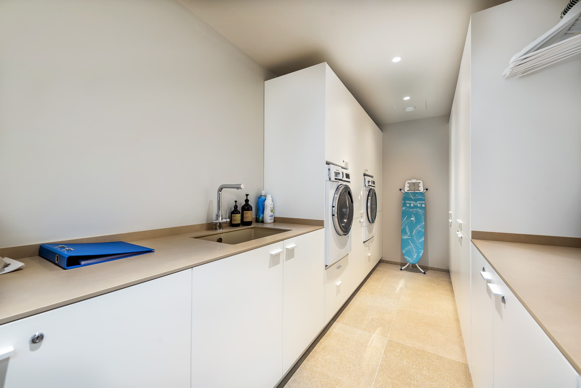 Five well-appointed bedrooms arranged to offer both flexibility and privacy, supported by four bathrooms. Each room is designed with a relaxed, understated feel, while discreet laundry facilities ensure convenience for longer stays.