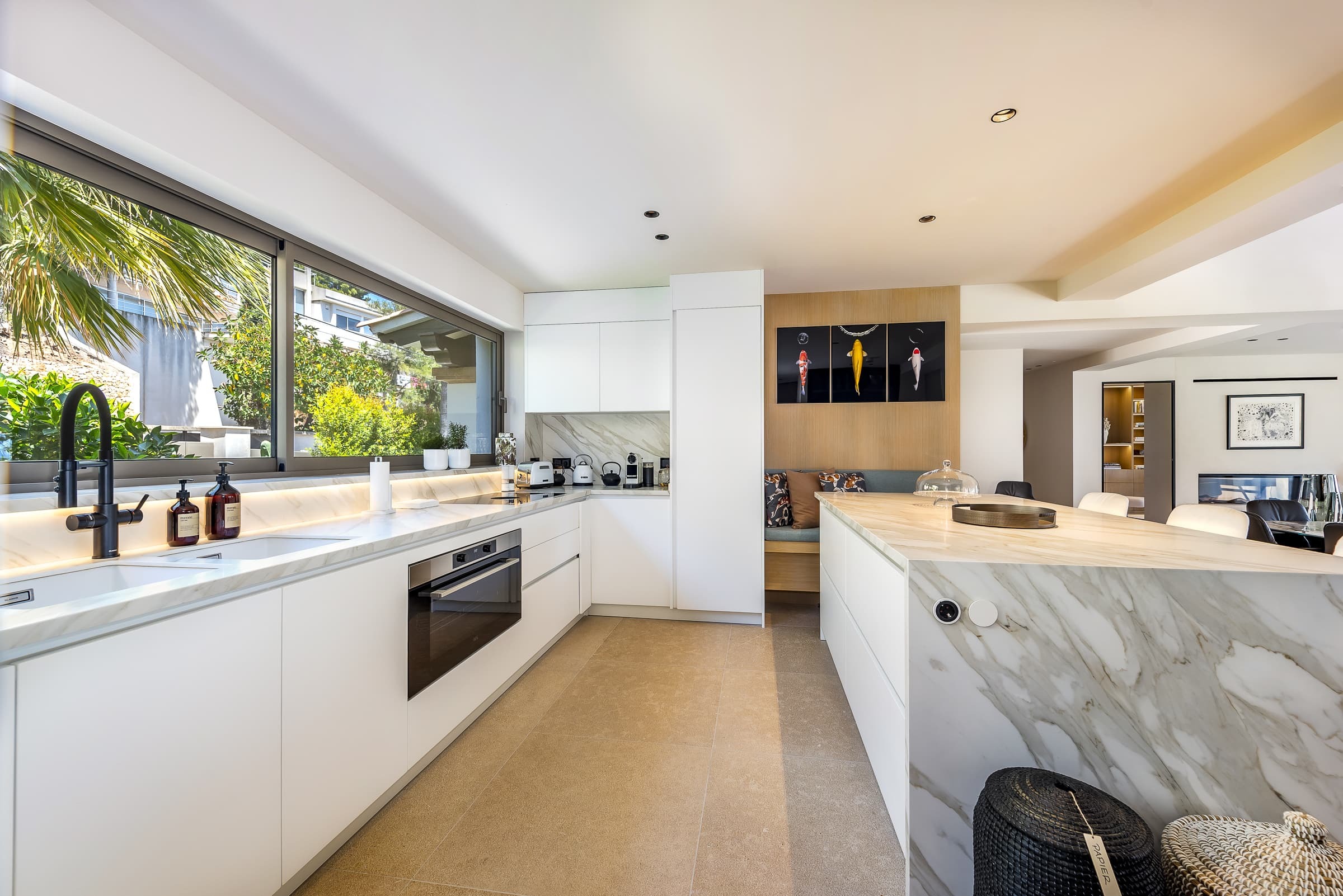 A fully equipped designer kitchen sits at the centre of the home, flowing into the dining and living areas. The adjoining veranda and outdoor dining spaces allow meals to move effortlessly between inside and out, from casual breakfasts to relaxed evening gatherings.