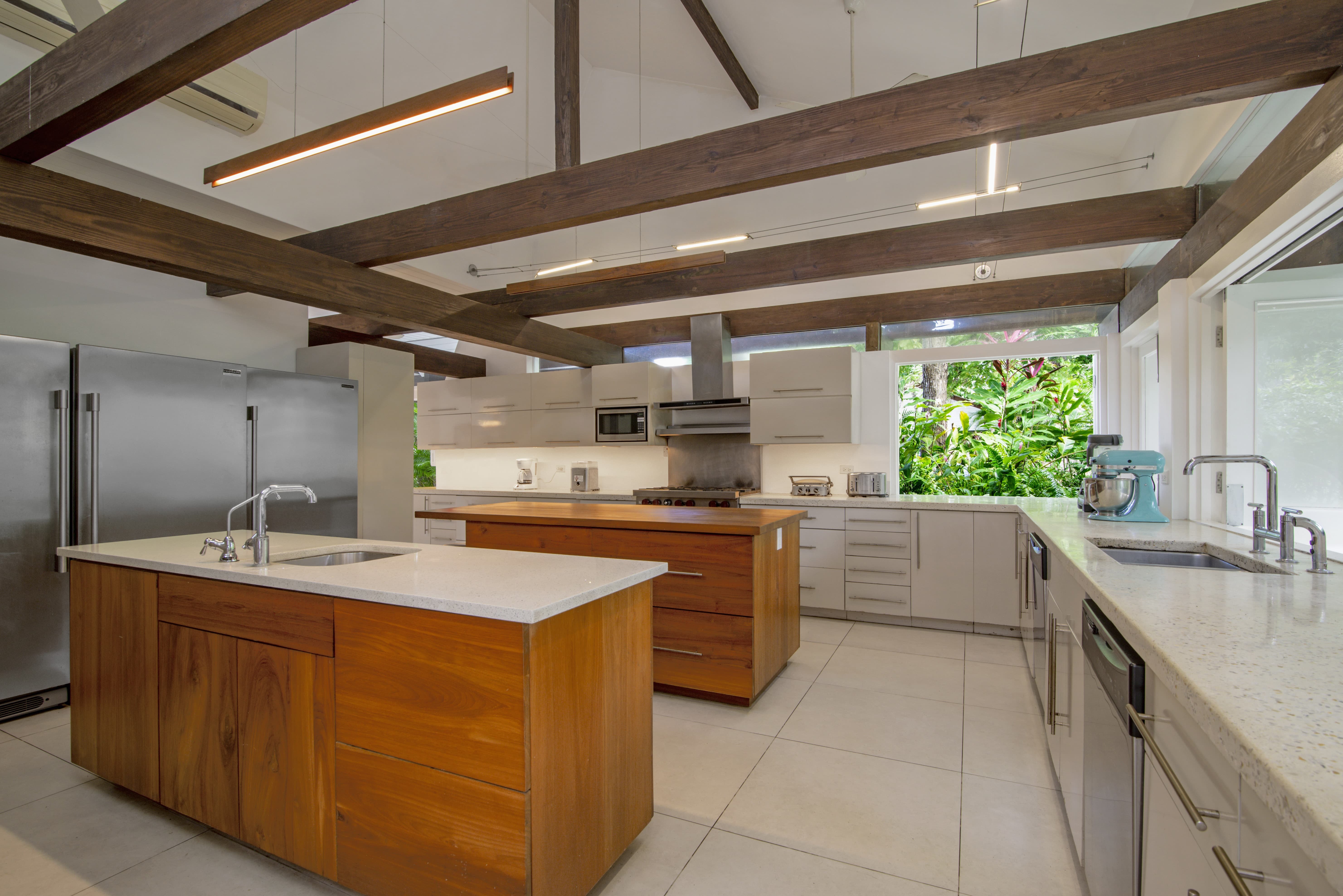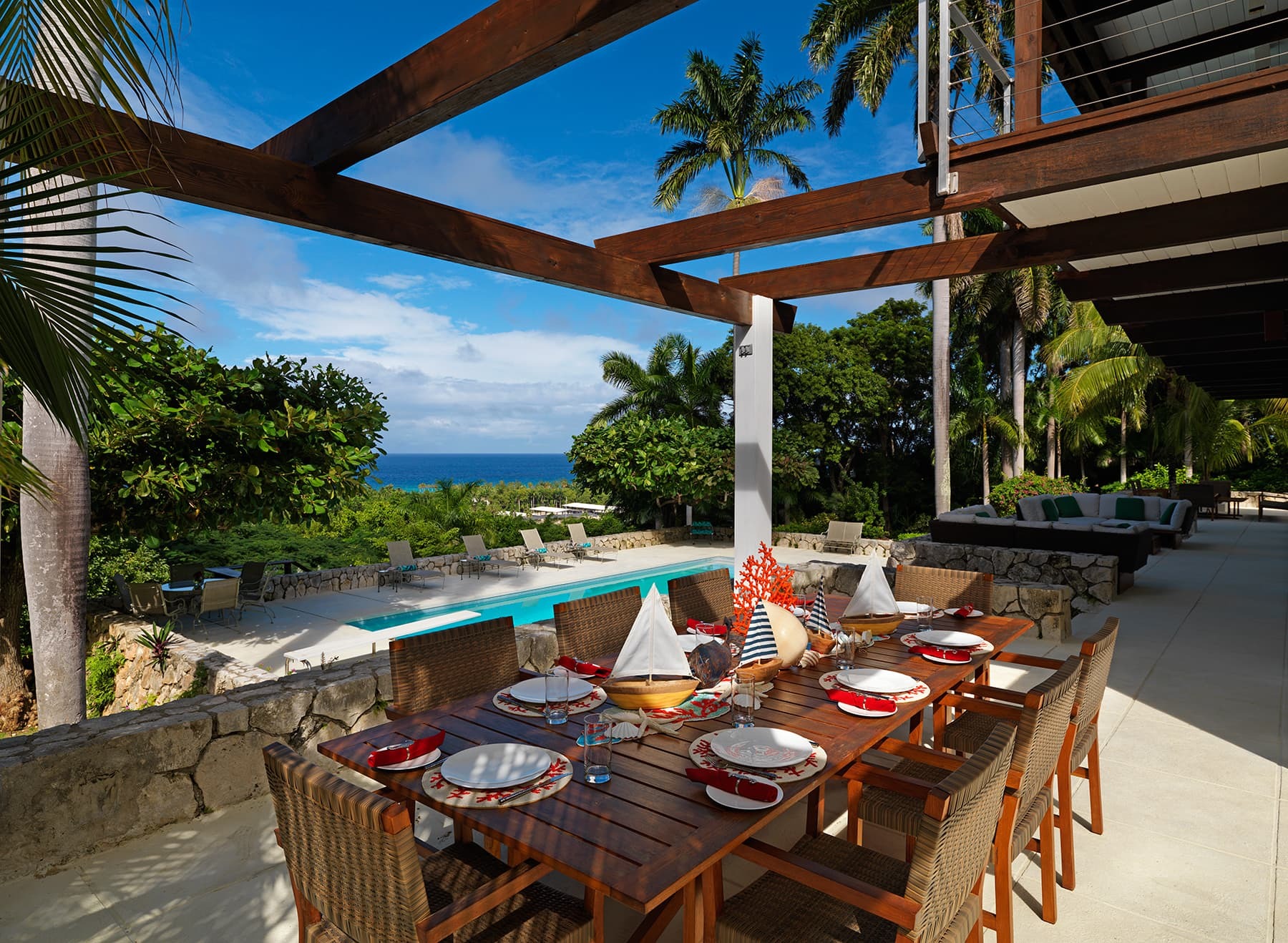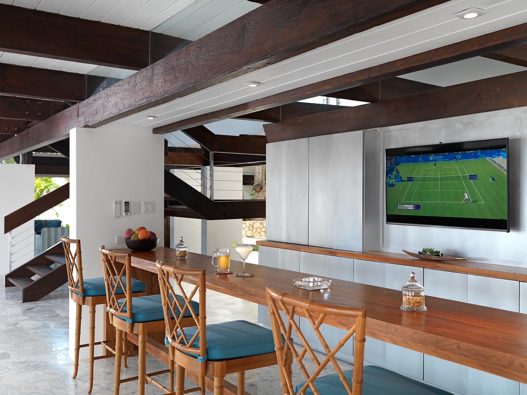 A sleek, modern kitchen sits at the heart of the home, fully equipped for private chef service or informal group cooking. A contemporary bar area encourages easy gatherings, while indoor dining spaces are complemented by outdoor dining terraces where meals are enjoyed with ocean views and cooling breezes.