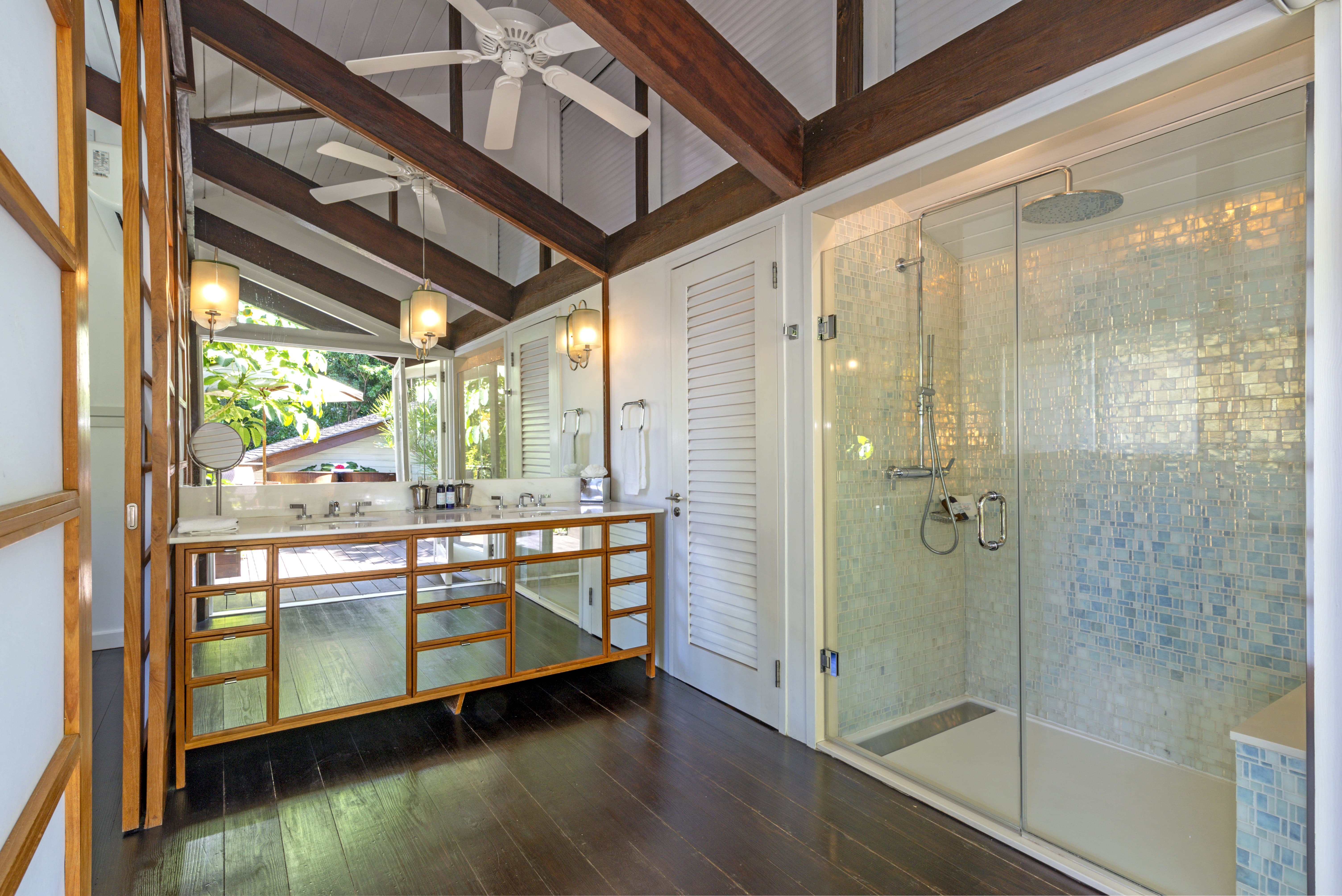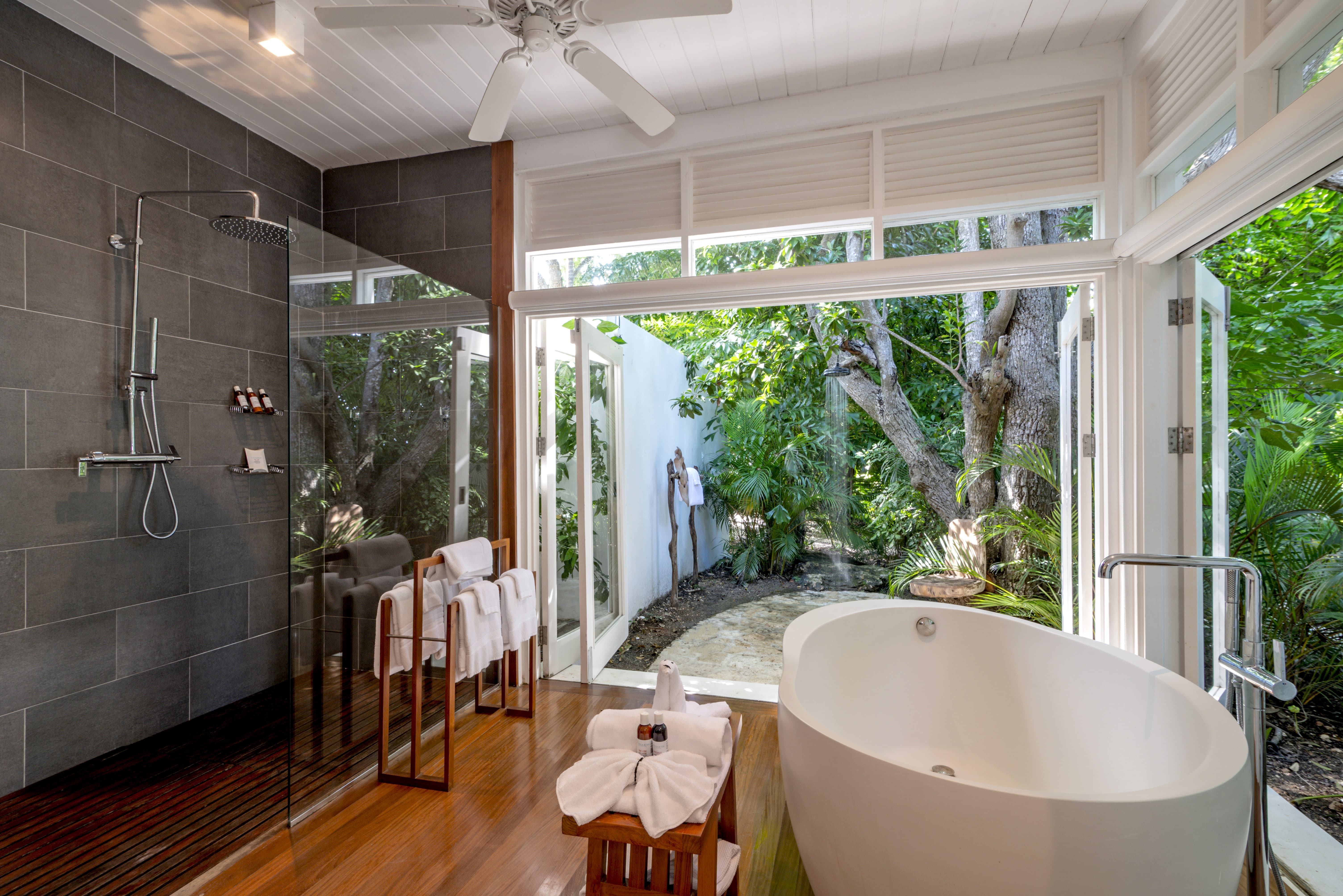 Bathrooms throughout the villa are spa inspired and luxuriously finished. Features include walk in showers, soaking tubs, and outdoor bathtubs and showers that connect guests directly to the surrounding landscape. The experience is restorative, private, and indulgent.