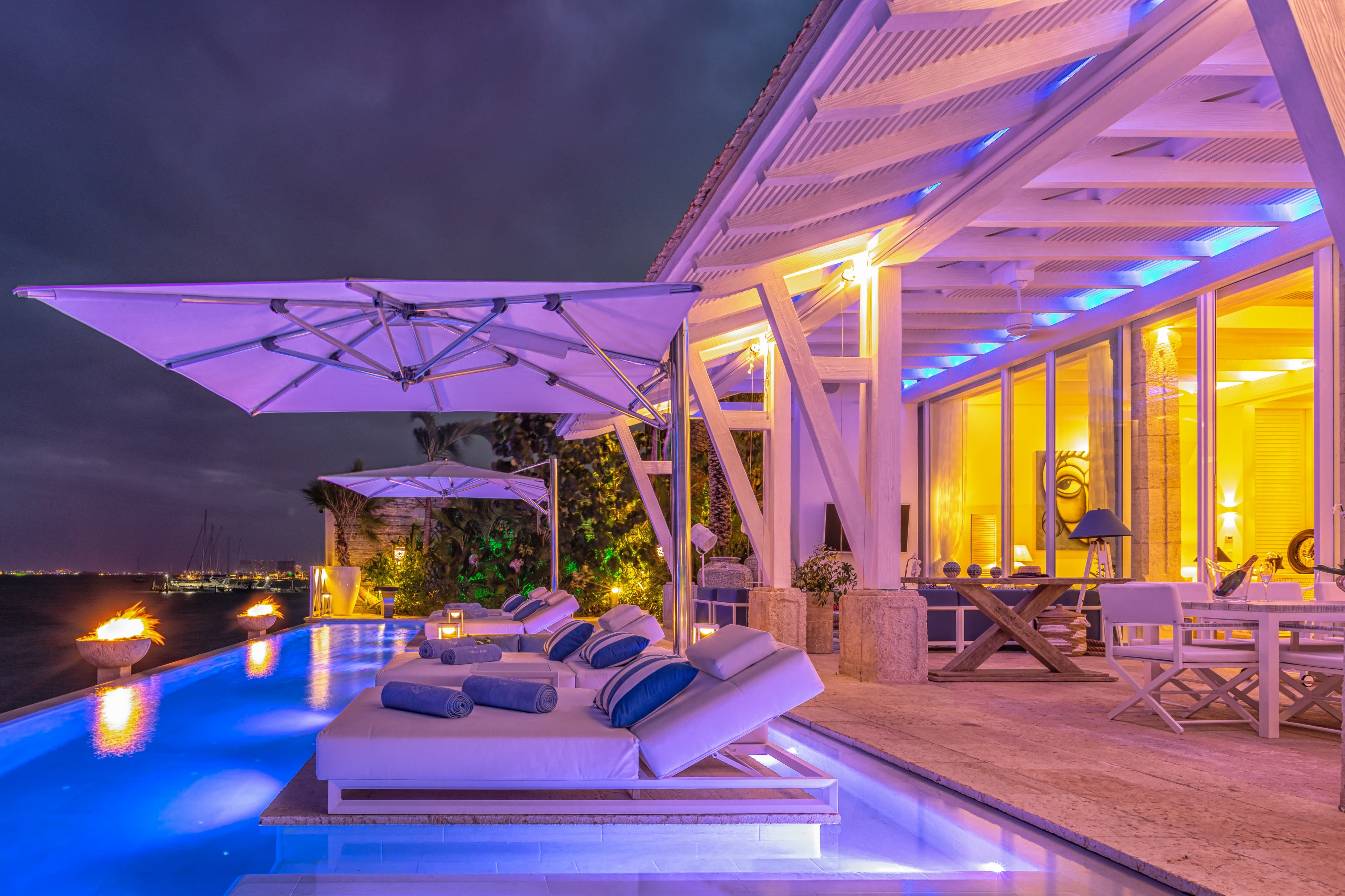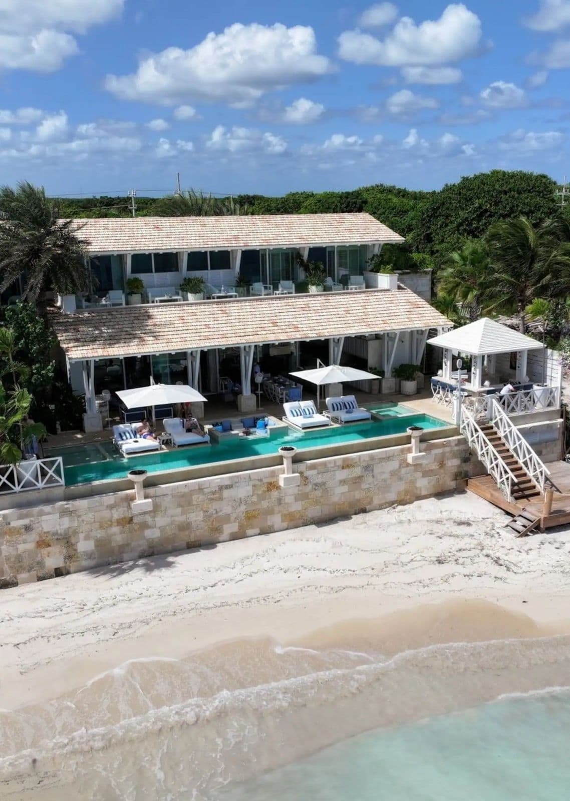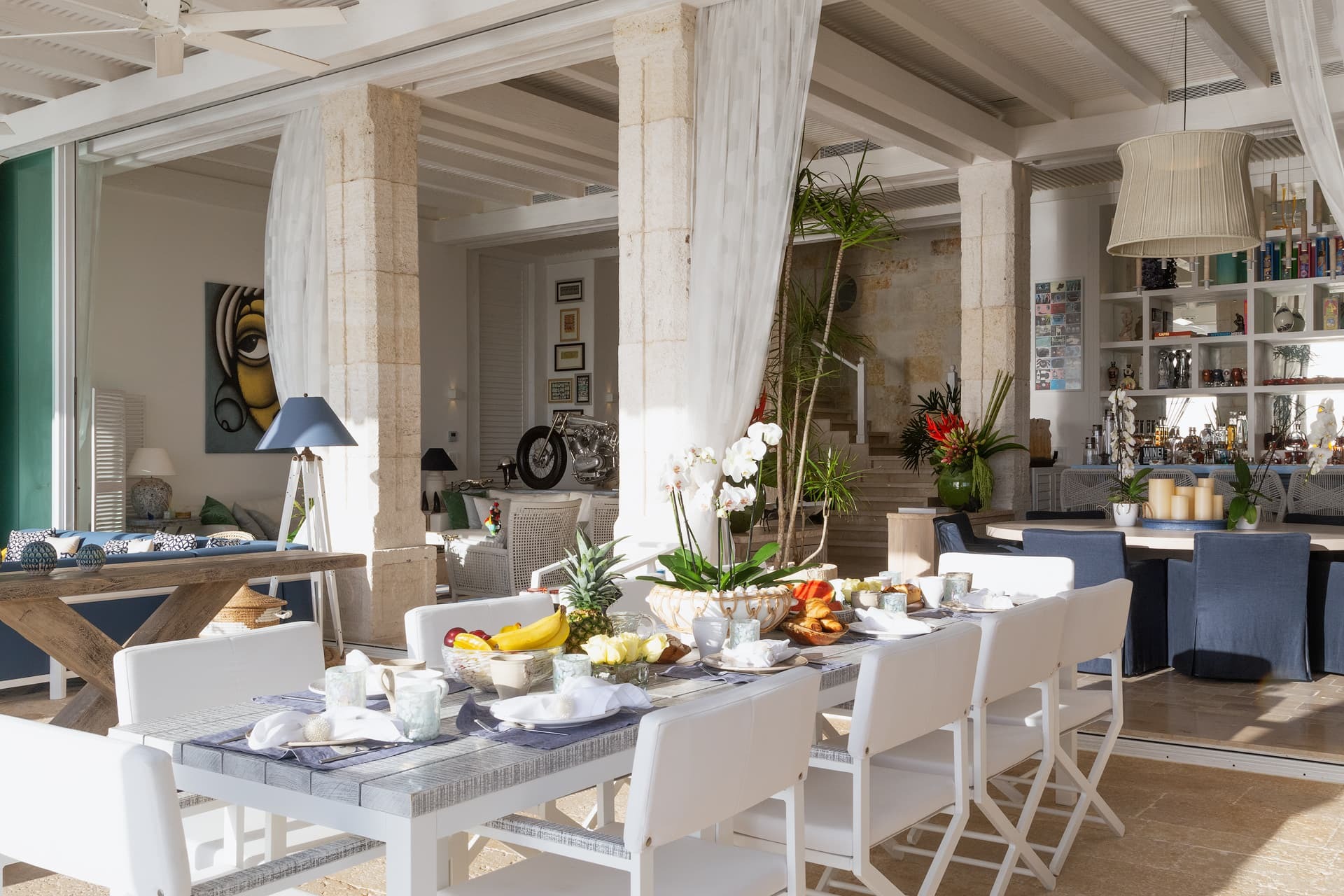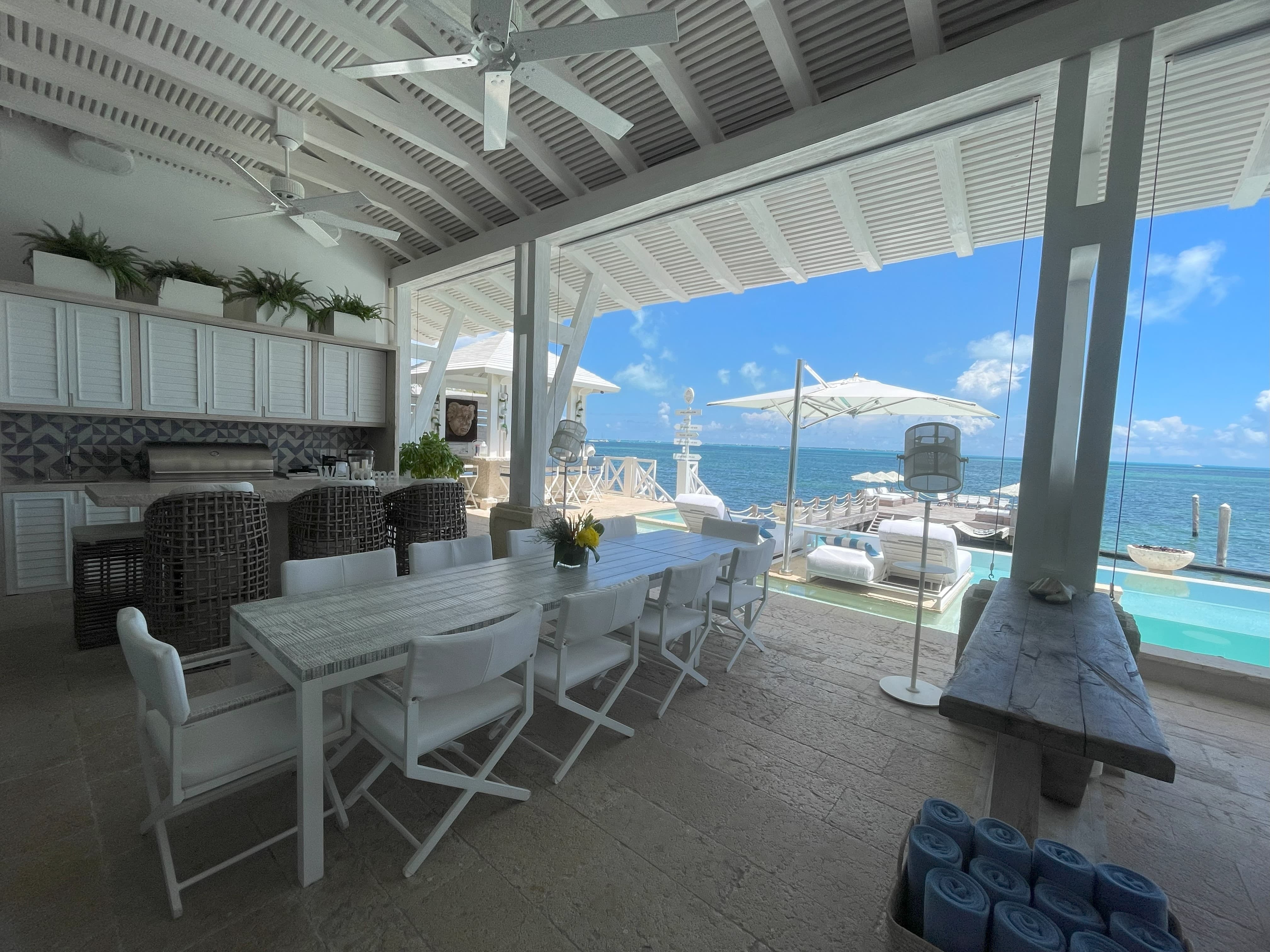 A fully equipped kitchen supports both private chef service and casual use, complemented by a formal indoor dining area and multiple alfresco dining spaces. Outdoor dining areas and the oceanfront bar make every meal feel relaxed and celebratory, whether enjoying long lunches or sunset dinners by the sea.