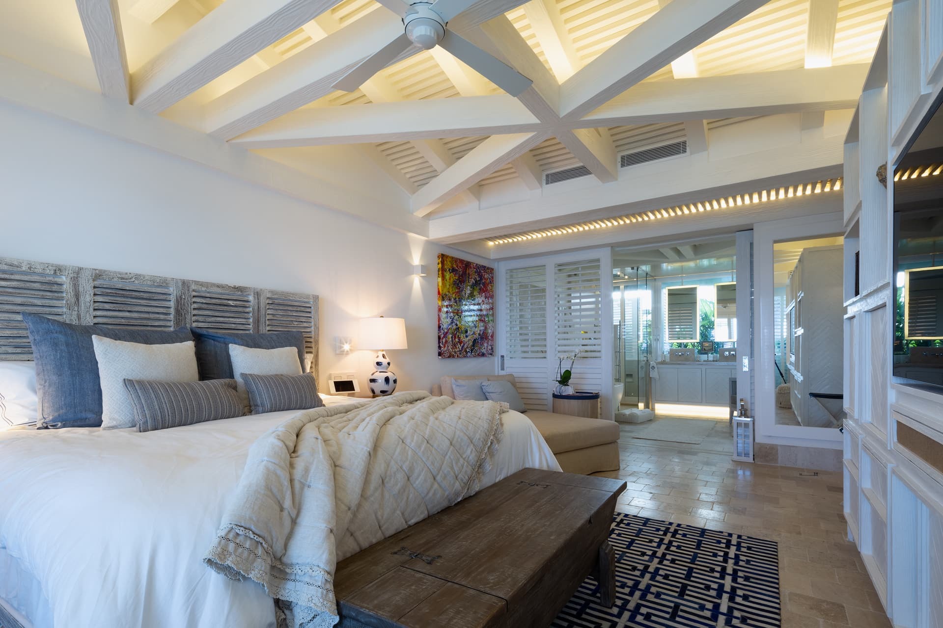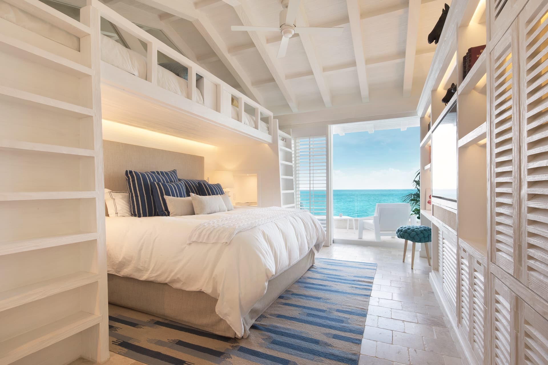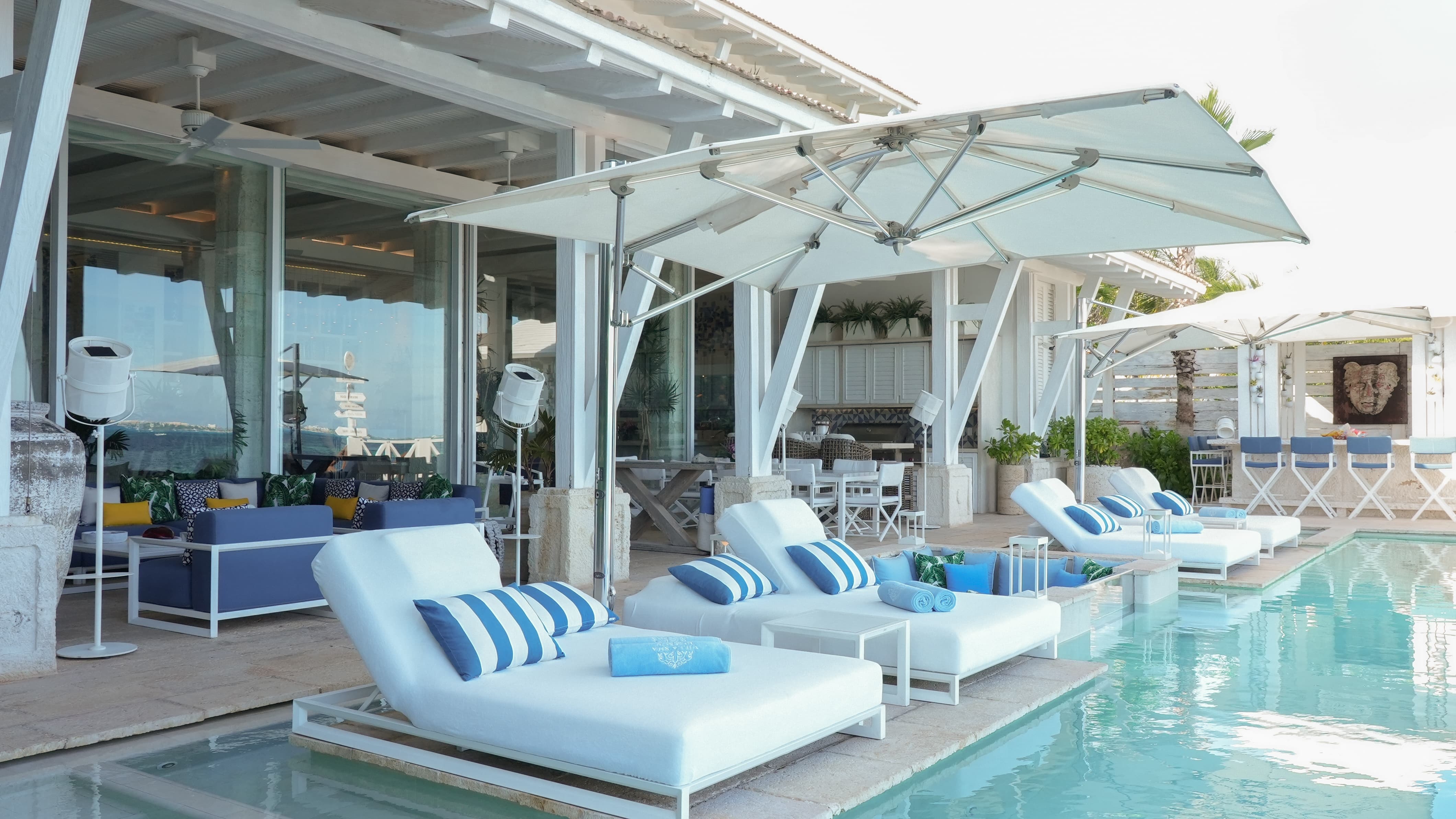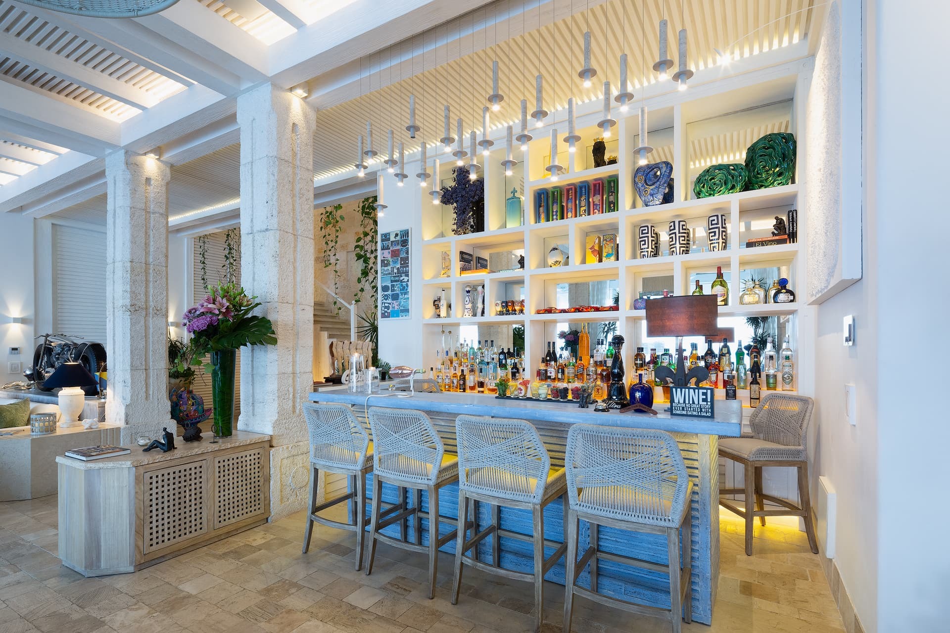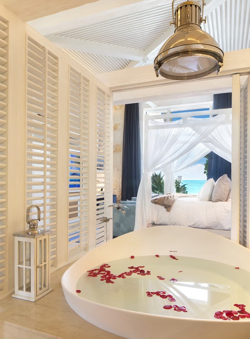 Villa Sha is designed around expansive, ocean facing living areas that flow effortlessly between indoors and out. Generous lounges, a formal dining space, and a stylish indoor bar are arranged to maximise views across the Caribbean Sea, creating an inviting setting for socialising while still offering quiet corners for relaxation.