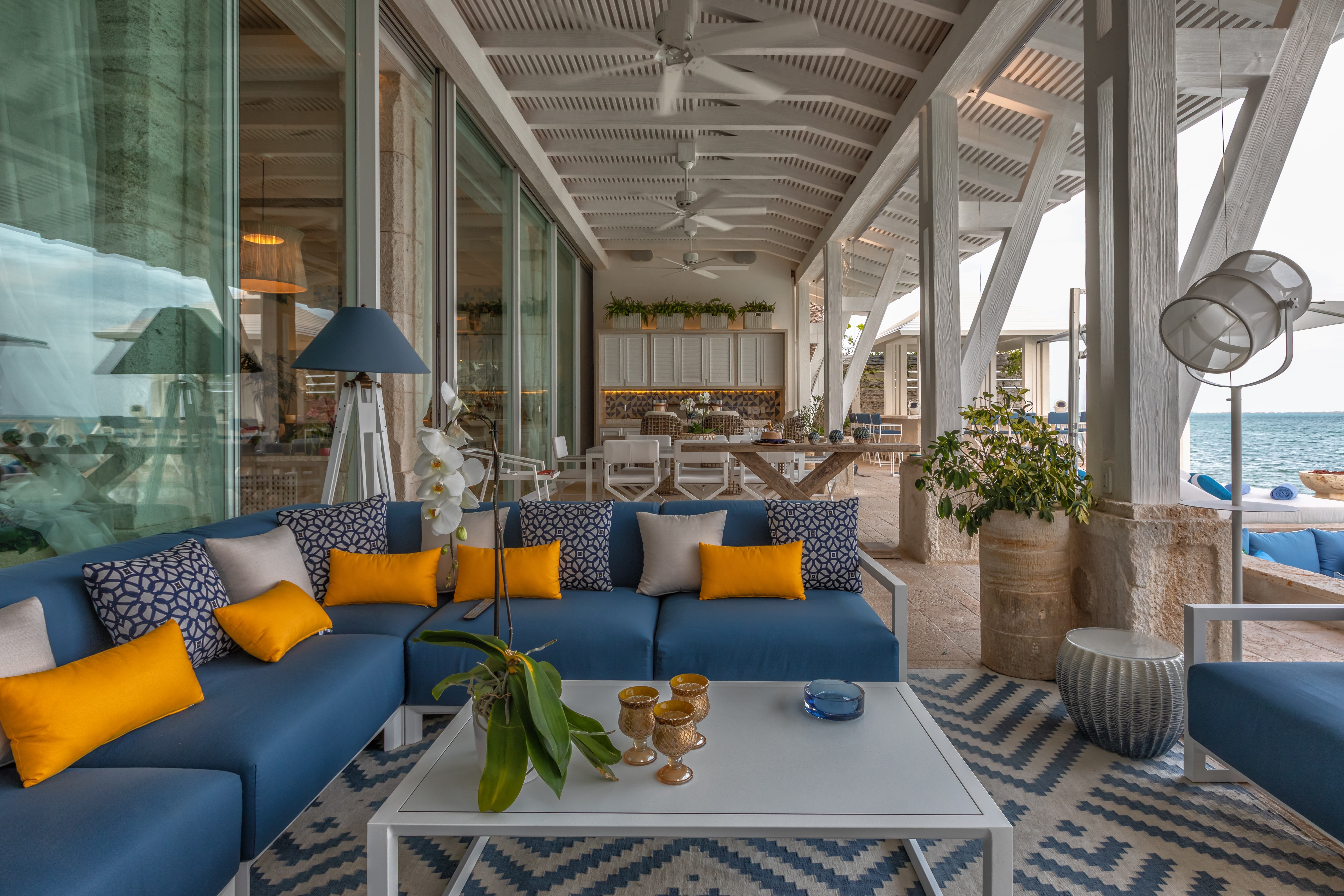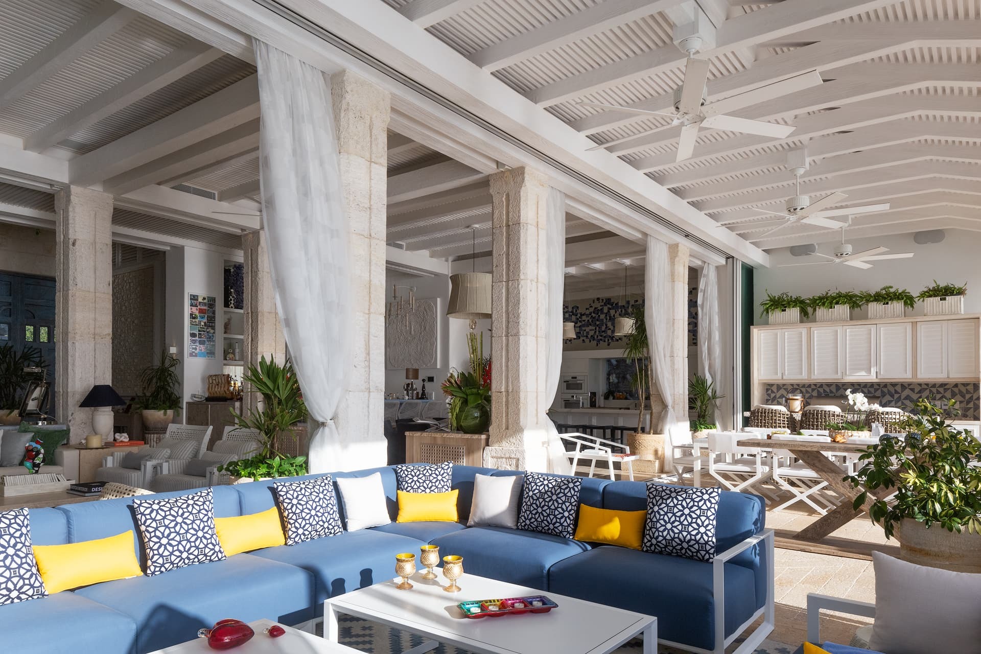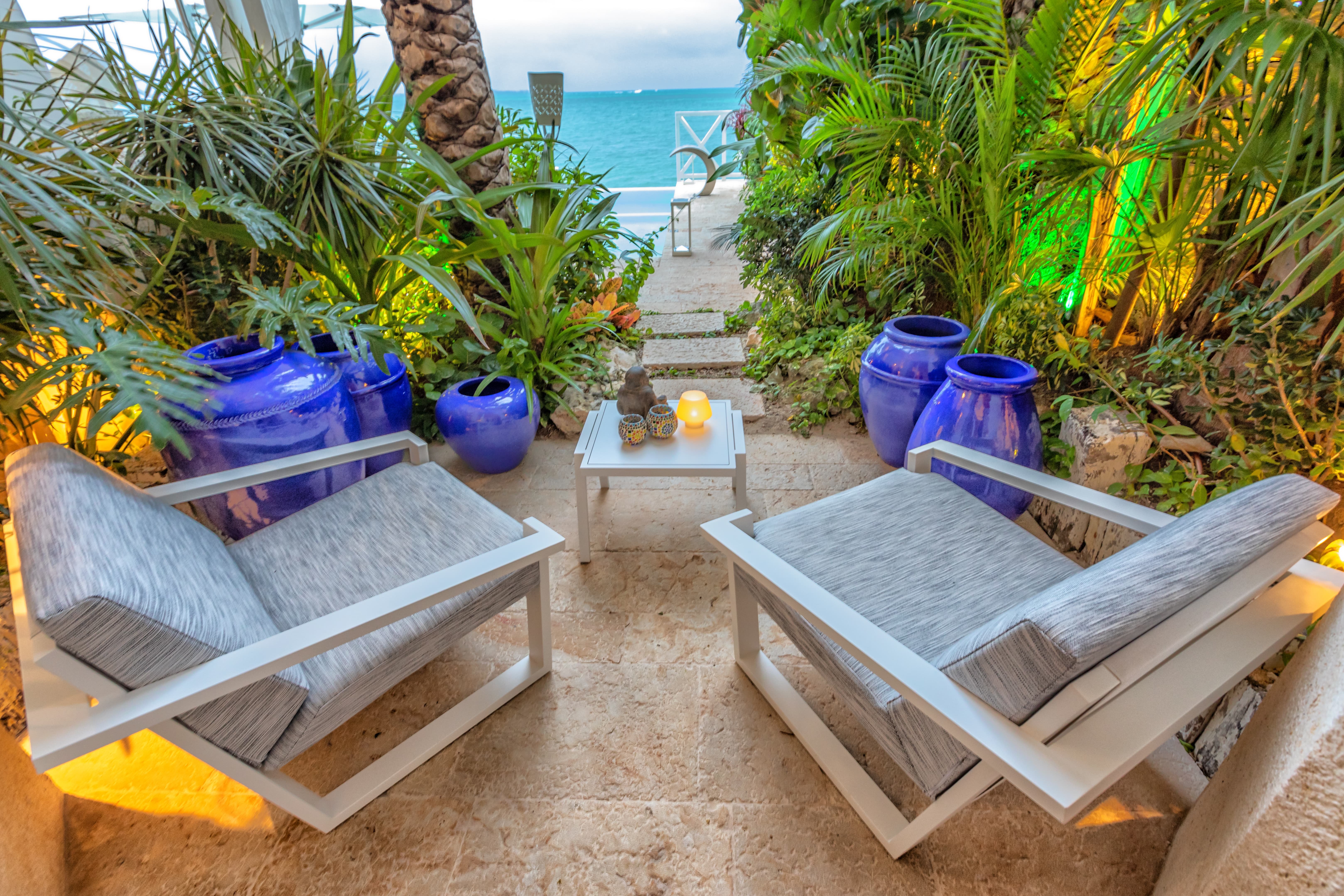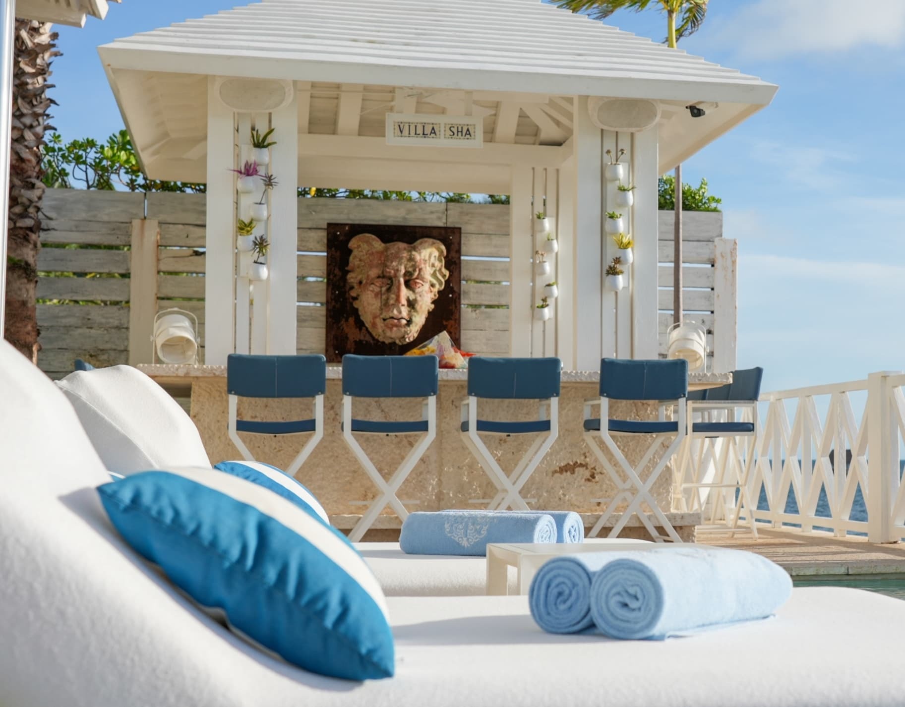 Villa Sha is designed around expansive, ocean facing living areas that flow effortlessly between indoors and out. Generous lounges, a formal dining space, and a stylish indoor bar are arranged to maximise views across the Caribbean Sea, creating an inviting setting for socialising while still offering quiet corners for relaxation.