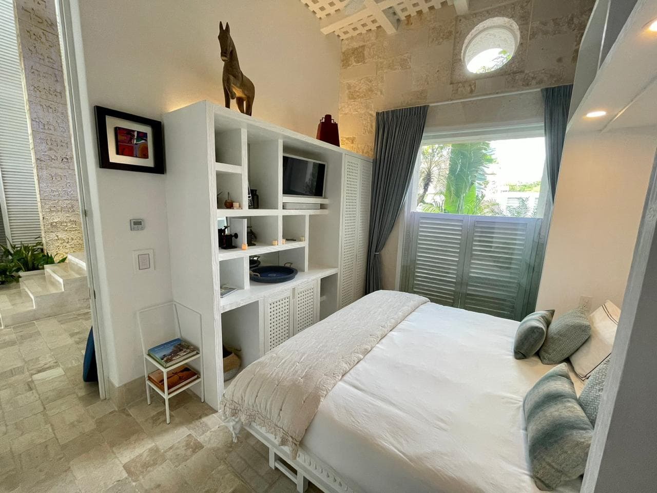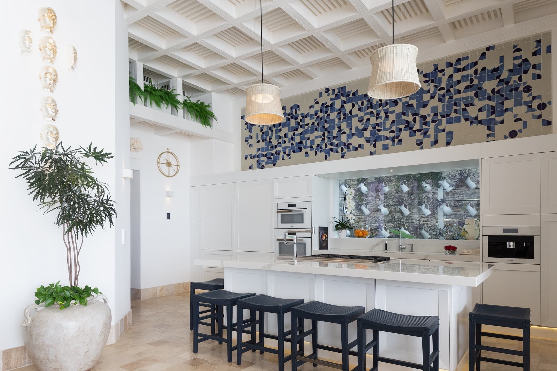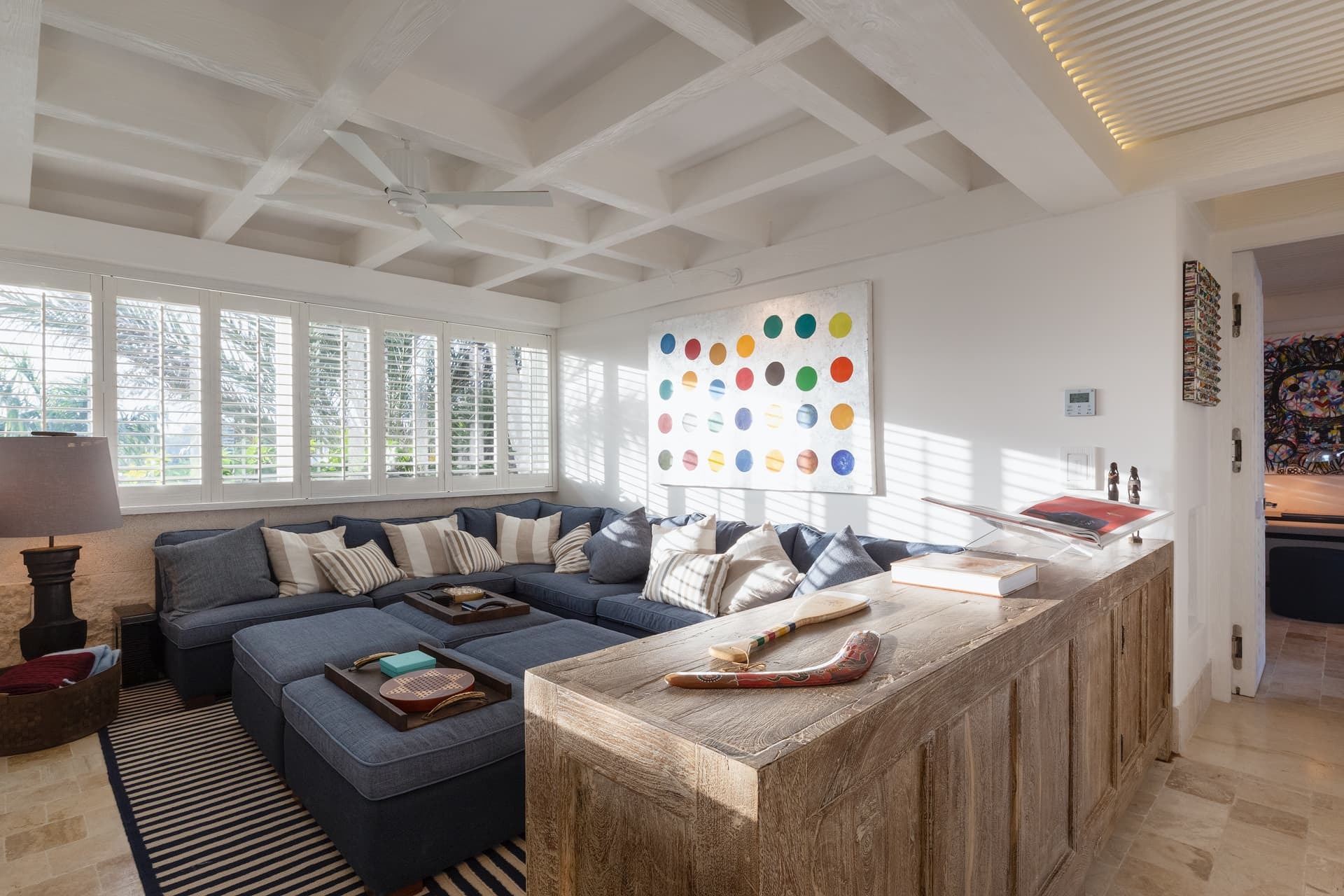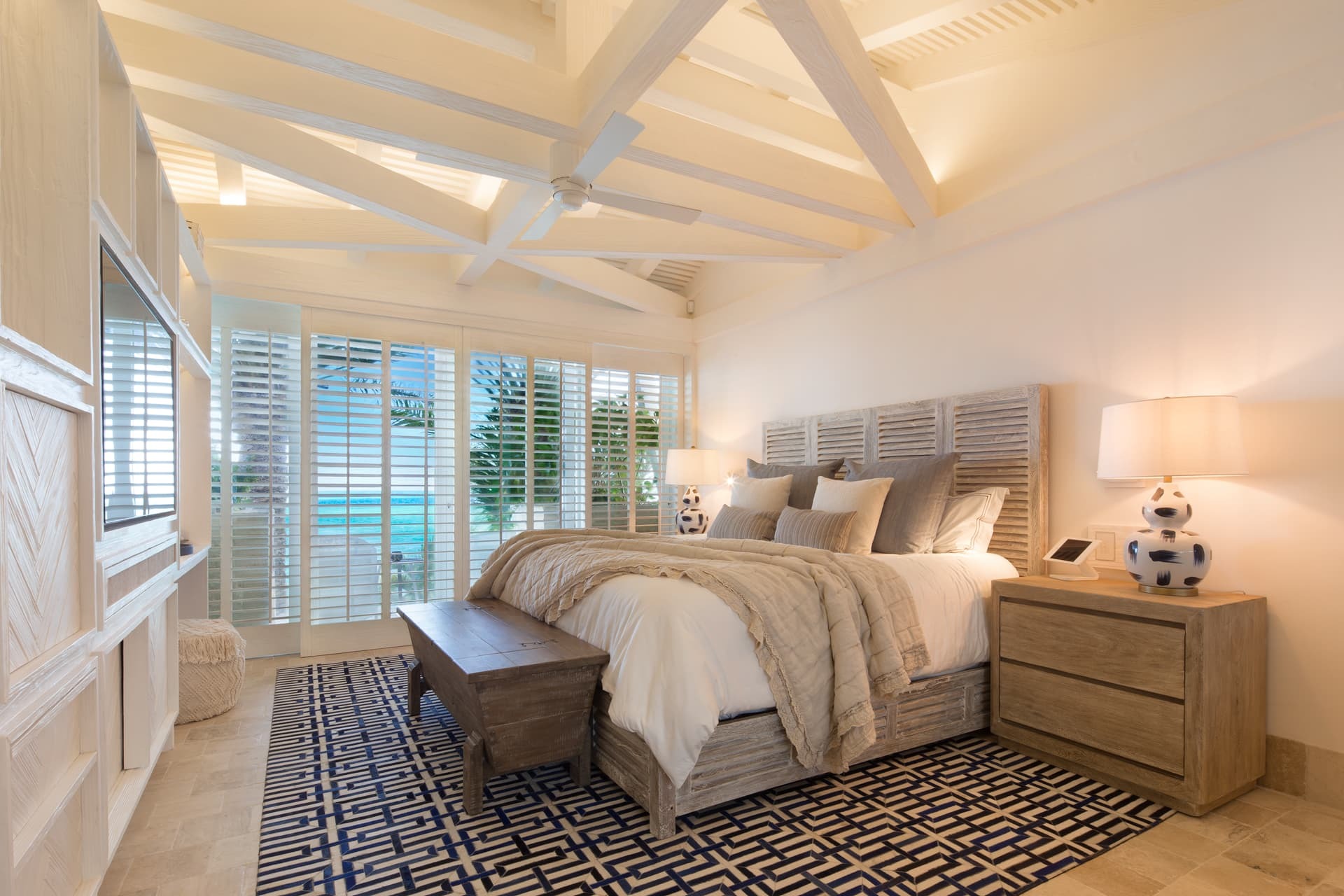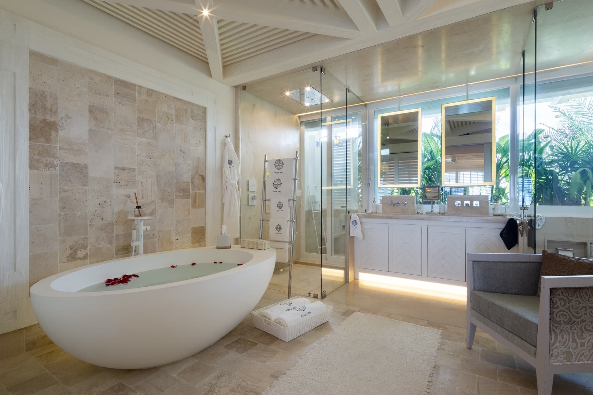 Villa Sha is designed around expansive, ocean facing living areas that flow effortlessly between indoors and out. Generous lounges, a formal dining space, and a stylish indoor bar are arranged to maximise views across the Caribbean Sea, creating an inviting setting for socialising while still offering quiet corners for relaxation.