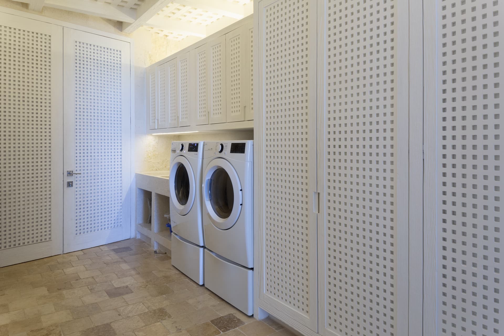Air conditioning and ceiling fans run throughout the villa, maintaining a comfortable climate year round. Ocean breezes and shaded terraces enhance natural cooling, particularly across the outdoor living areas.