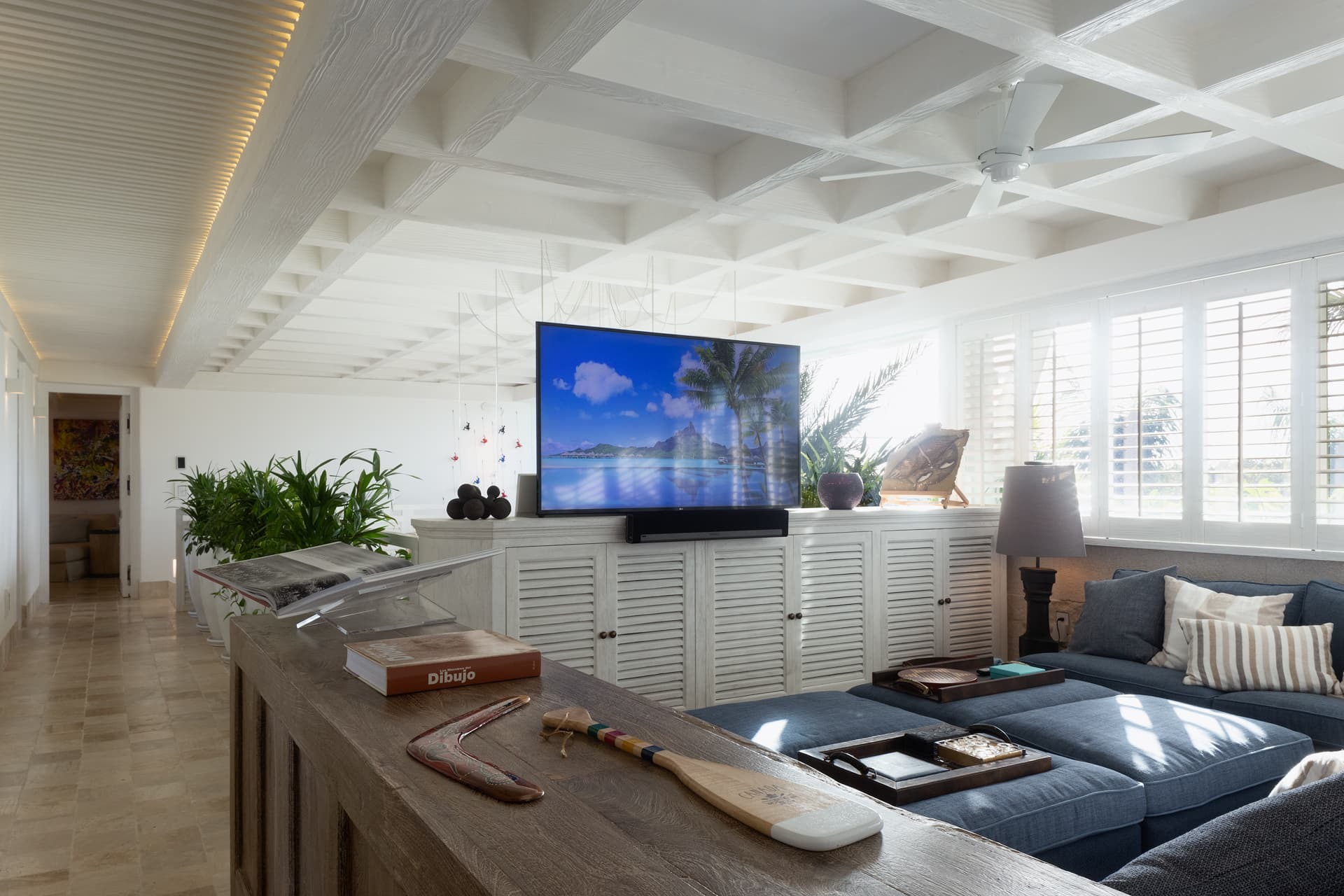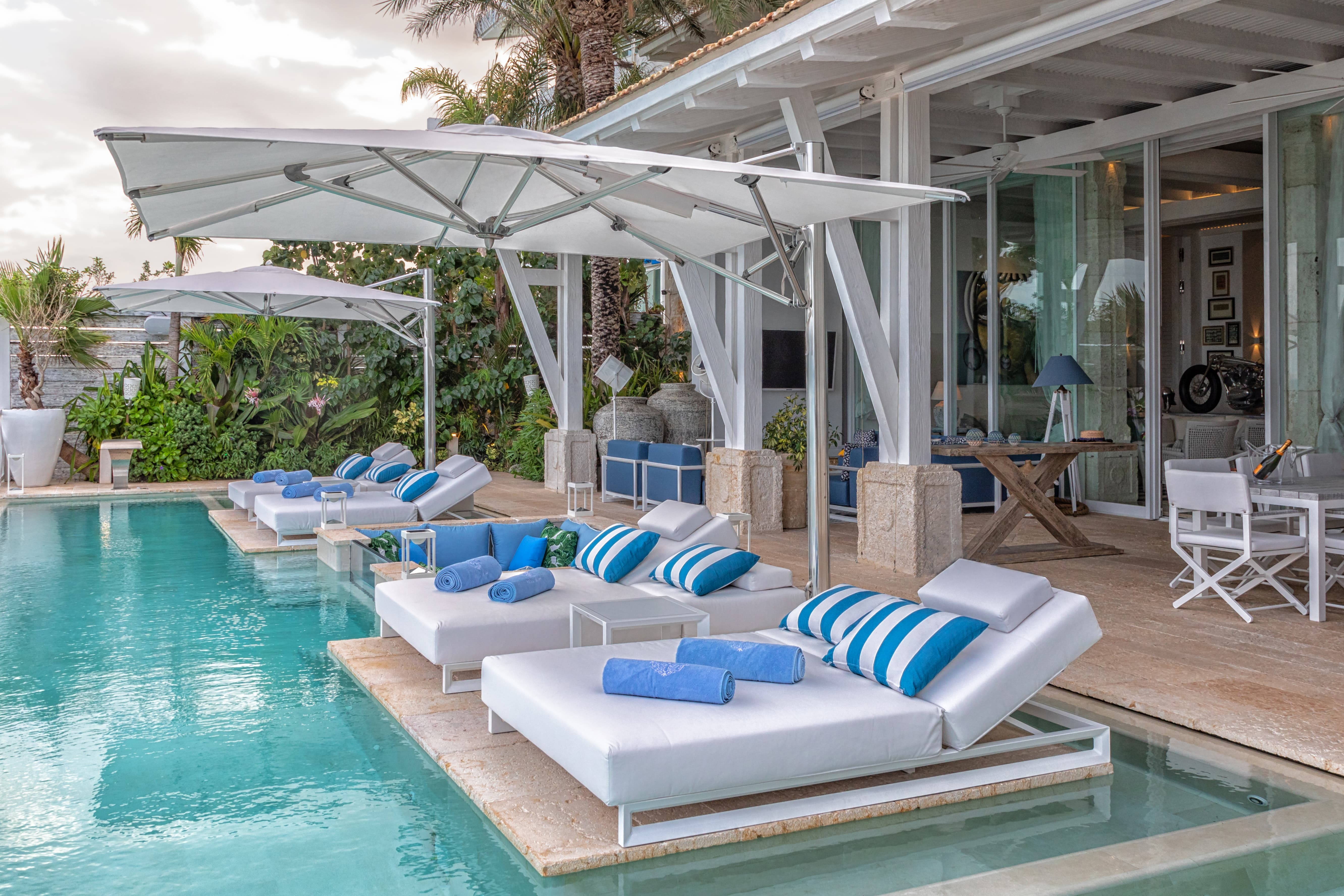 Entertainment is woven throughout the villa, with smart televisions in each bedroom, surround sound systems, and integrated Sonos audio indoors and outdoors. iPads and smart room controls allow guests to manage lighting, sound, and comfort with ease. Outdoor spaces are equally suited to social gatherings, with music flowing naturally from terrace to pool.