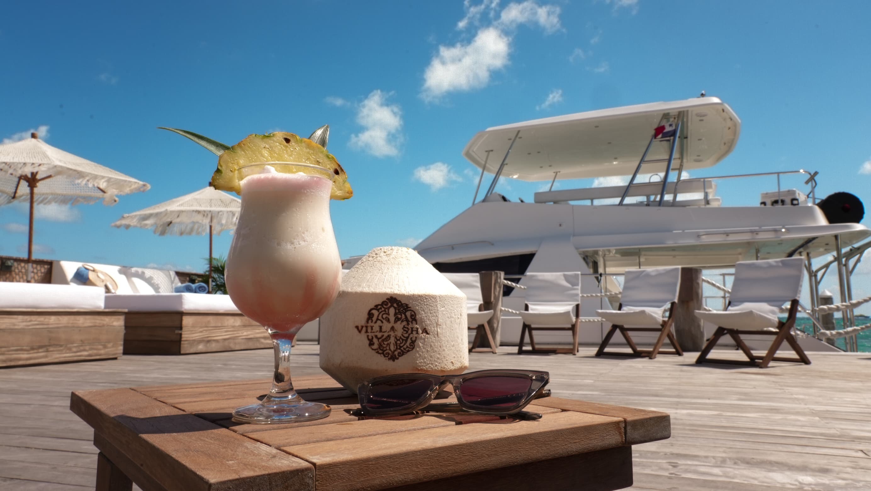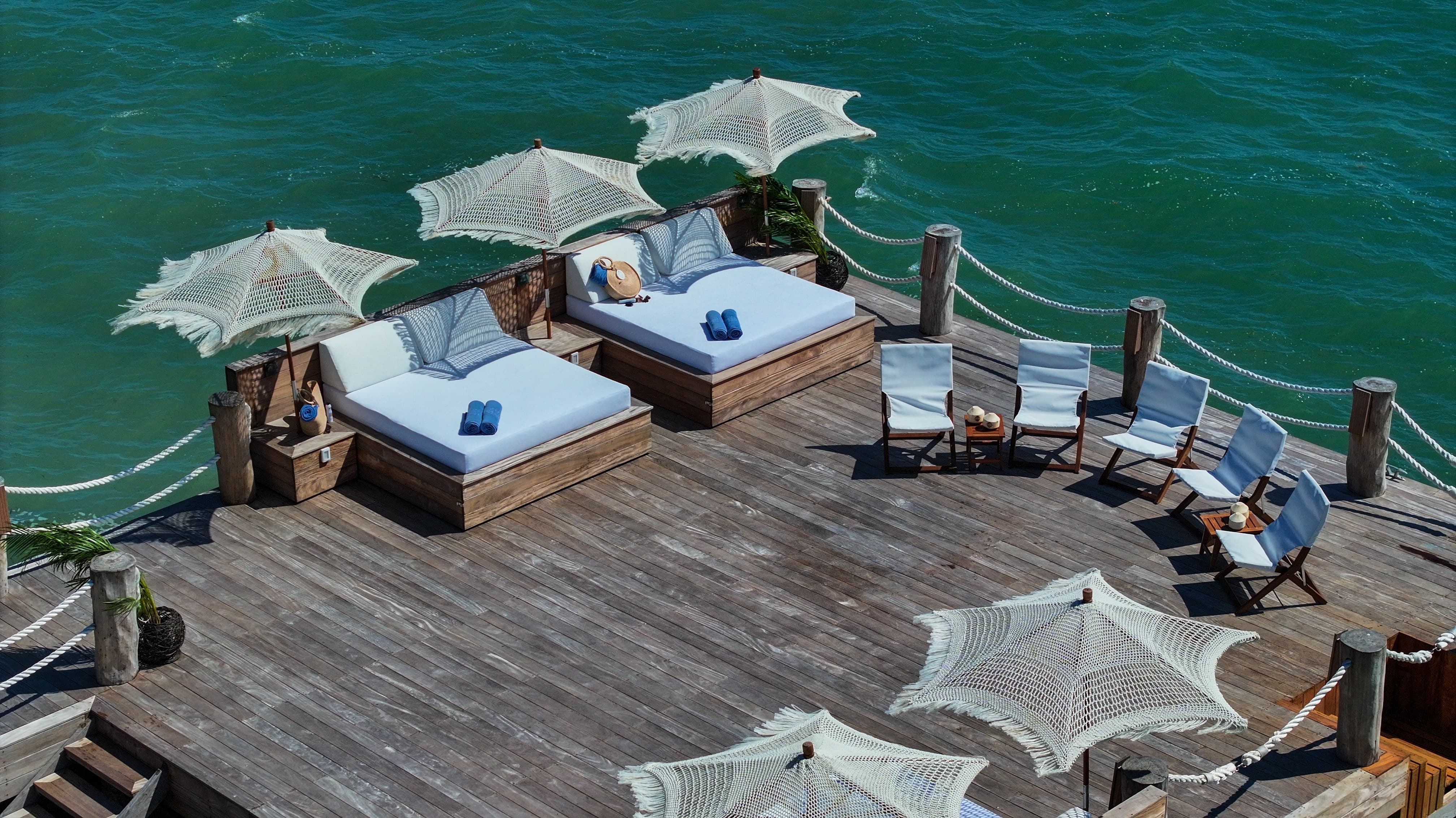 Outdoor living defines the Villa Sha experience. A vast oceanfront terrace includes an infinity pool, jacuzzi, kiddy wading area, pool bar, lounge spaces, and dining areas. Direct beach access leads to soft sand and calm waters, while a private sundeck and yacht dock with overwater hammocks create a truly unique setting. Kayaks, paddle boards, and outdoor showers complete the experience.