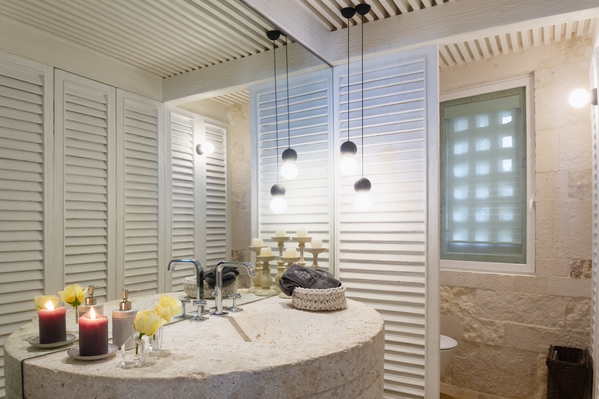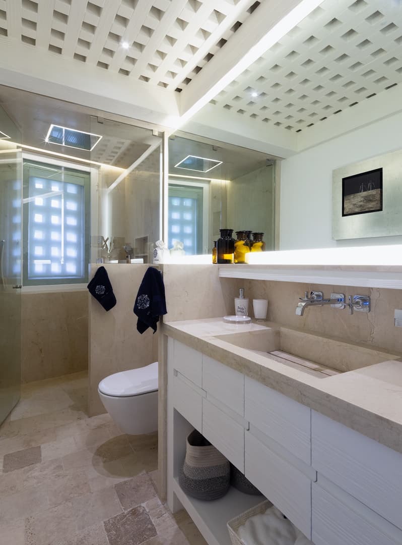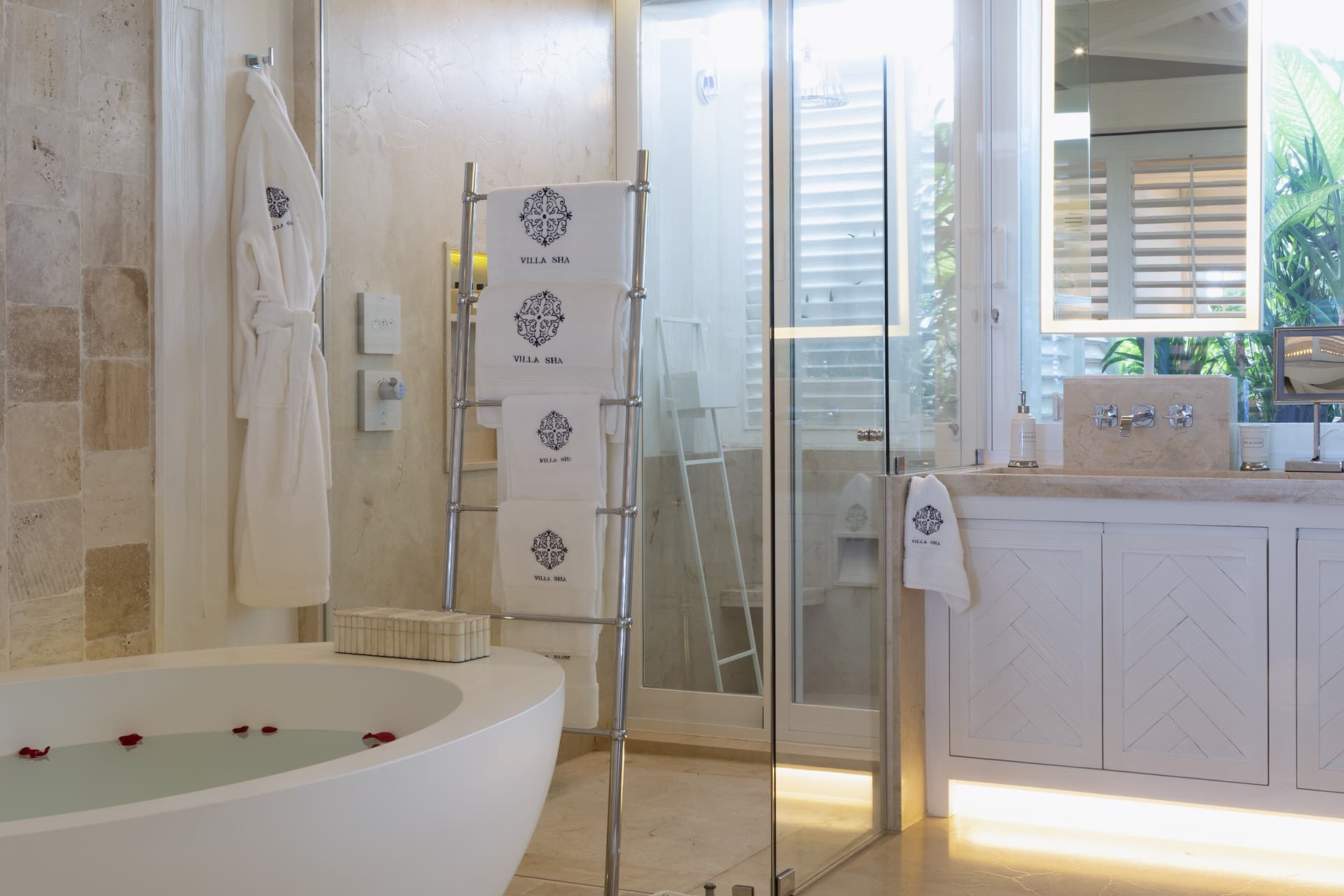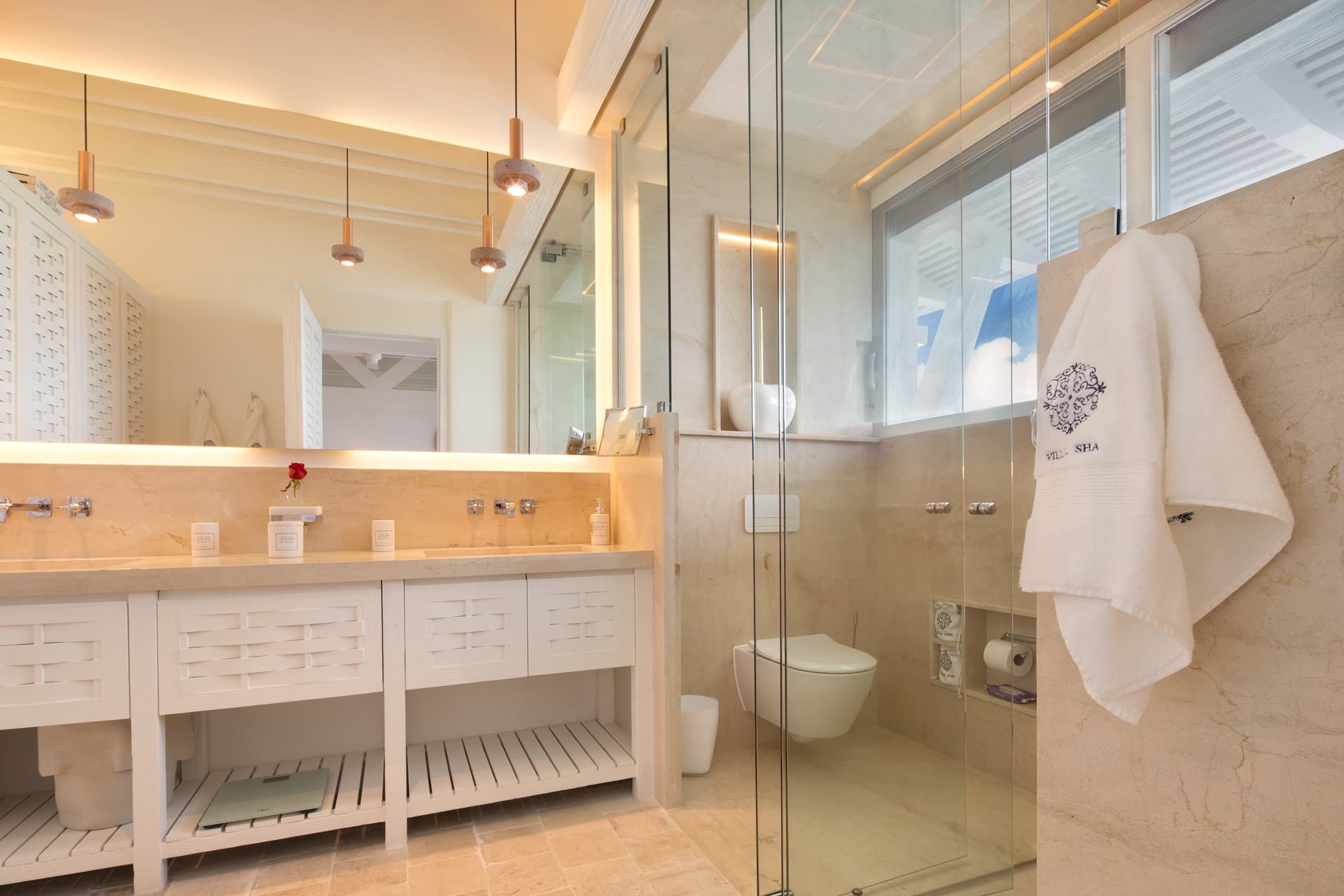 Each bedroom features a private ensuite bathroom with rainfall showers, dual vanities, and premium finishes. Several suites also include freestanding bathtubs and exterior showers, adding a spa like quality to the experience. High quality toiletries, bathrobes, and thoughtful amenities are provided throughout.