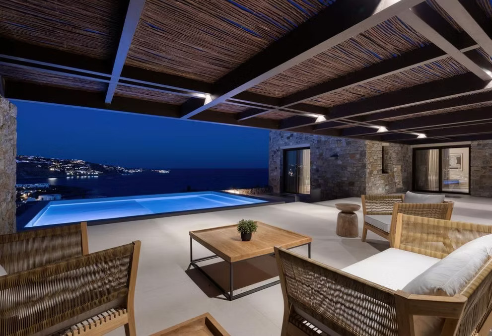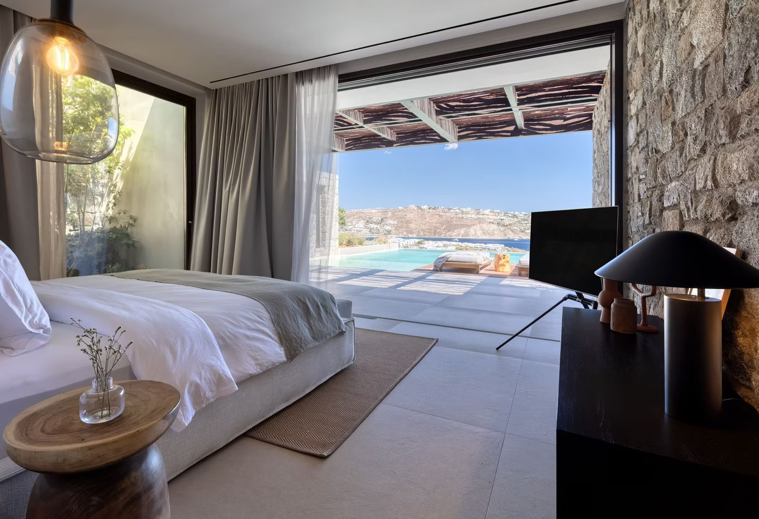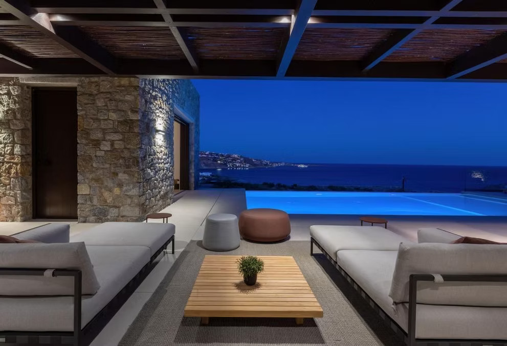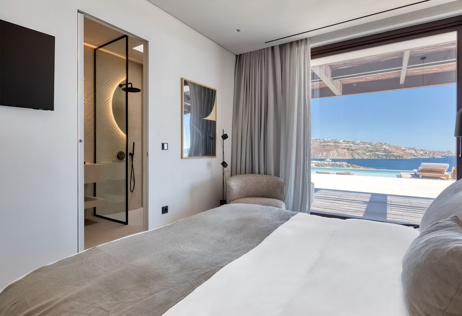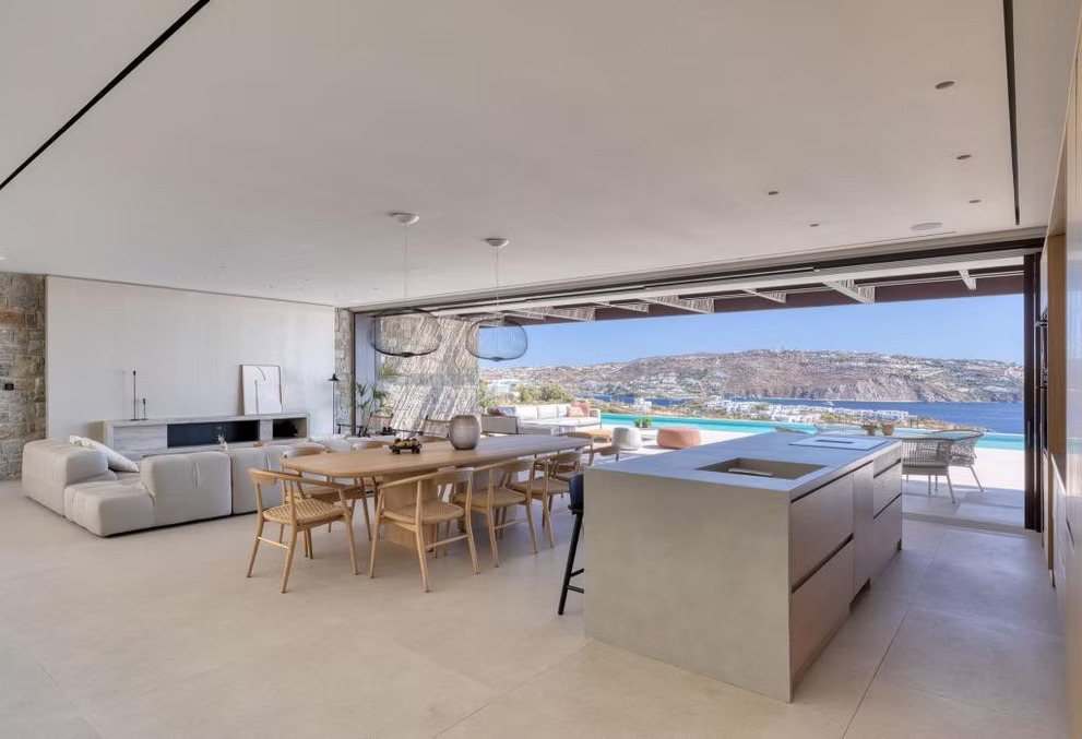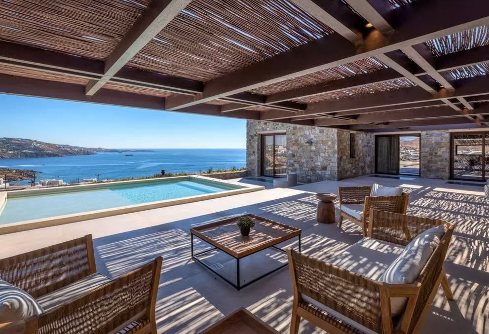 The villa is fully air-conditioned throughout, ensuring comfort during the Mykonos summer season.