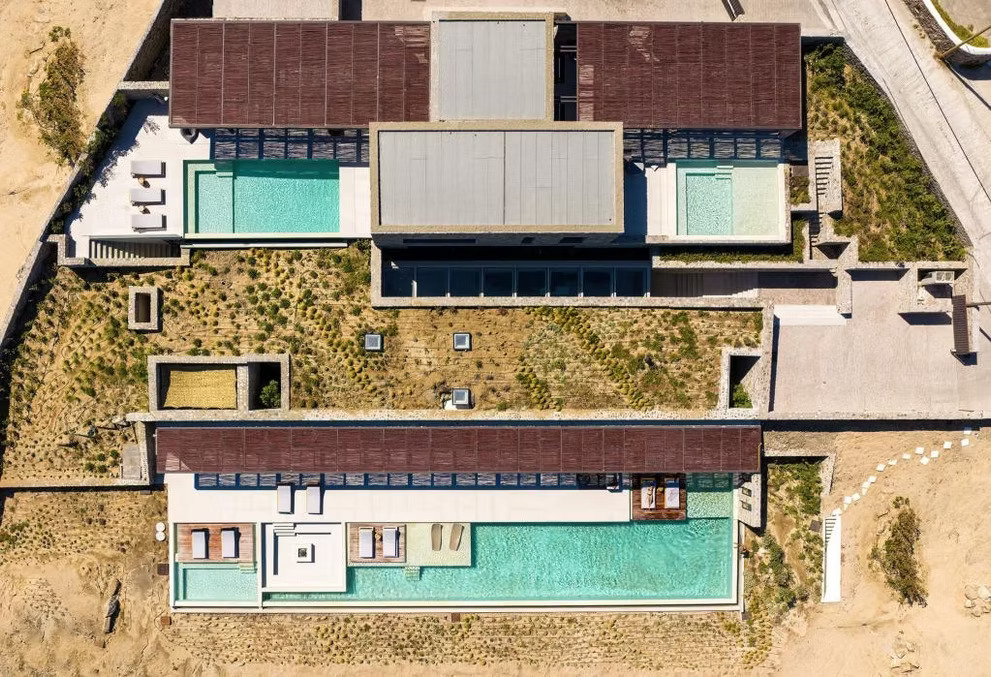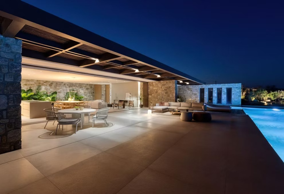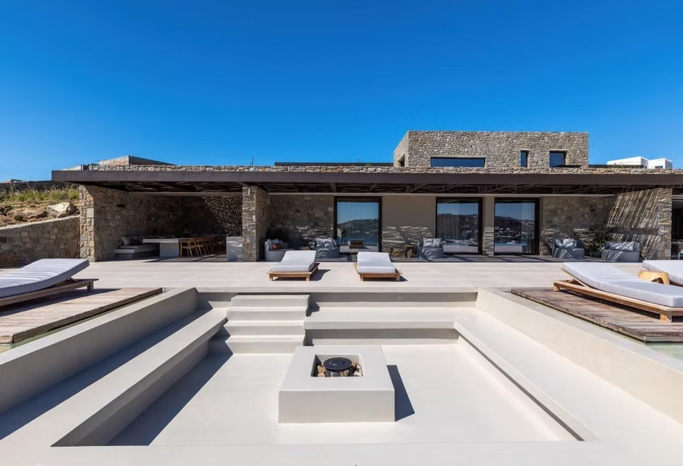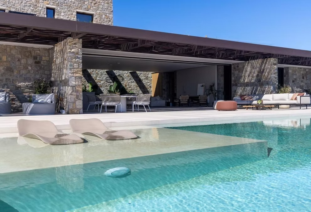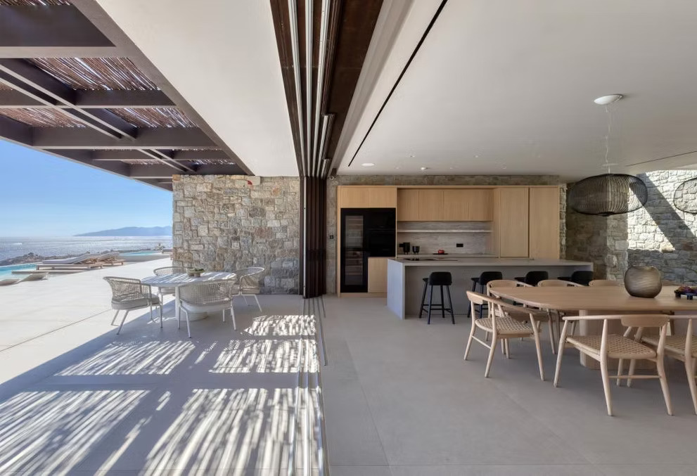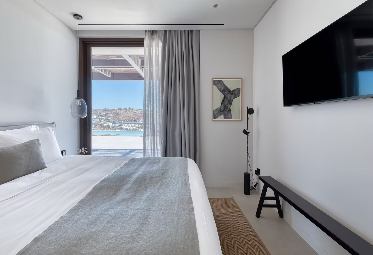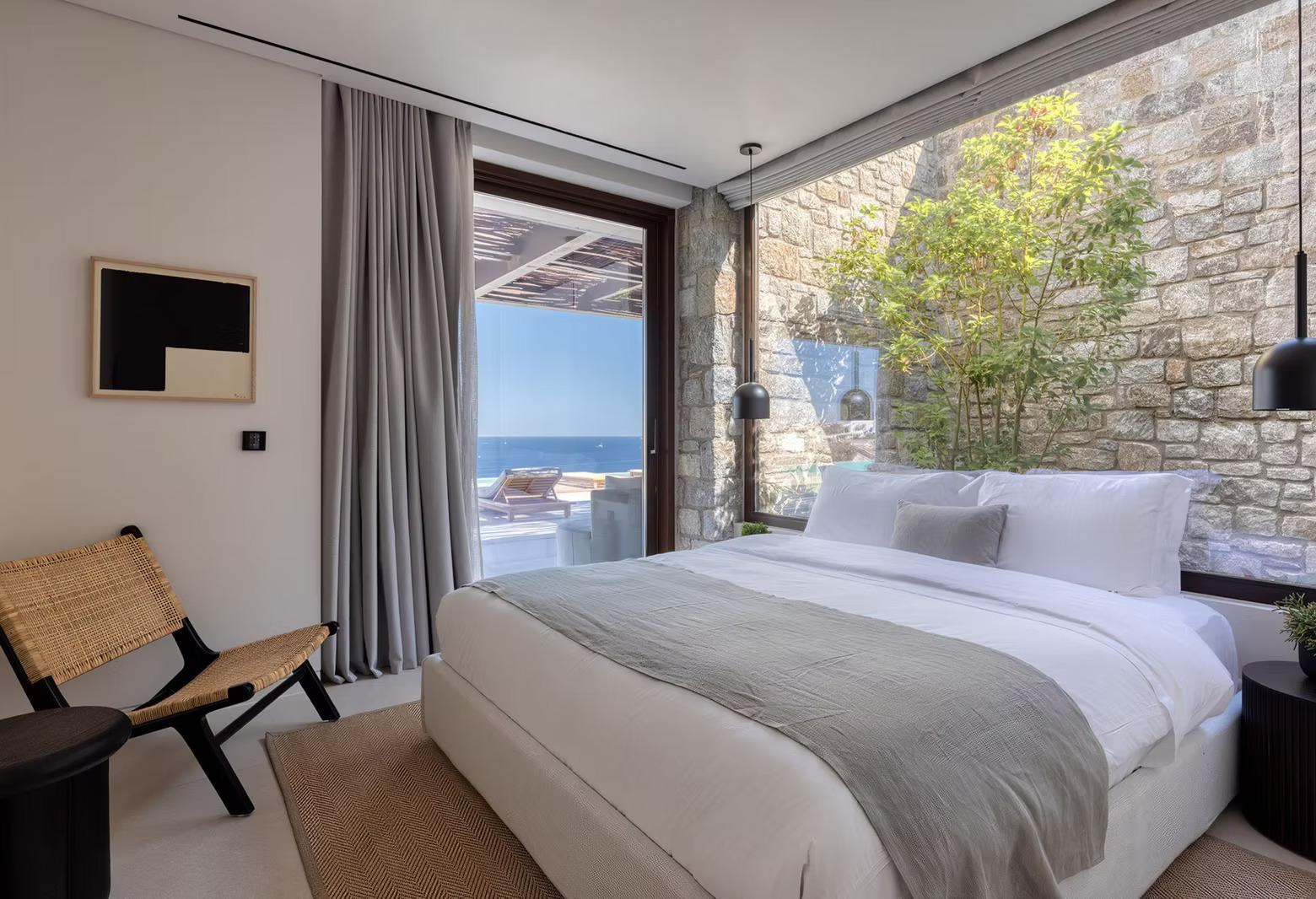 The villa is fully air-conditioned throughout, ensuring comfort during the Mykonos summer season.