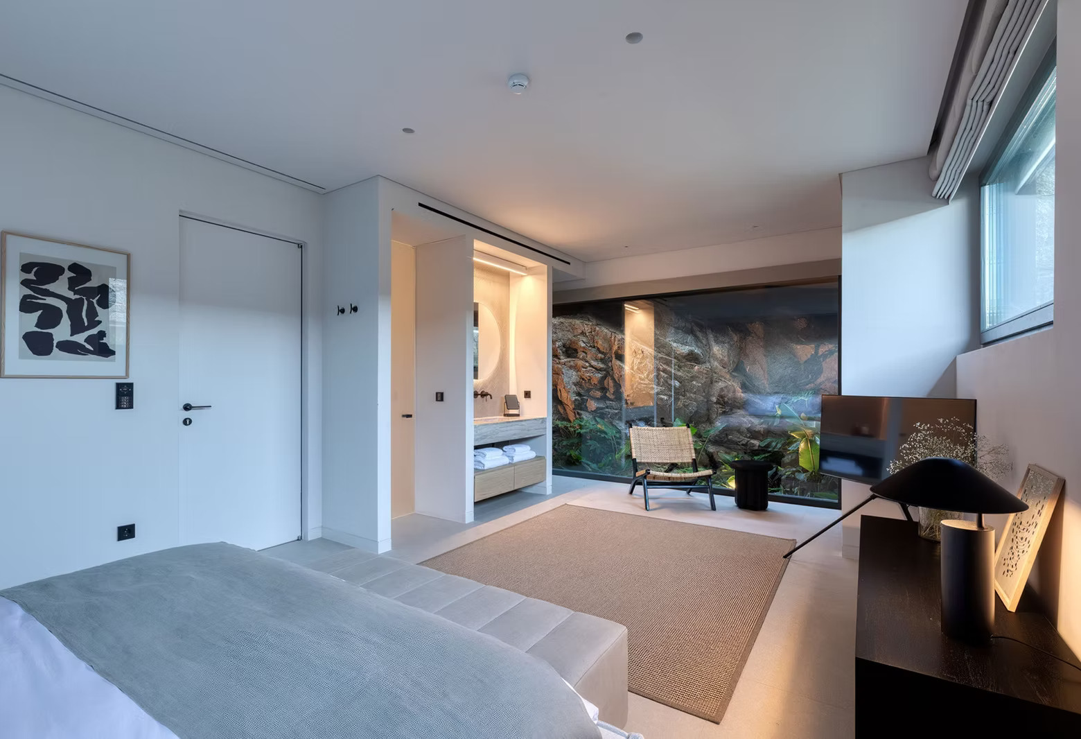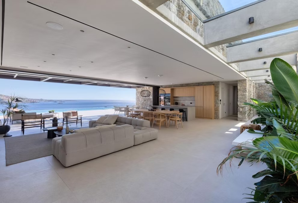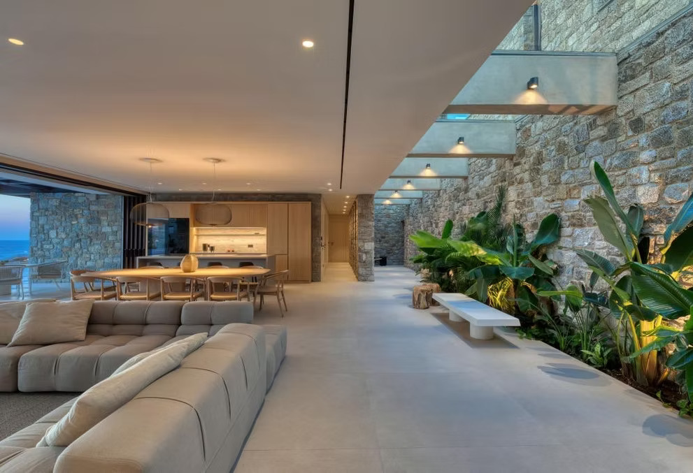 The villa is designed as a large private estate with multiple shared living areas, allowing guests to gather comfortably while maintaining a strong sense of space and privacy. Interiors are contemporary and refined, arranged to maximise sea and sunset views across the property.