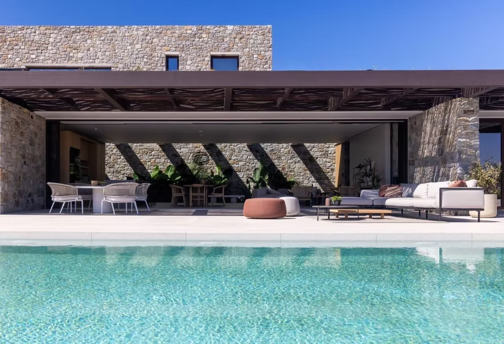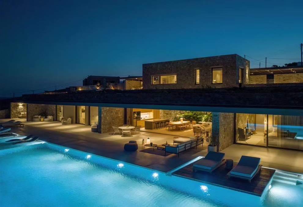 Positioned to capture sweeping sea and sunset views, the villa unfolds as a composition of clean lines, open terraces, and expansive glazing that draw the Aegean landscape into every space. Natural stone, soft neutral tones, and carefully curated interiors create an atmosphere that feels both elevated and deeply connected to its surroundings.