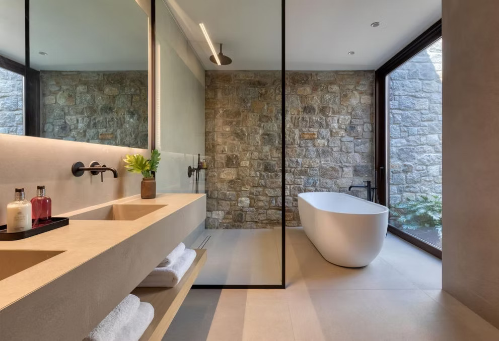 Bathrooms are proportionate to the number of bedrooms, with en-suite bathrooms serving the majority of sleeping areas. Additional outdoor shower and spa facilities support pool and jacuzzi use.