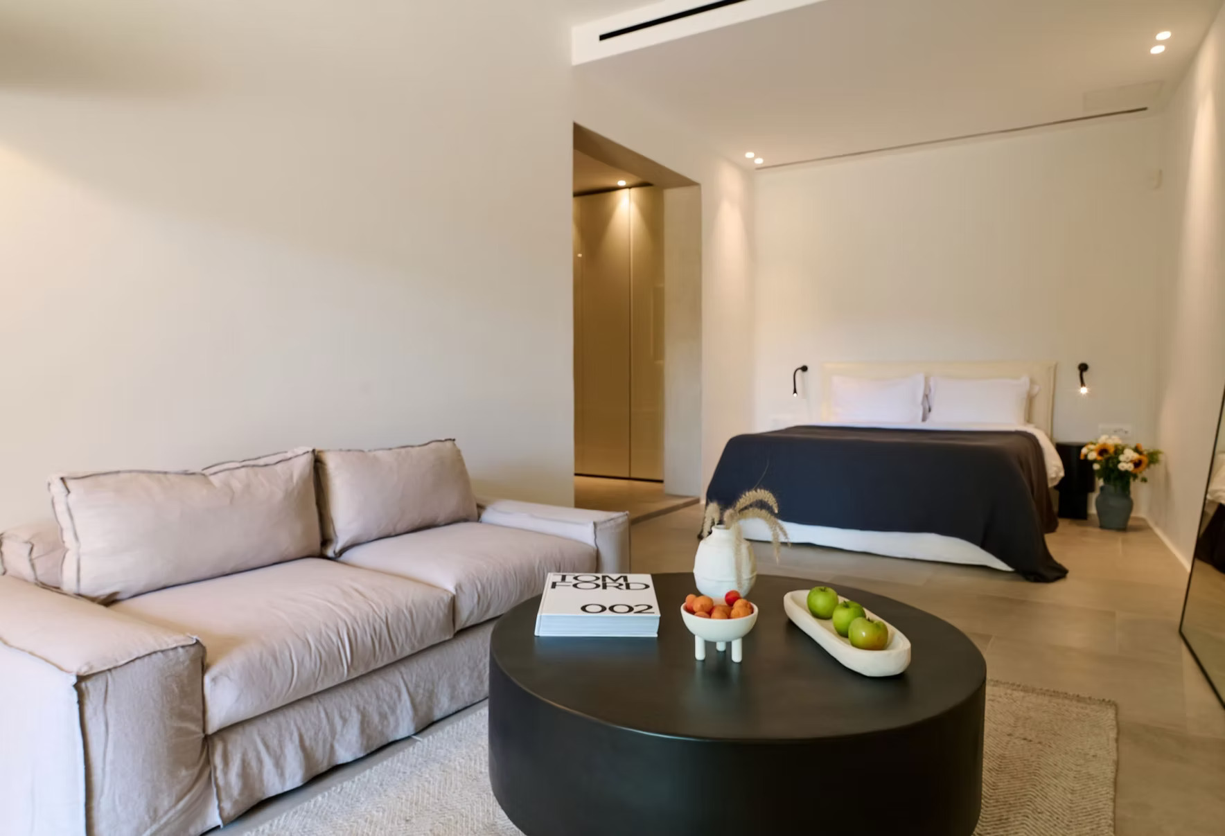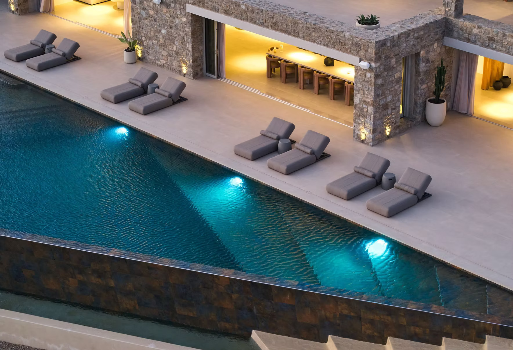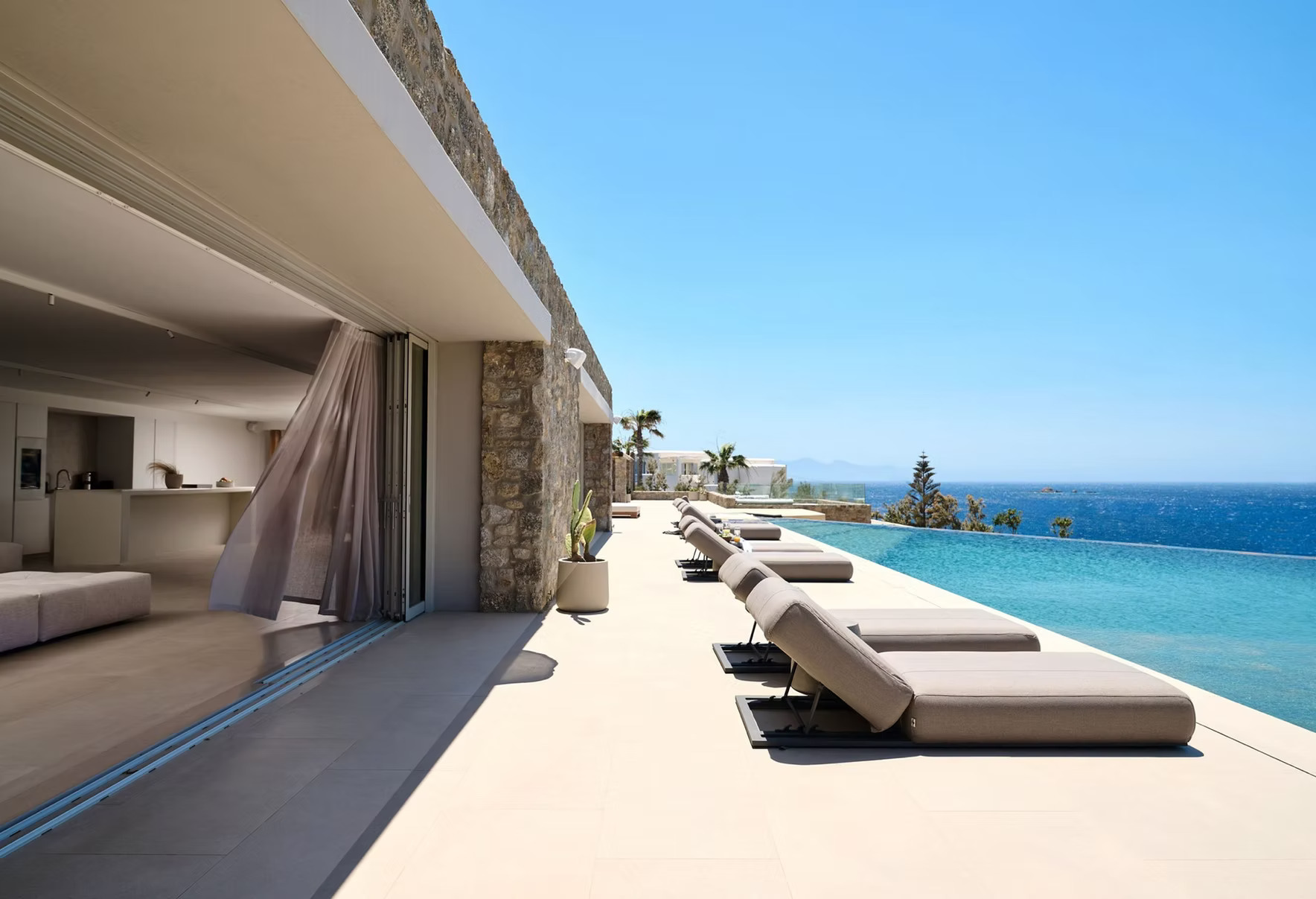 The villa features one expansive open-plan living area designed for seamless indoor–outdoor living. Lounge spaces open directly onto the terraces and pool deck, with uninterrupted sea views forming the backdrop to daily life and evening gatherings.