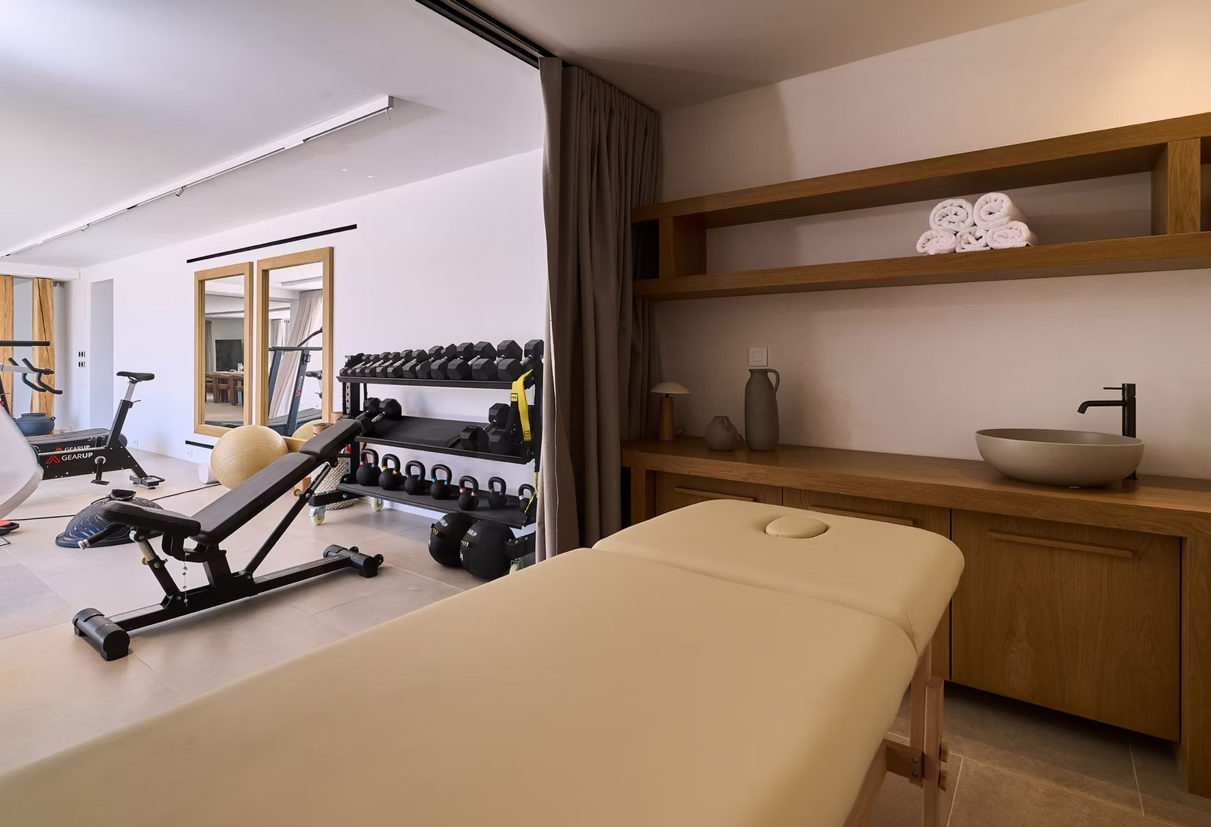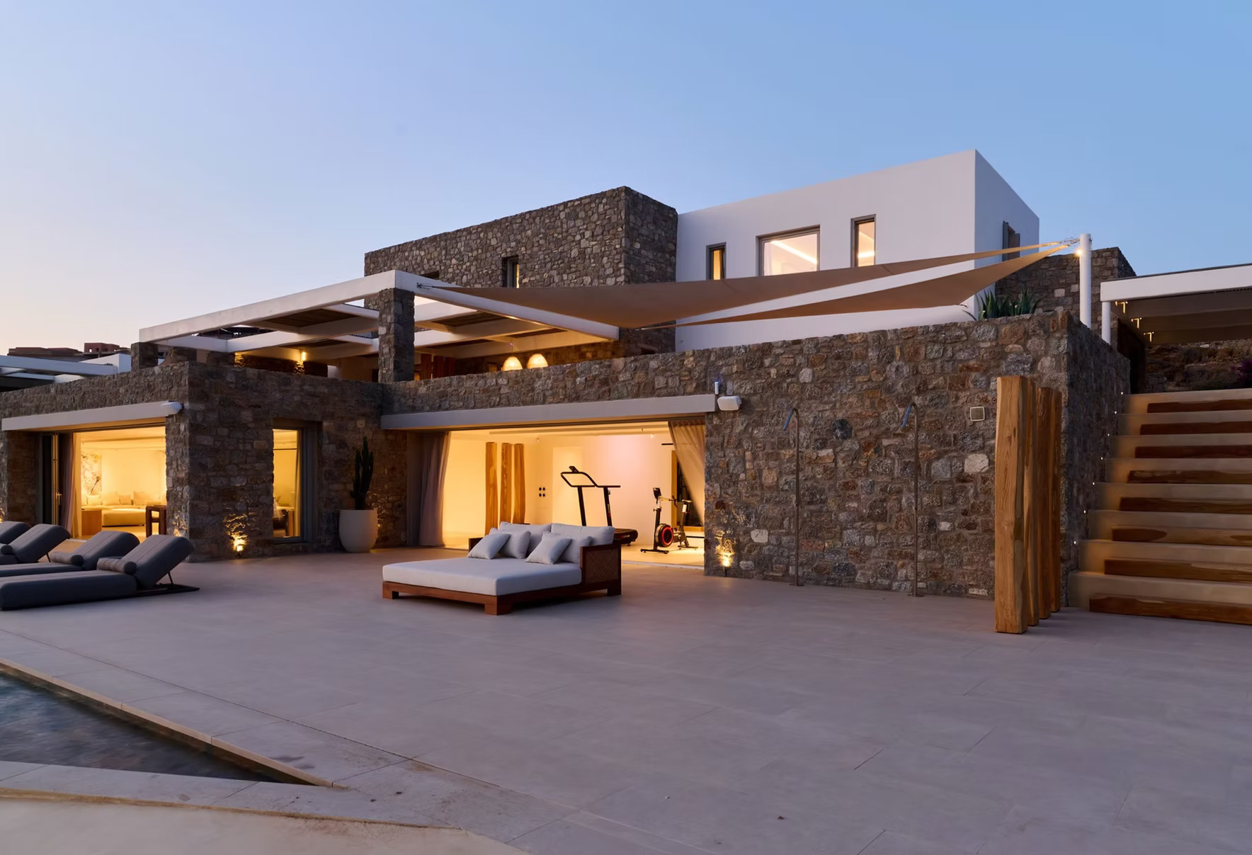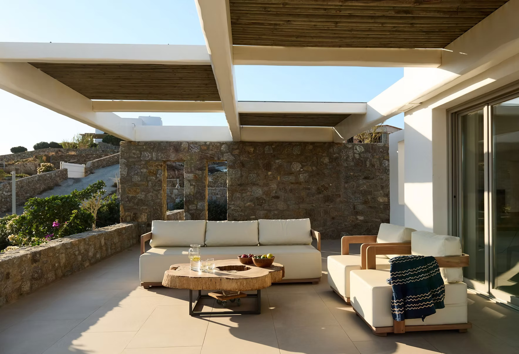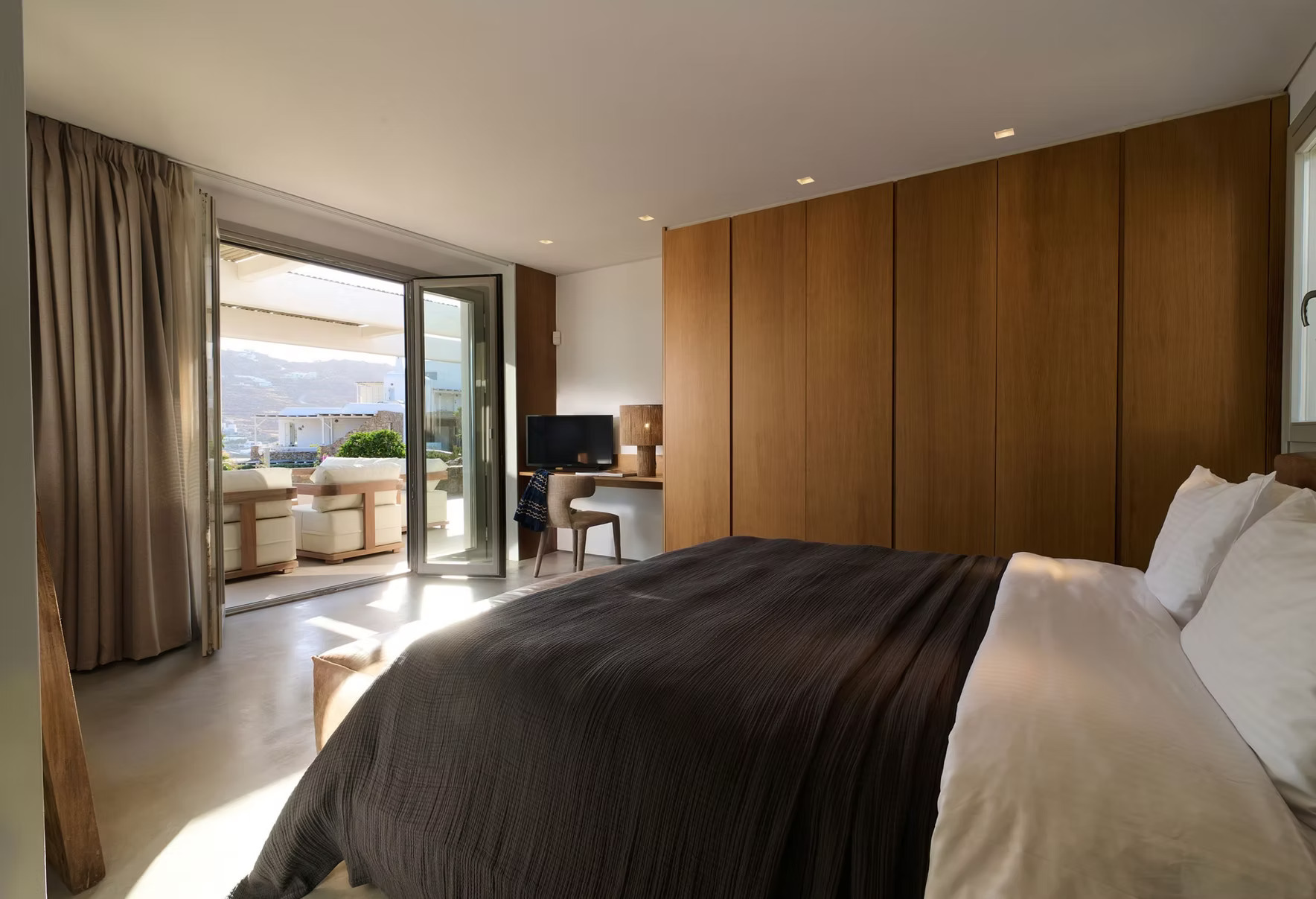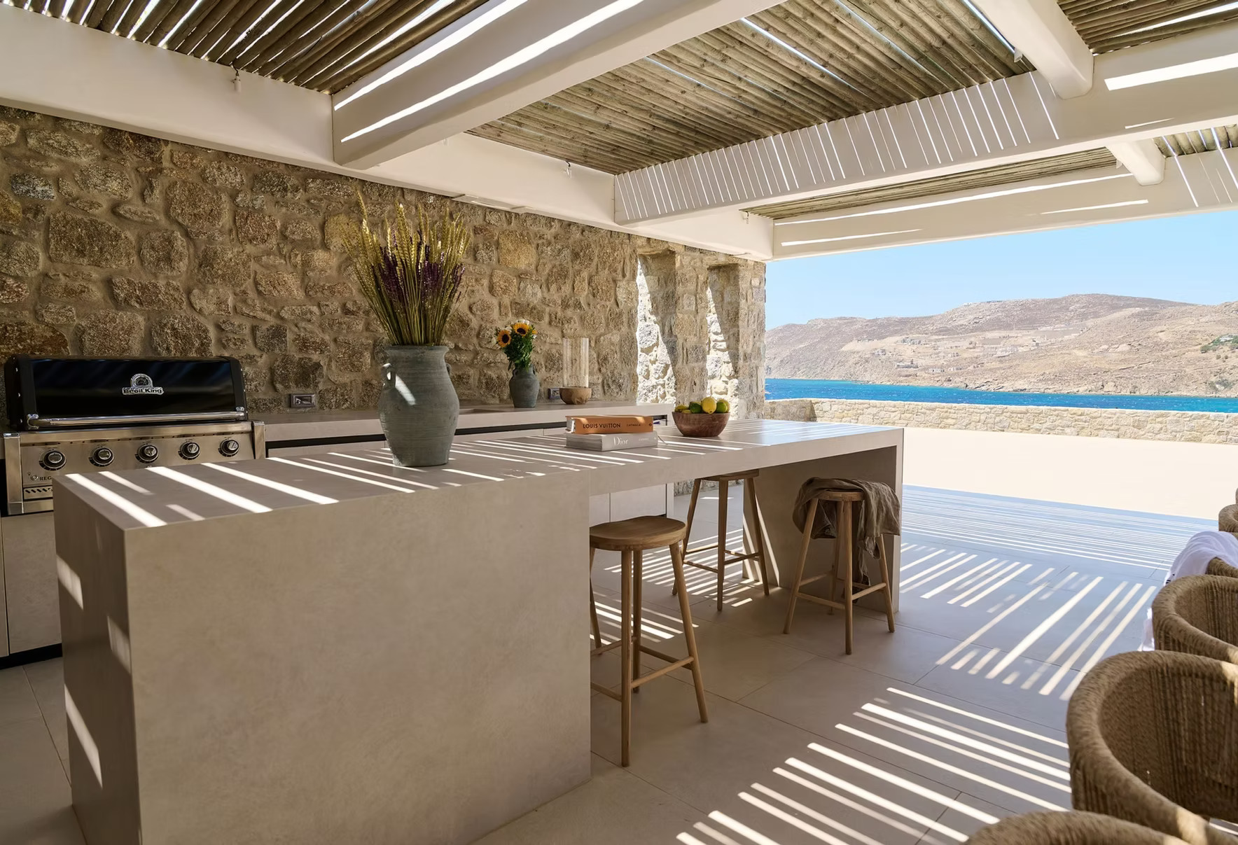 The villa is fully air-conditioned throughout, ensuring comfort during the Mykonos summer season.