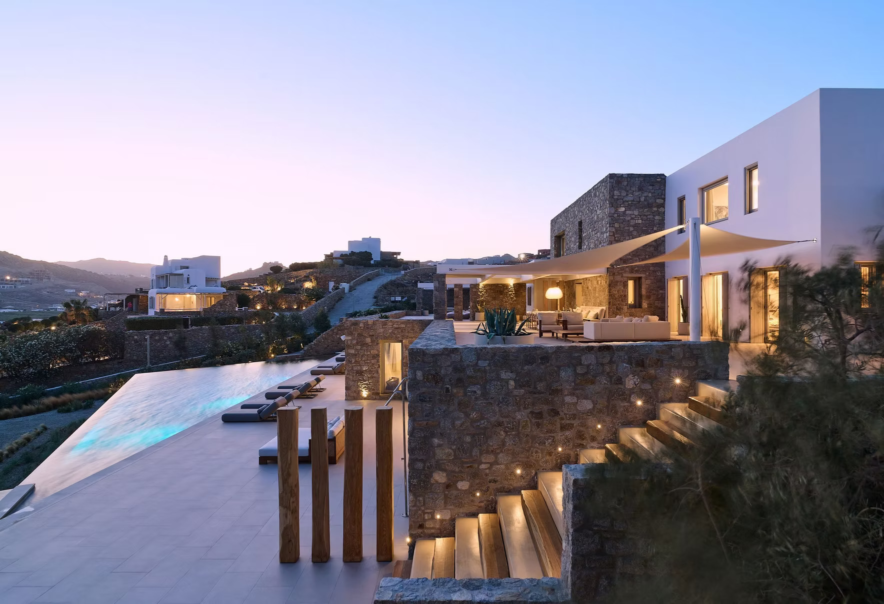 Outdoor amenities include one private infinity swimming pool, expansive sun terraces with loungers, shaded lounge areas, and multiple sunset-facing seating zones. The outdoor layout is designed for relaxed daytime living and evening entertaining.