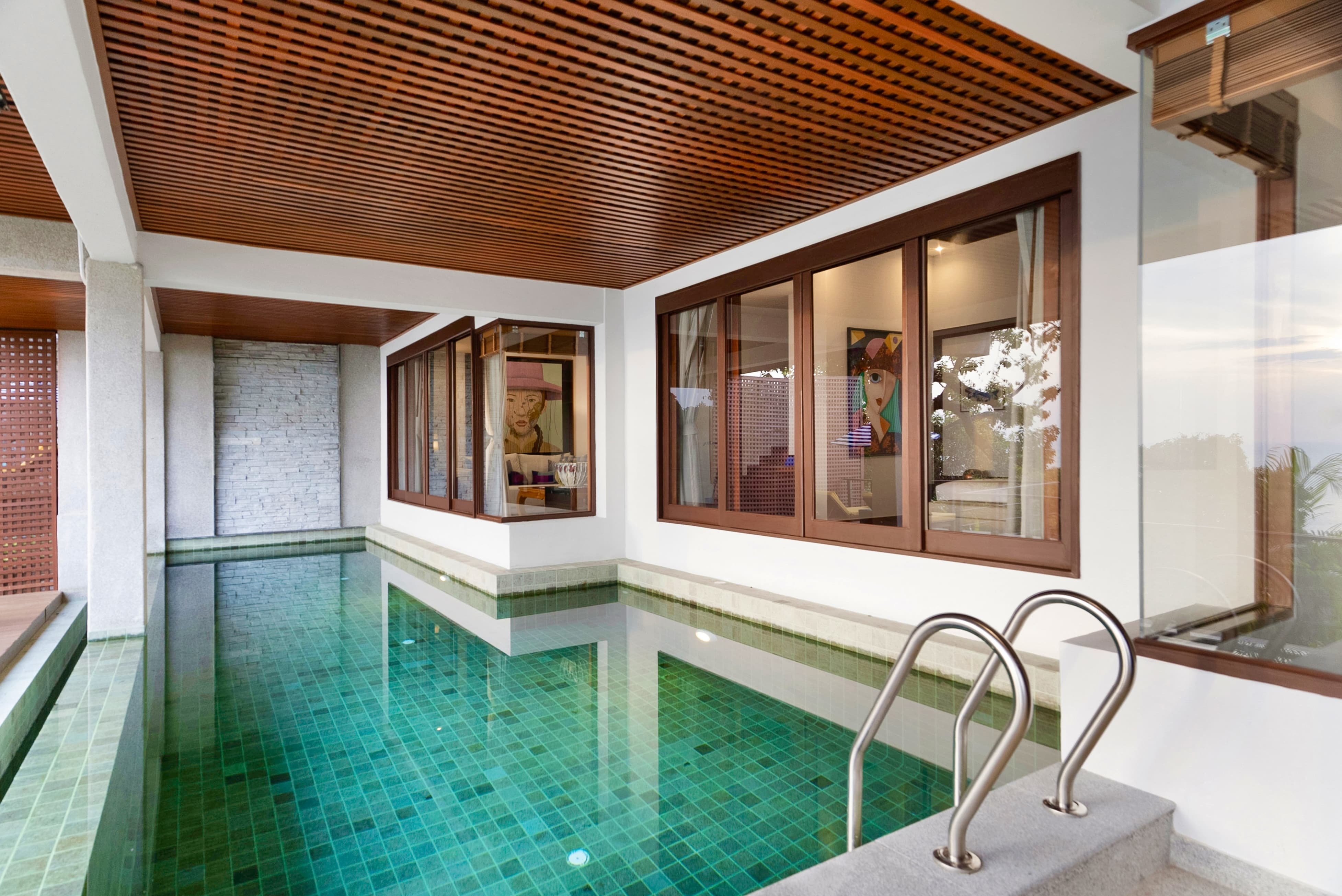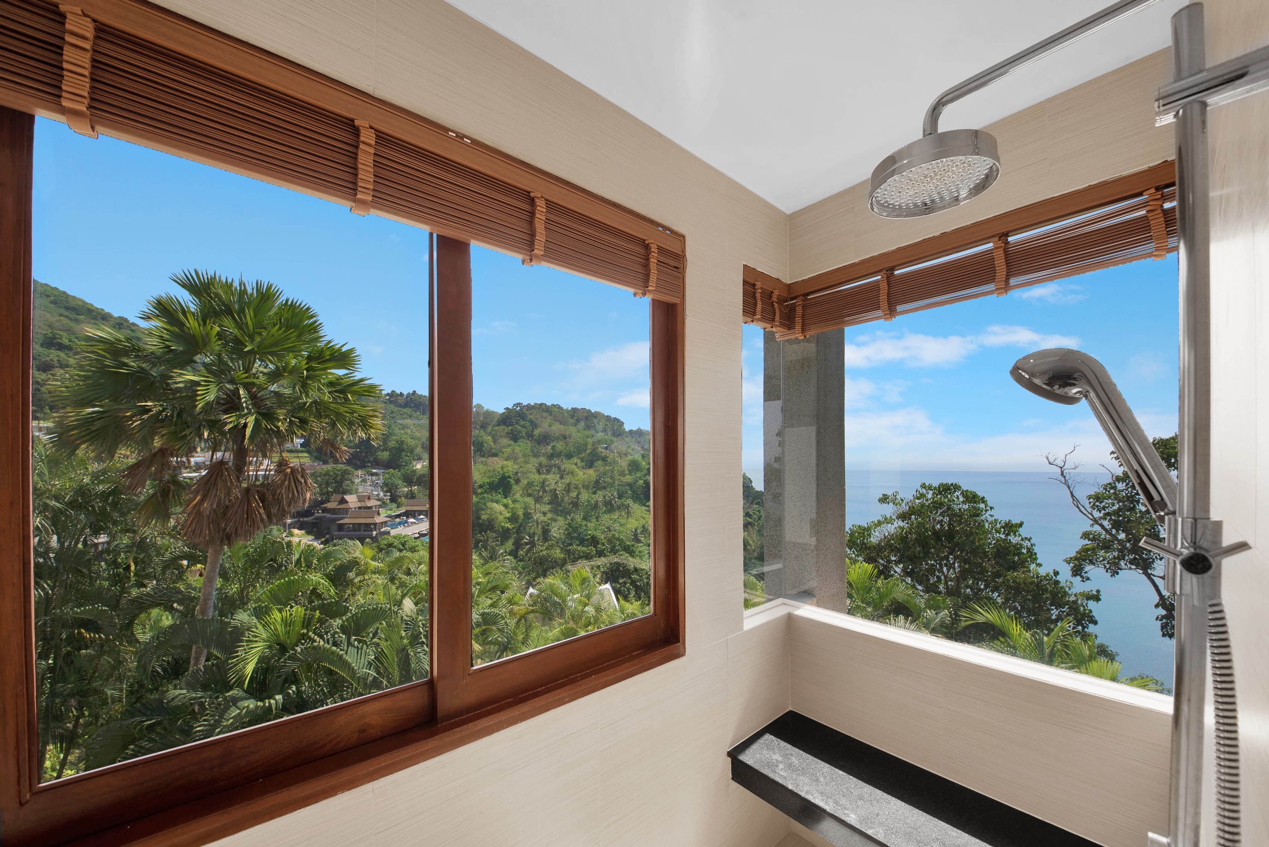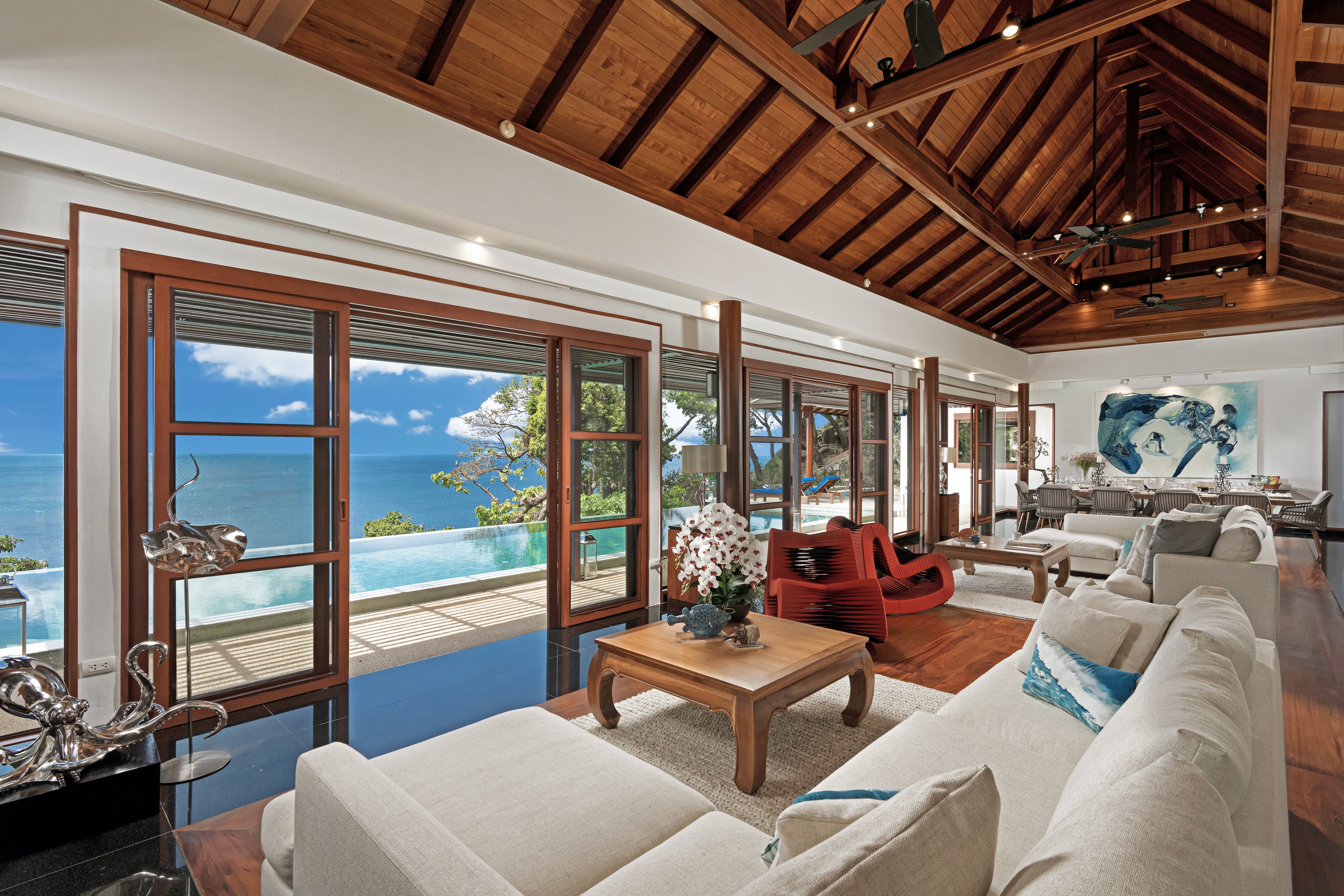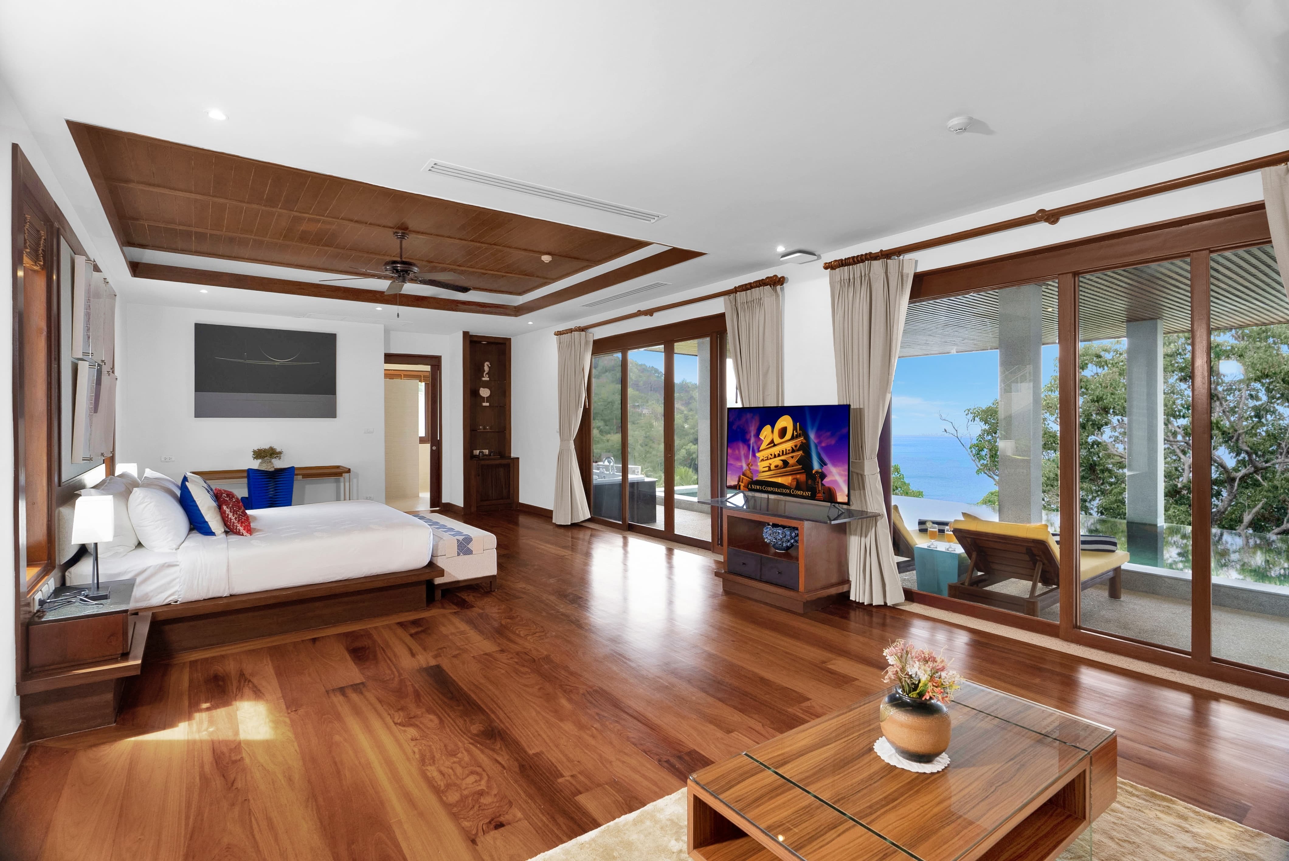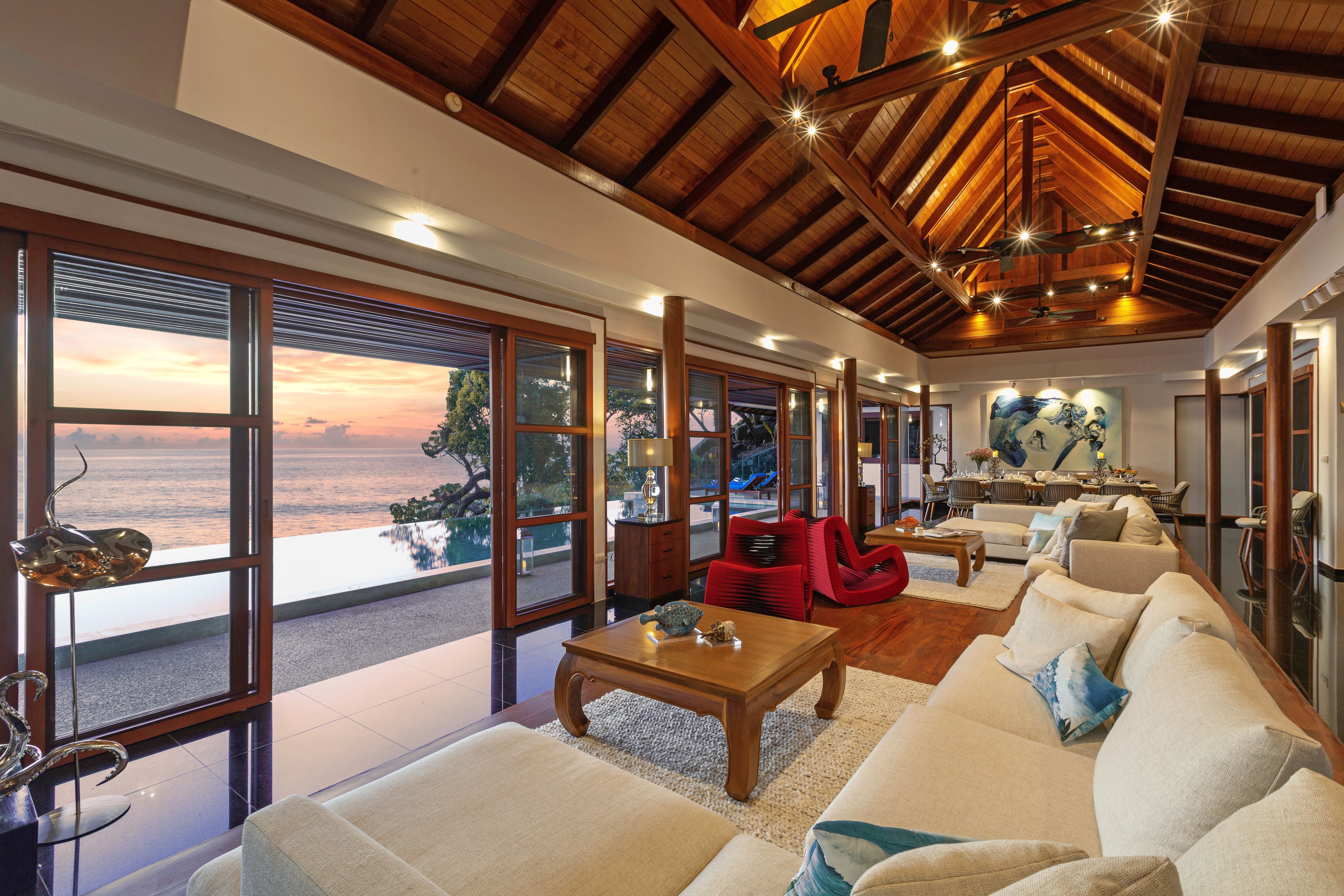 The villa is fully air-conditioned, maintaining comfort within Phuket’s tropical climate. Wide glass doors allow natural ventilation and ocean breezes to flow through the living areas when preferred, creating a balanced and refreshing atmosphere.