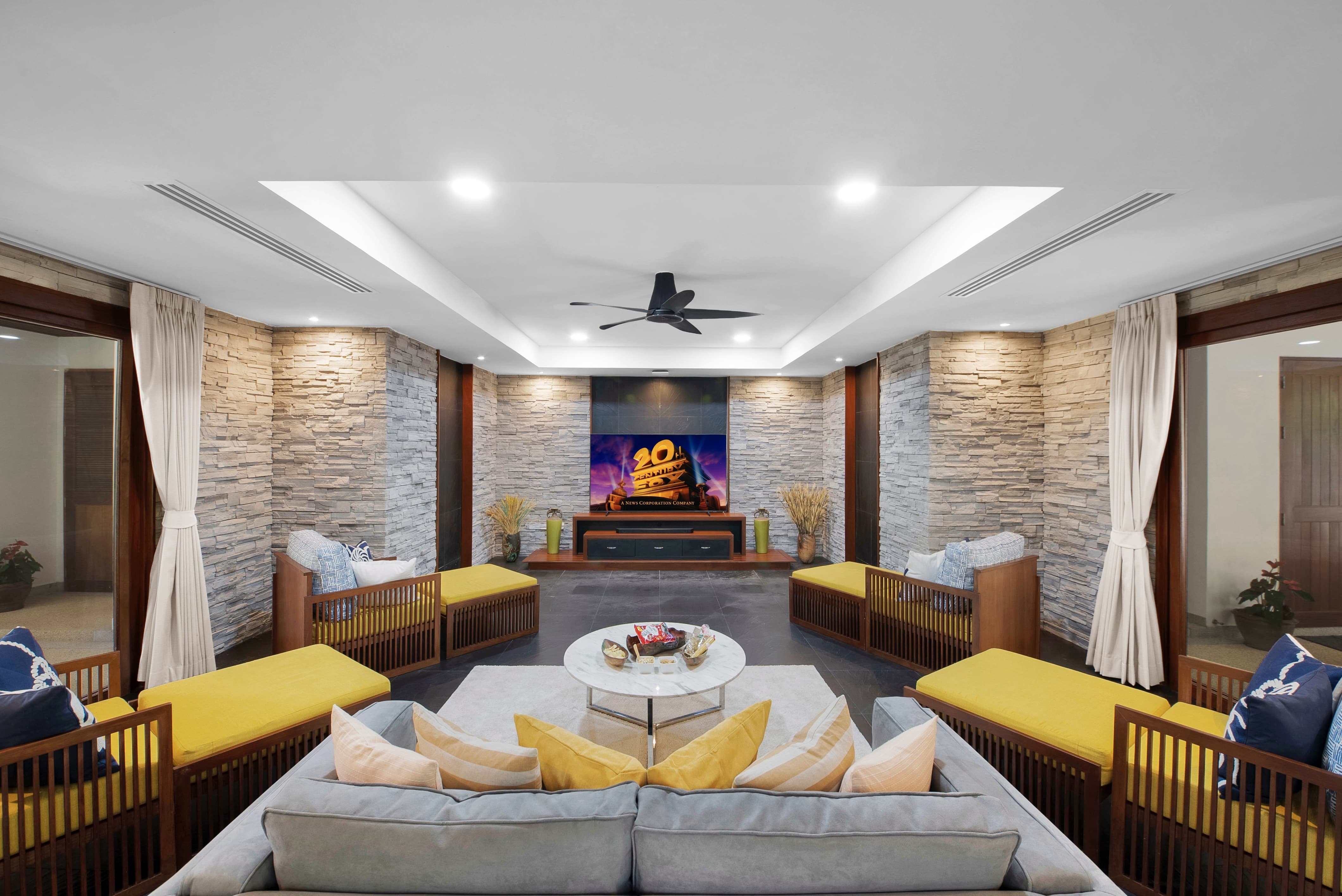 Leisure is woven seamlessly into the villa’s design. The 16-metre infinity pool anchors the terrace, appearing to merge with the horizon beyond. Several bedrooms feature private indoor plunge pools, adding another dimension to relaxation. Indoors, the dedicated media room offers a cinema-style experience with a large smart television and karaoke system, ideal for film nights and lively gatherings. A pool table and sound system in the common areas ensure social spaces remain dynamic and engaging. Guests may also access the estate’s pickleball court and make use of the gym and yoga room for daily activity.