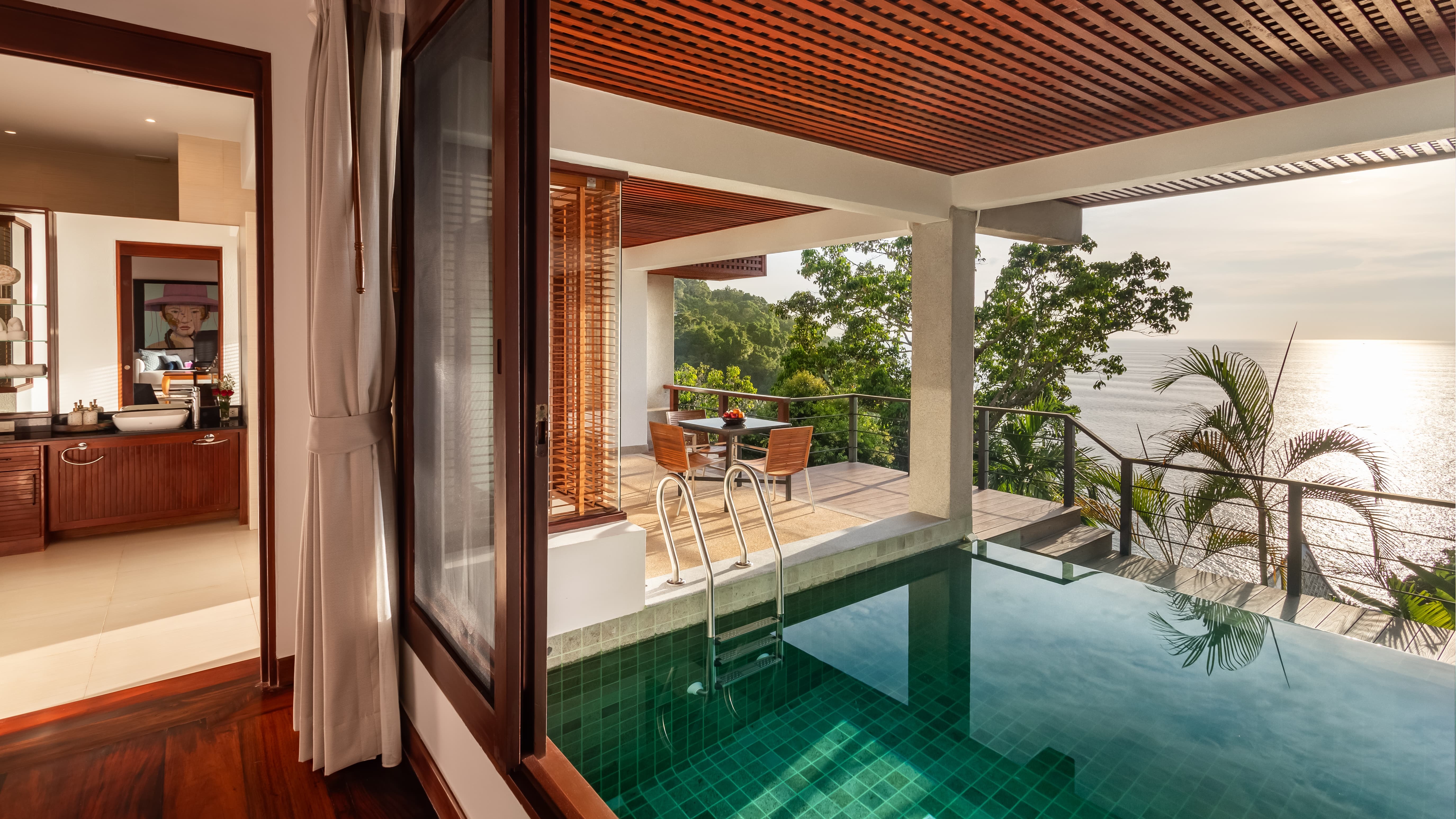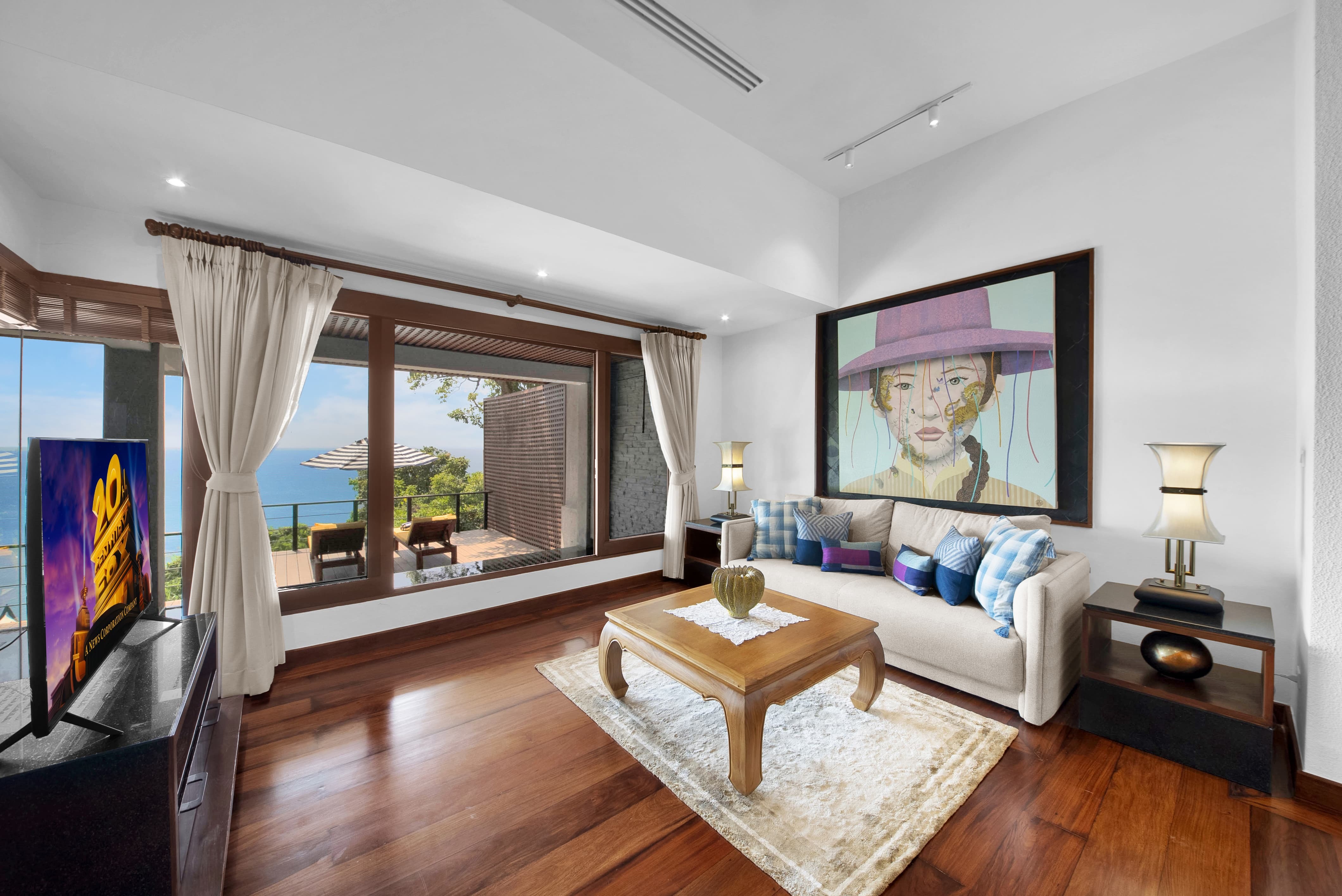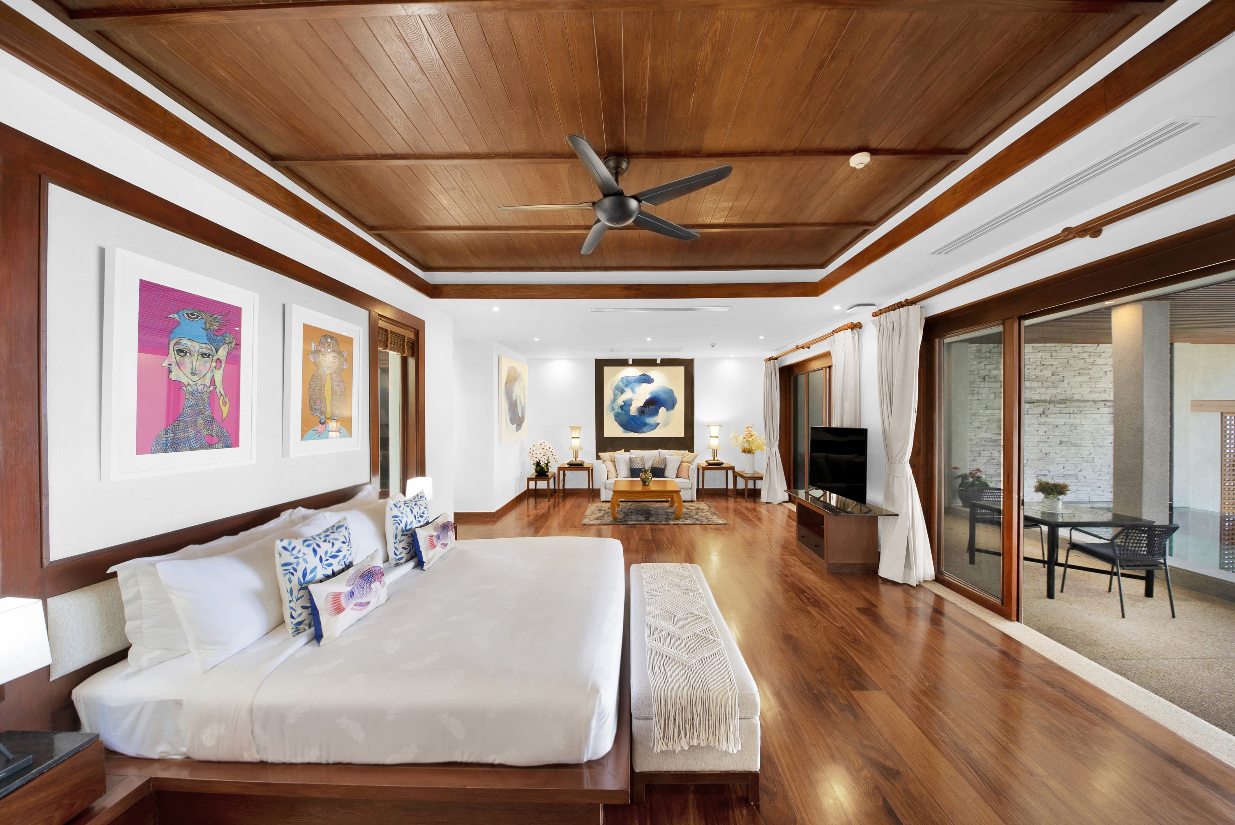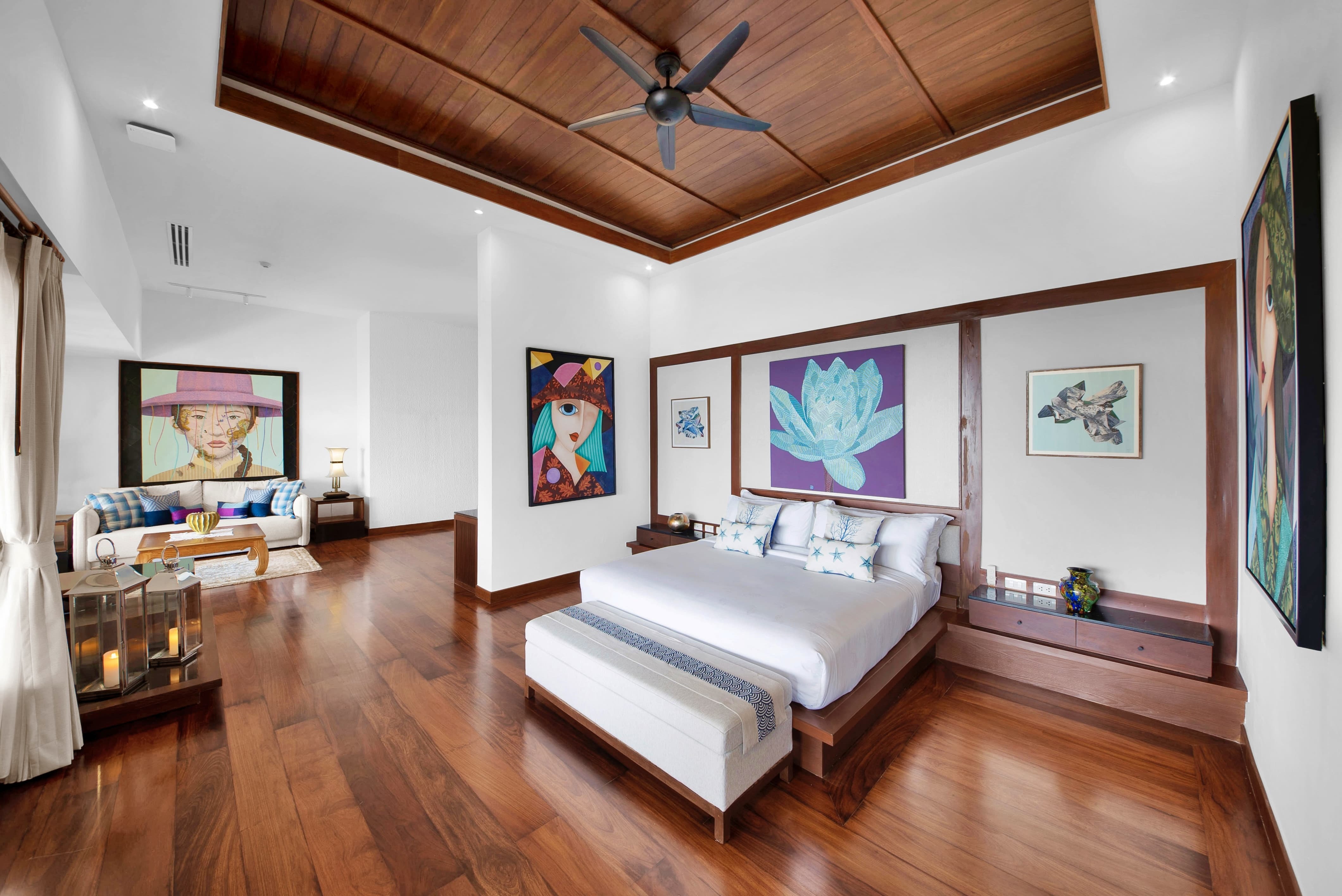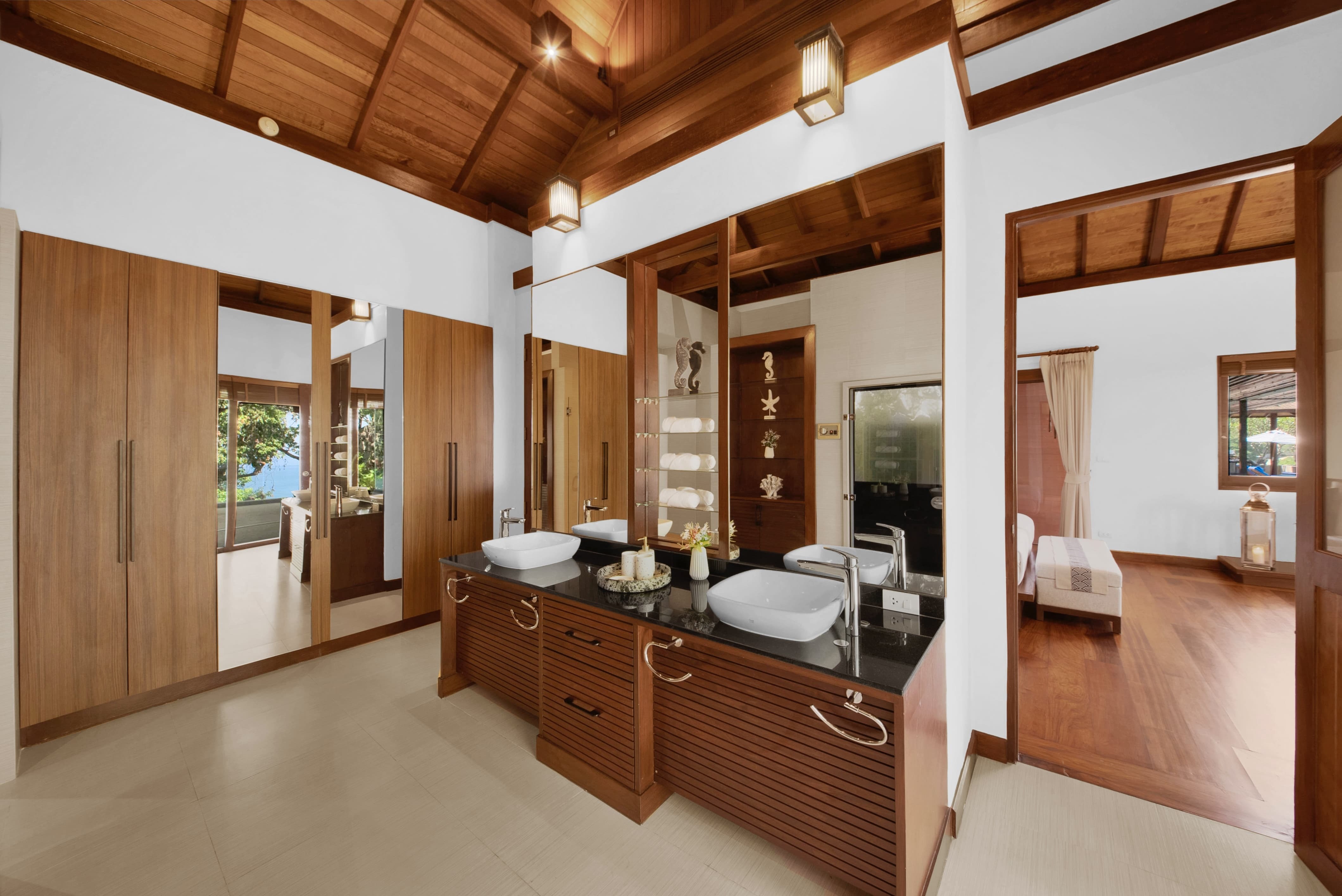 Villa Varya unfolds across two thoughtfully designed levels, where elevated positioning and open architecture create a constant dialogue with the Andaman Sea. The principal living area is warm and refined, framed by wide openings that allow light, breeze and ocean colour to shape the mood of the space throughout the day. The layout flows effortlessly between lounge, dining and terrace, encouraging both social connection and quiet retreat. Contemporary furnishings are complemented by curated artistic accents, creating an atmosphere that feels elegant yet genuinely inviting. From morning coffee to evening cocktails, the living spaces are designed to feel intimate without sacrificing scale.