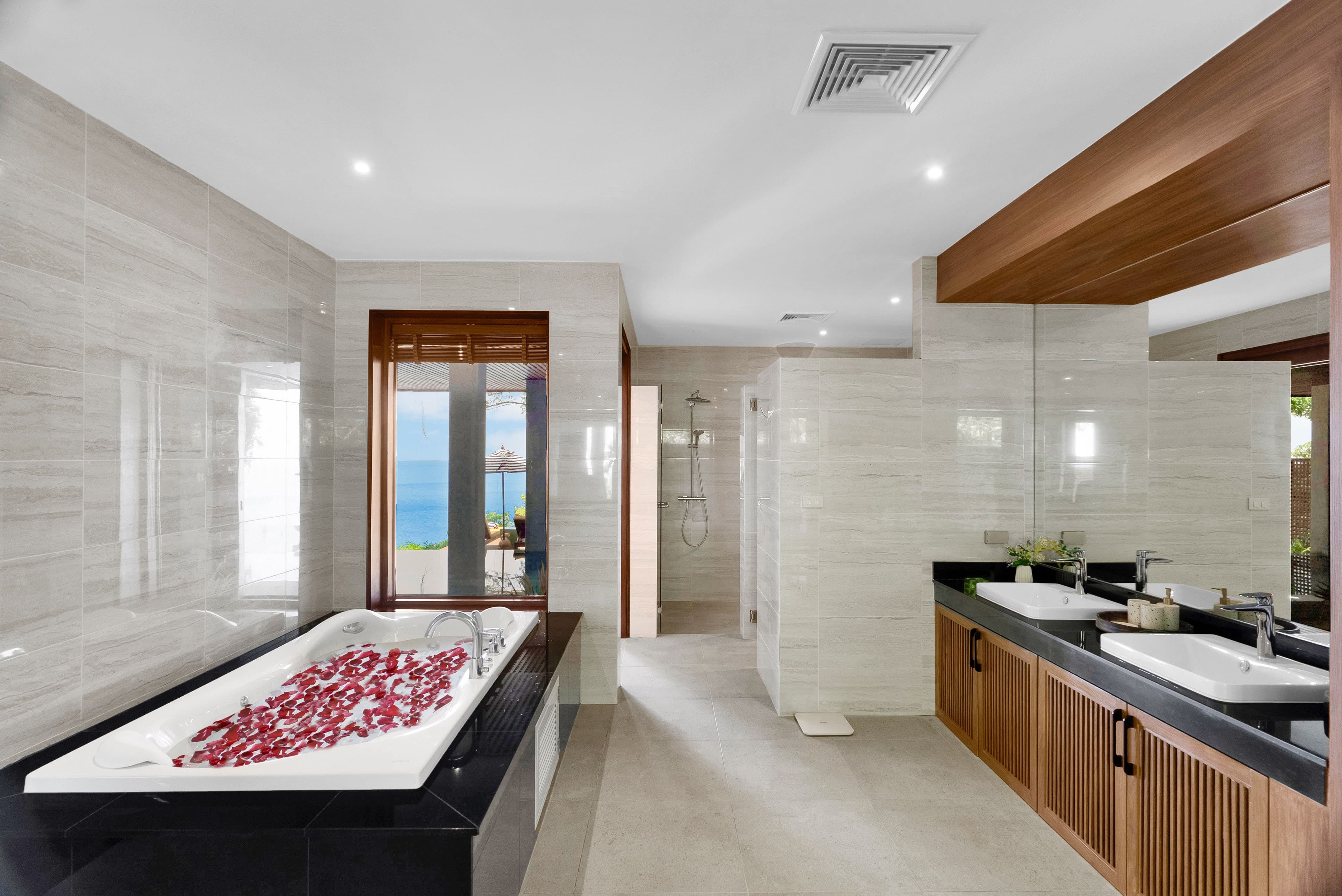 Villa Varya offers five ensuite bathrooms complemented by two additional bathrooms, ensuring comfort and convenience across the residence. Each bedroom benefits from a jacuzzi bathtub, while the master suite also features a private steam room for deeper relaxation. Contemporary fittings, thoughtful lighting and natural textures create spa-like spaces that feel calm, spacious and indulgent.
